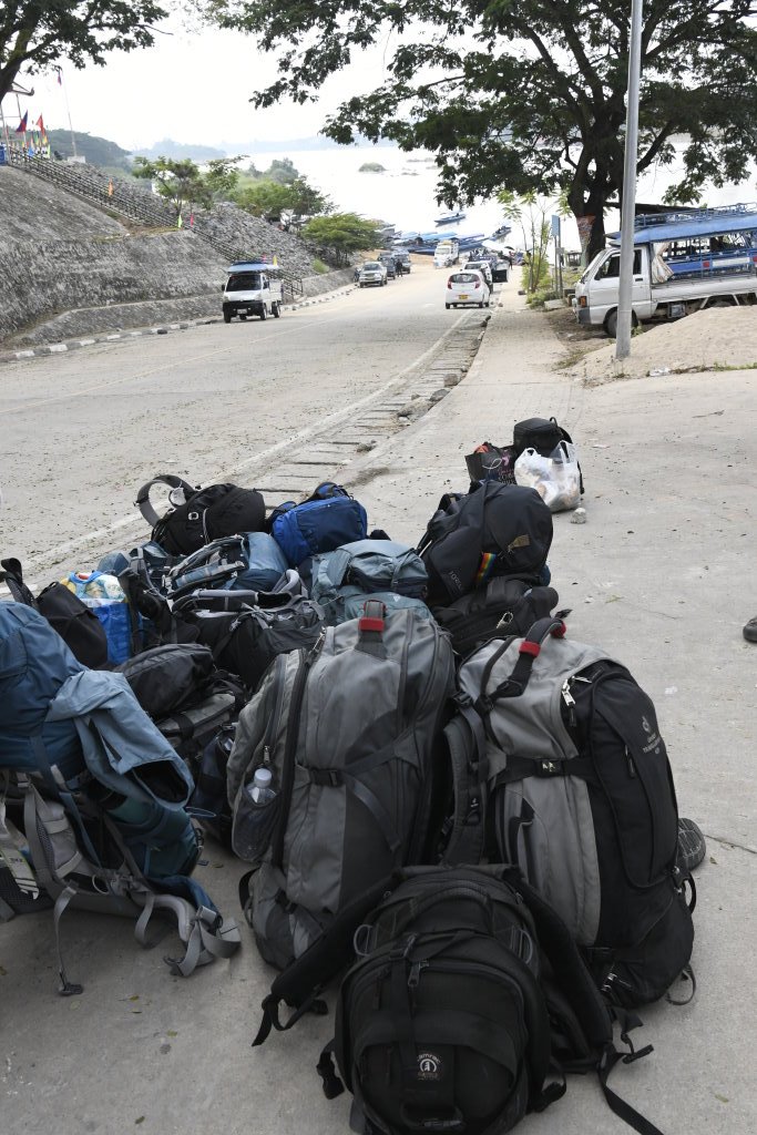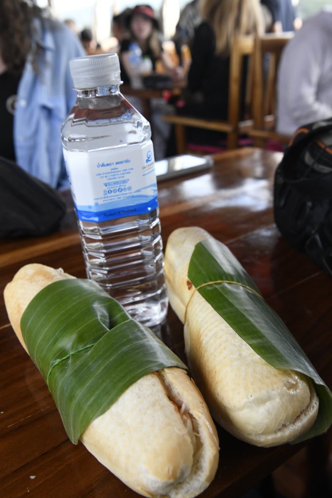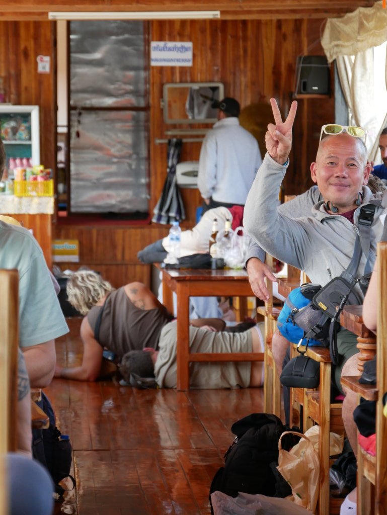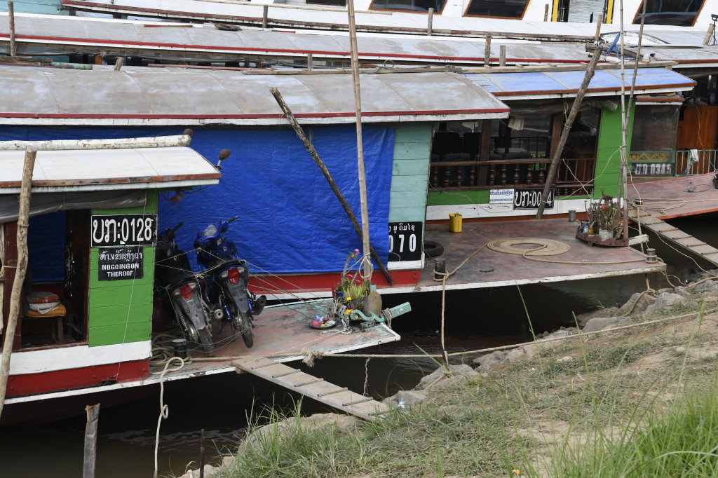 Wie schon bei der ersten gemeinsamen Reise 2010 haben wir ein Slowboat gebucht, um in zwei Etappen nach Luang Prabang zu kommen. Abfahrt ist erst, wenn alle Plätze belegt sind, so scheint es zumindest, weil am Pier zunächst die im Fahrpreis inbegriffenen Baguettes für alle präpariert werden müssen – wahlweise Süd mit Nutella, Erdnussbutter oder herzhaft mit Huhn oder Käse gefüllt.