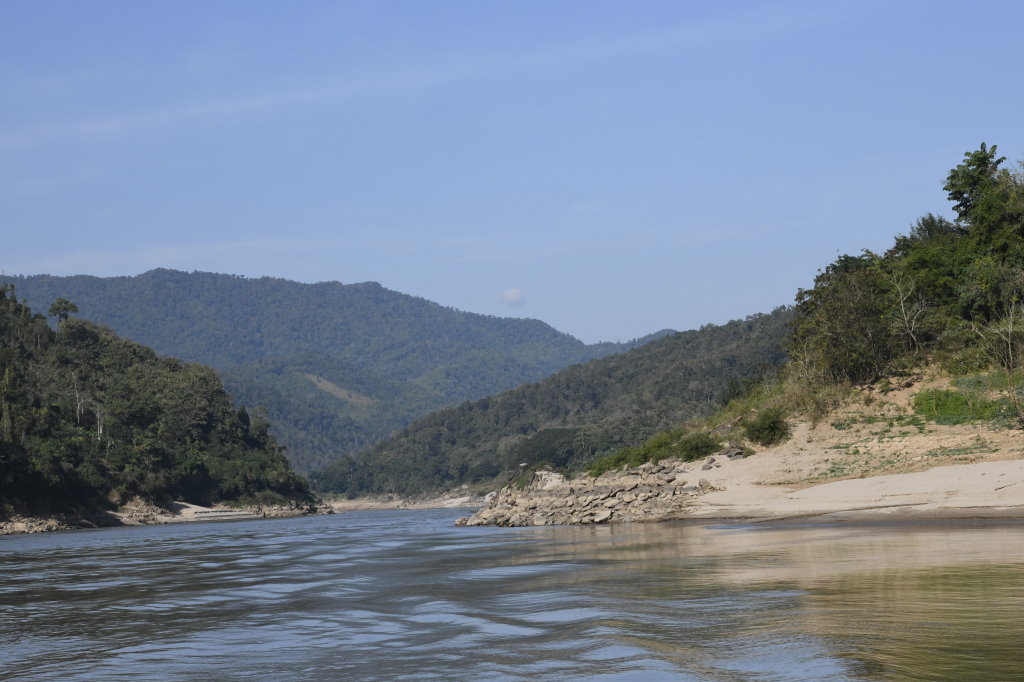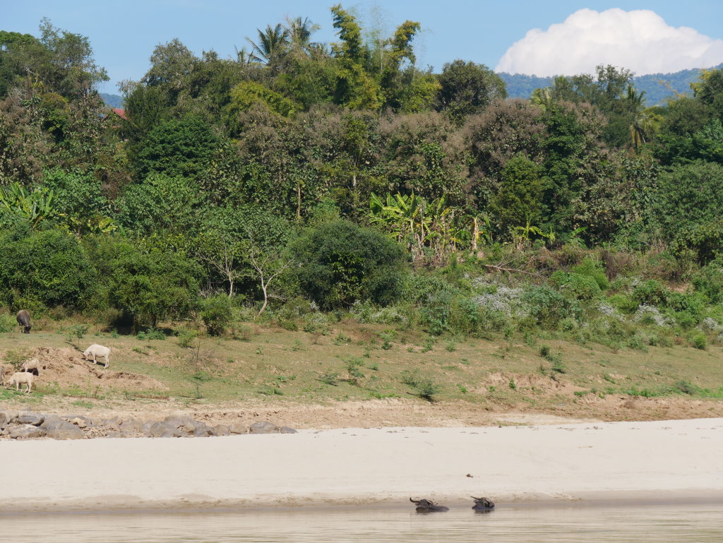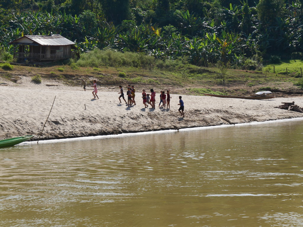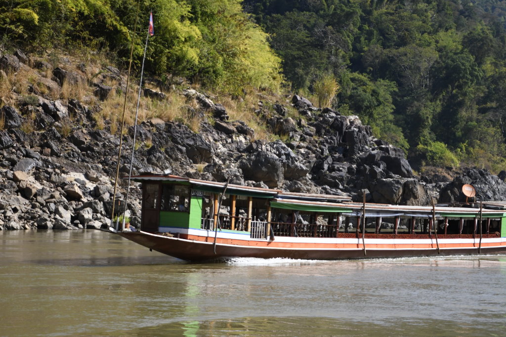 Ratta-dong, ratta-dong, ratta-dattata-dattata-dong, ratta-dong… Gemächlich gleitet das Slowboat den Mekong hinunter. Dichter Dschungel bedeckt die Berge an beiden Seiten. Gelegentlich eine kleine Bananen-Plantage. Im sauberen, vom sandigen Sediment gefärbten Wasser schwimmen Plastikkanister, kein Müll, sie kennzeichnen Untiefen und gefährliche Stromschnellen, geben Sicherheit…