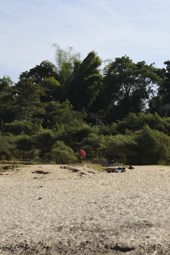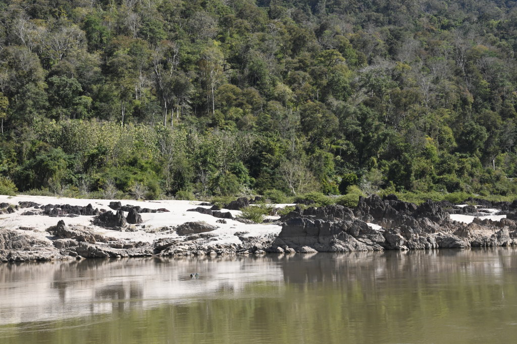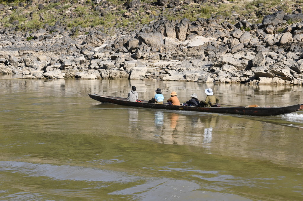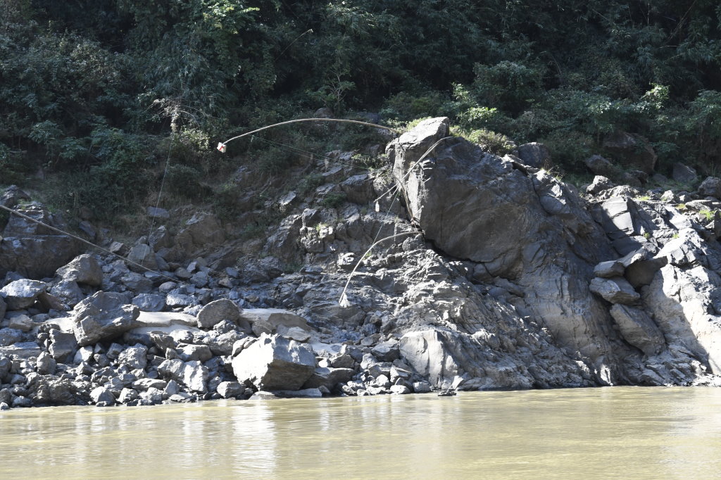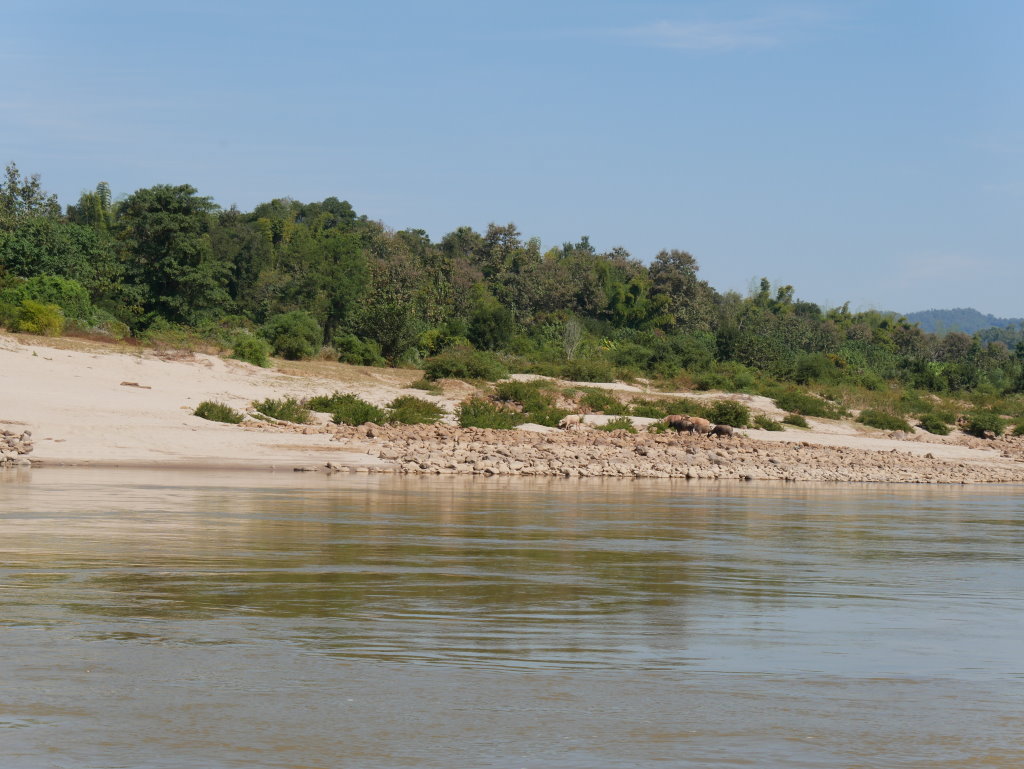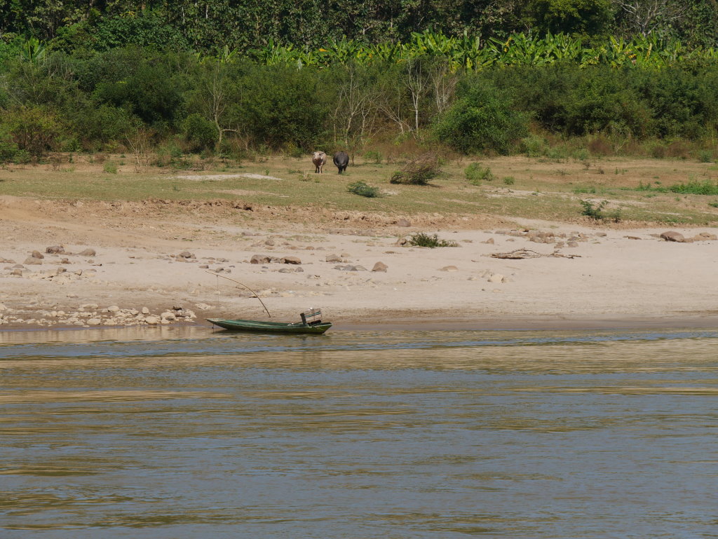 Die Felsbrocken im Fluss glänzen in der Morgensonne. Manche erinnern an ein dösendes Krokodil, links am Ufer mag es eine schuppige Ratte beim Trinken sein und hinter der nächsten Kehre lauert ein gewaltiger Flussdrache im Wasser. Zwischendrin haben Fischer ihre Netze an langen Bambusstangen aufgespannt. Links am Ufer stapfen drei Wasserbüffel vorsichtig durch den Sand zum Wasser.