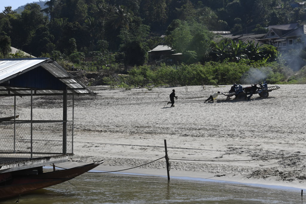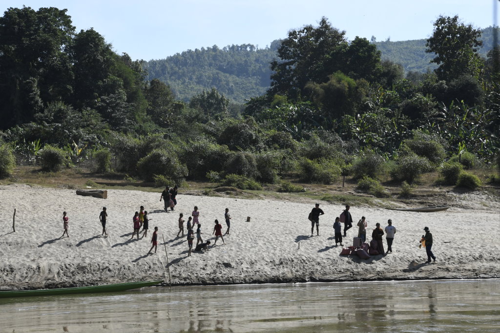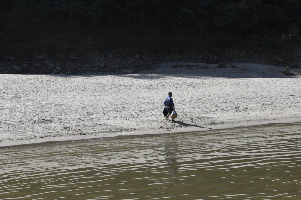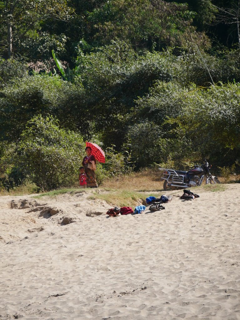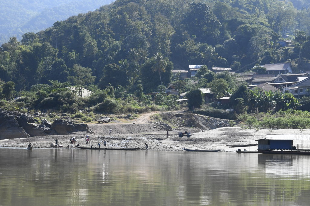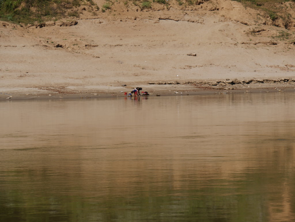 Kaum sind zwei Stunden vergangen, nähert sich das Boot zum ersten Mal dem Ufer. Nein, der Mann mit dem Helm in Thasuang ist kein weiterer Passagier. Er liefert ein paar Pakete ab, die andernorts erwartet werden.