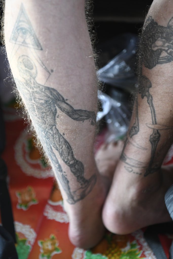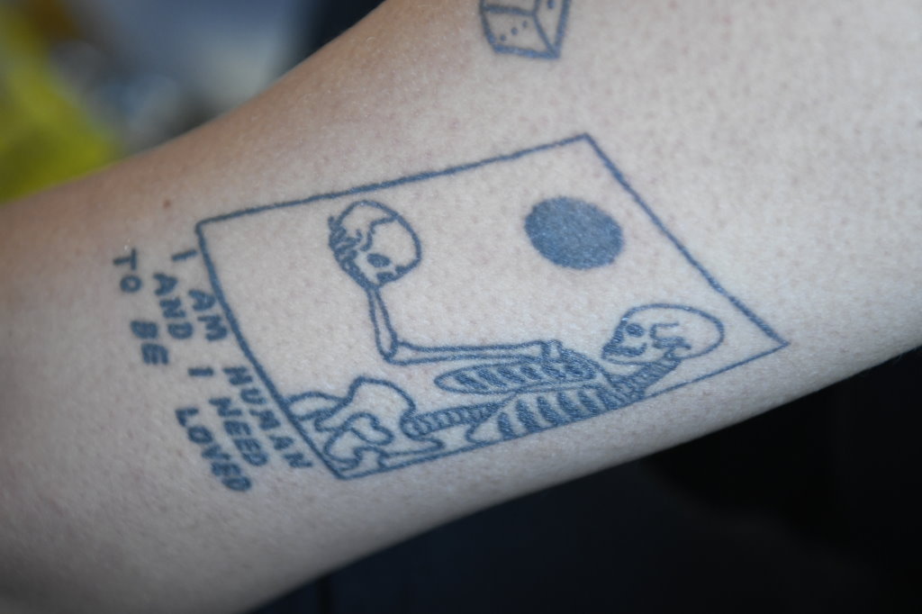 „Expectations?” Eintätowiert am Fuß des jungen Perlen-Ohrring-Trägers mit Goldkettchen, der vor mir am Boden hockt. Seinen Arm zieren das Gerippe eines Chamäleons, ein Rabe mit Wurm im Schnabel – ein Skorpion reckt seinen Stachel… Die Mädels sind vorsichtiger: „Nur dort, wo es maximal ein wenig kitzelt,“ fachsimpelt eine vielleicht 17jährige mit einem Skelett in Hamlet-Pose am Arm. Sein oder Nichtsein? Fehlanzeige: