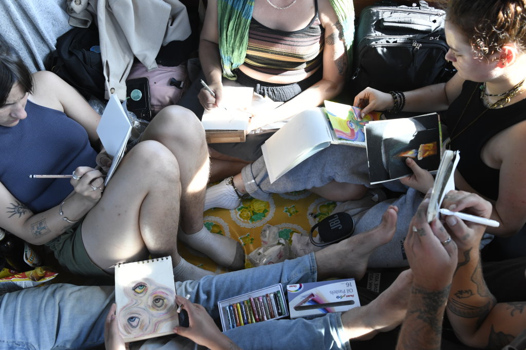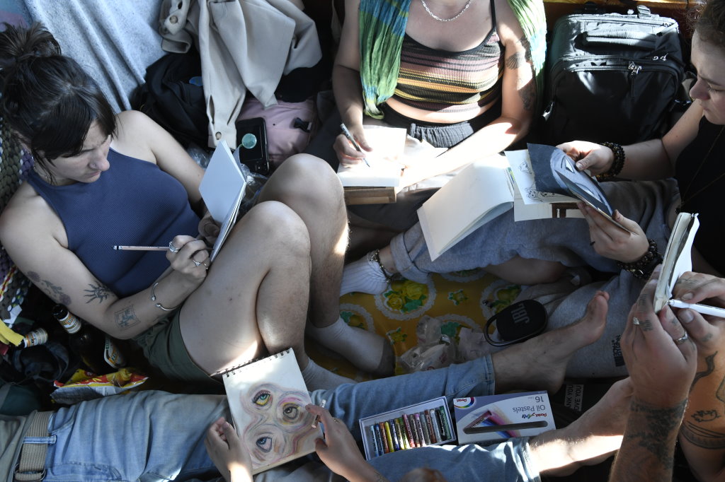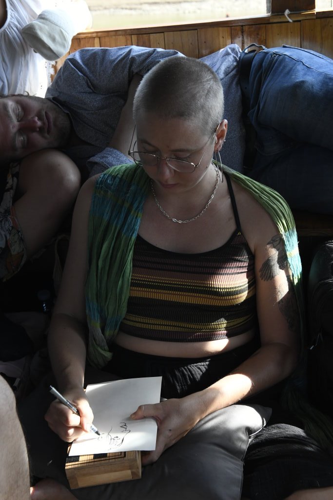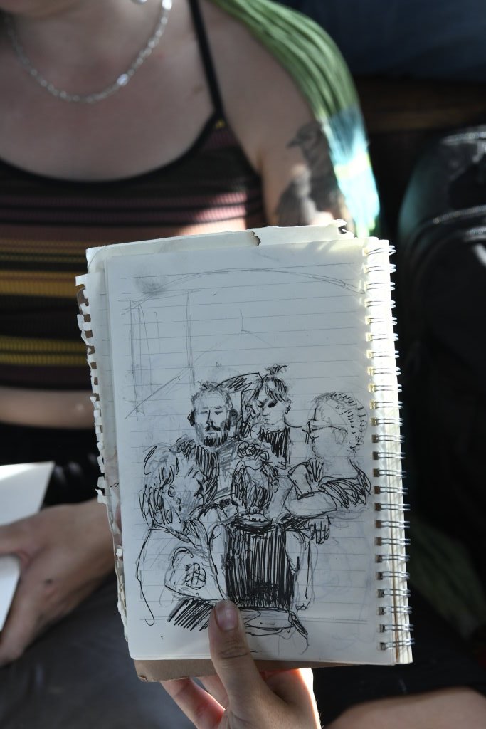 Dann machen Pastellkreiden und Zeichenstifte die Runde. Ganz altmodisch beginnen sie, sich gegenseitig zu zeichnen. Die Generation Selfie hat die klassische Porträtzeichnung für sich entdeckt. Das Handy dient einem anderen Zweck. “Changes…” ruft David Bowie aus der Playlist unsere jungen Mitreisenden. Es folgen Kate Bush, Queen und andere aus den 70ern. Passt. Ihren Musikgeschmack teilen wir gerne… Als dann noch ein handgeschriebenes Reisetagebuch die Runde macht, glaube ich fast, in eine andere Zeit zurückgereist zu sein.