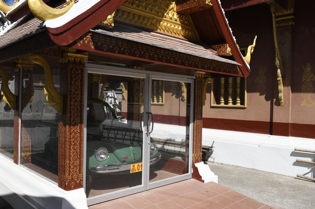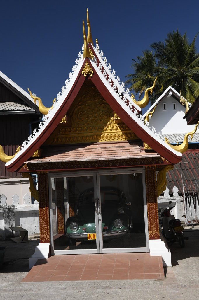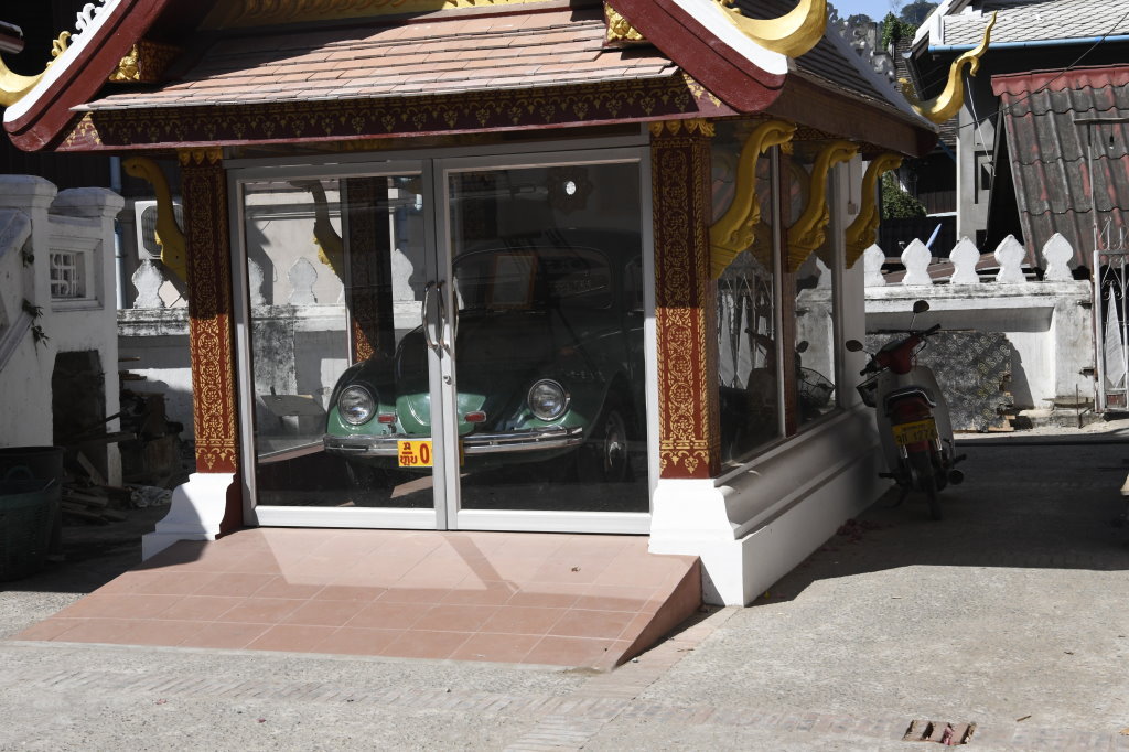 In einem kleinen verglasten Pavillon auf dem Gelände des Wat Saen Sukharam parkt ein blitzblank polierter Volkswagen. Der grüne Käfer gehörte einst dem ehrwürdigen Sathu Nyai Khamchan (Phra Khamchan Virachitto), der zu den einflussreichsten Äbten des 20. Jahrhunderts zählt und in Luang Prabang von 1972 bis 2017 als Präsident der Lao Buddhist Fellowship Organization (LBFO) lebte und wirkte.