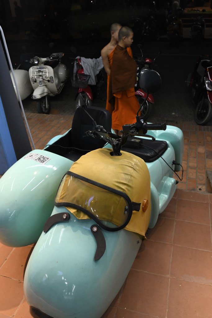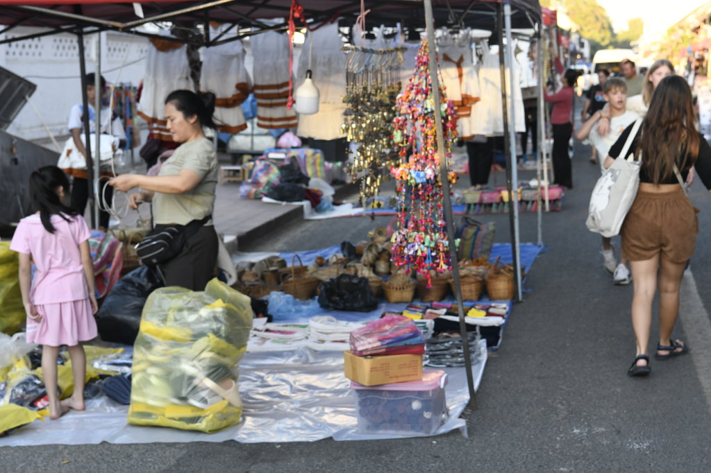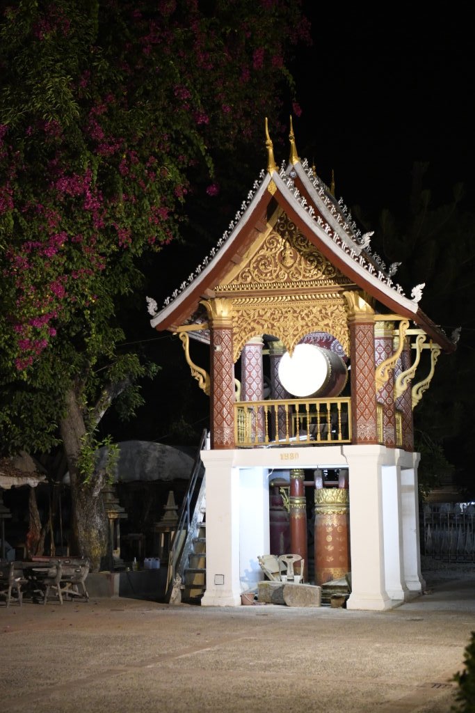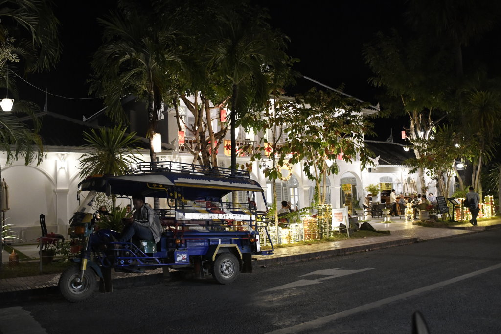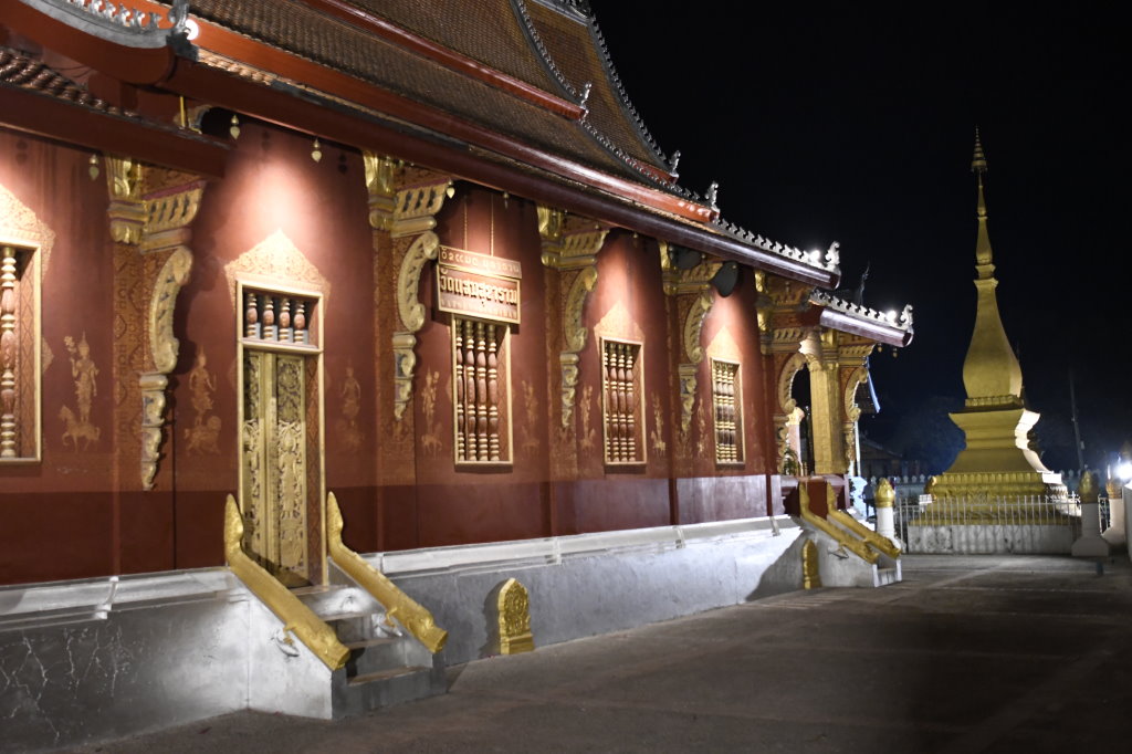 Bis wir am Nationalmuseum vorbei schließlich am Wat May Souvannapoumaram ankommen, wo wir erstaunlicherweise die einzigen Besucher um diese Zeit sind, ist es später Nachmittag geworden. Die ersten Straßenhändler beginnen damit, ihre Stände für den Nachtmarkt aufzubauen.