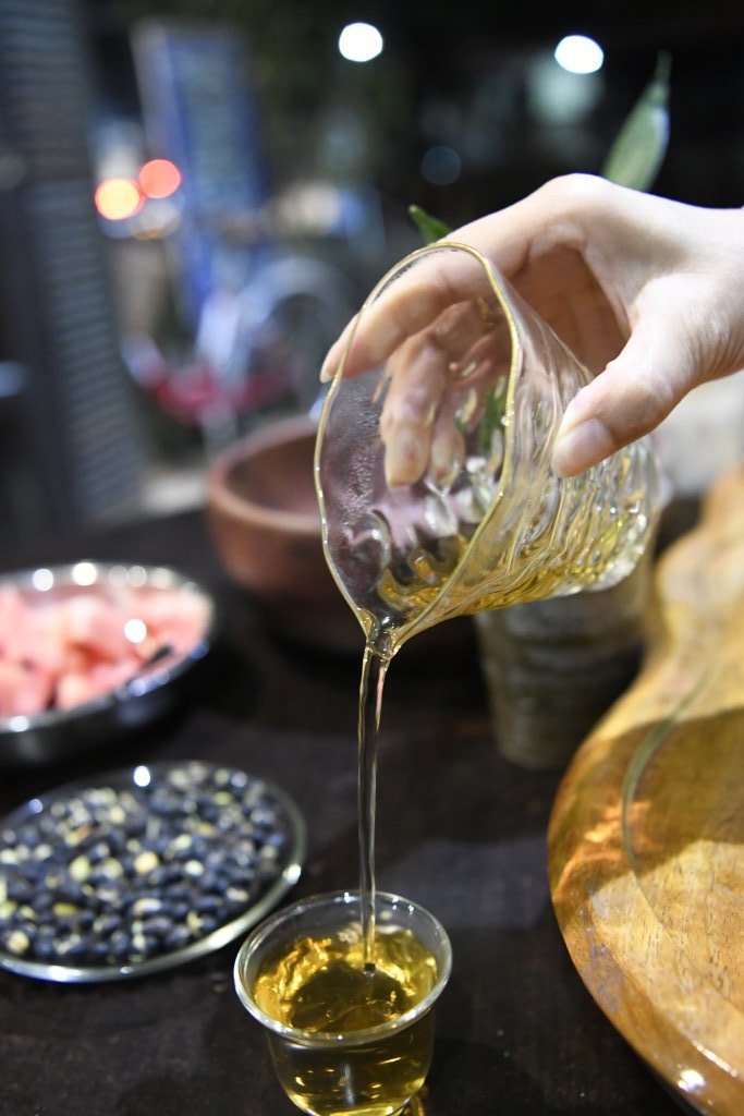 „Grüner Tee ist gut für die Verdauung und entgiftet den Körper,“ erläutet die Chinesin Ricki in perfektem britisch gefärbtem Englisch, während sie Tee in die kleinen Glasschälchen vor uns füllt und die Blätter im Gaiwan ein weiteres Mal mit kochend heißem Wasser aufgießt, einen Deckel drauflegt und ihn zwei bis drei Minuten ziehen lässt. „Der erste Aufguss ist der Aufguss des guten Geruchs. Mit ihm werden die Blätter geöffnet, um ihre Bitterkeit zu mildern. Erst mit dem zweiten Aufguss, dem Aufguss des guten Geschmacks, kann man mit dem Trinken beginnen. Jetzt haben die Blätter einen Großteil ihrer Bitterstoffe verloren und man kann das jeweilige Aroma schmecken. Den nächsten und viele weitere nennen wir Aufguss der langen Freundschaft.“