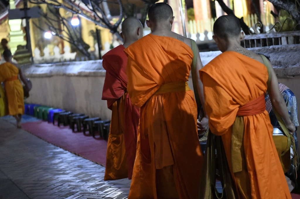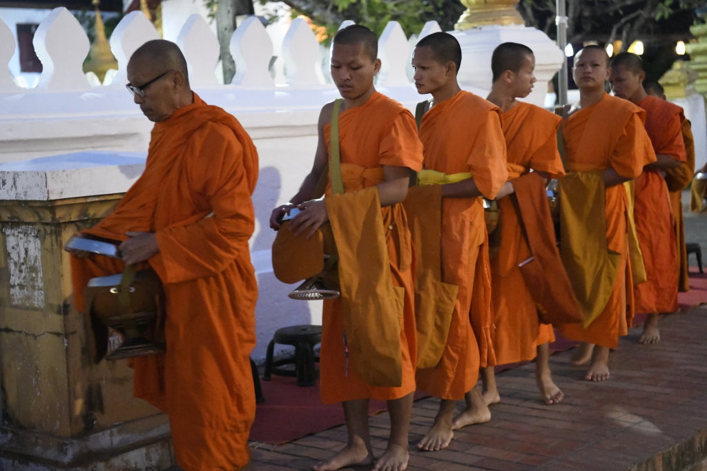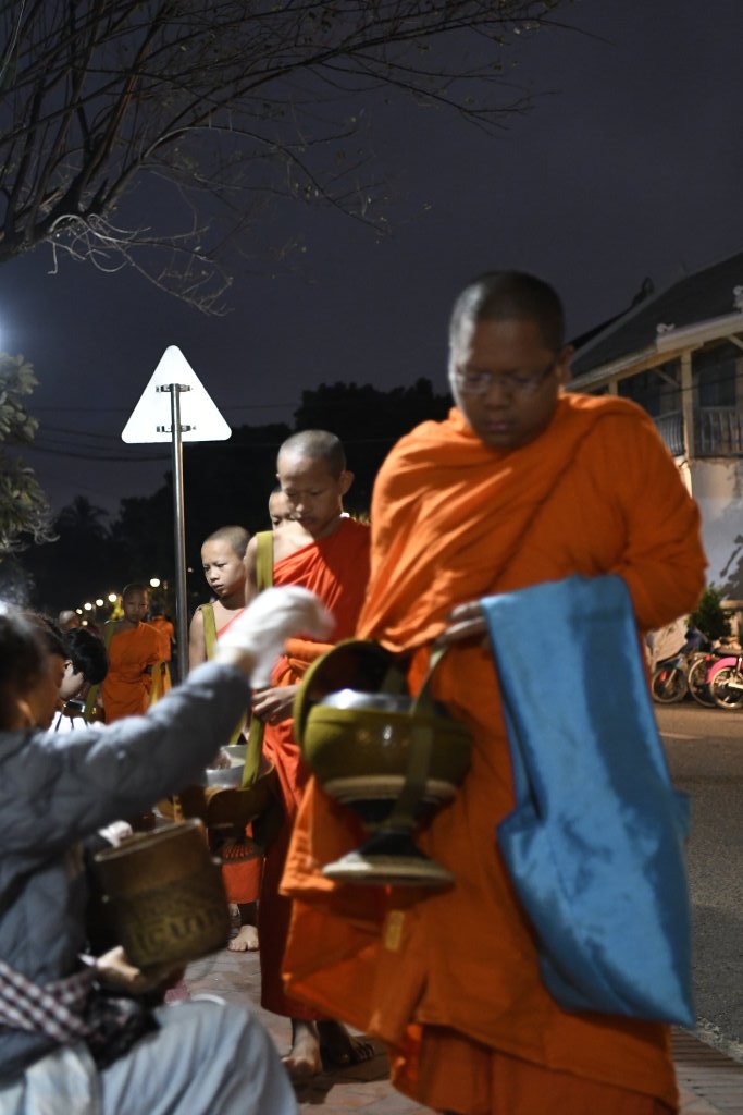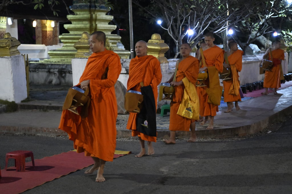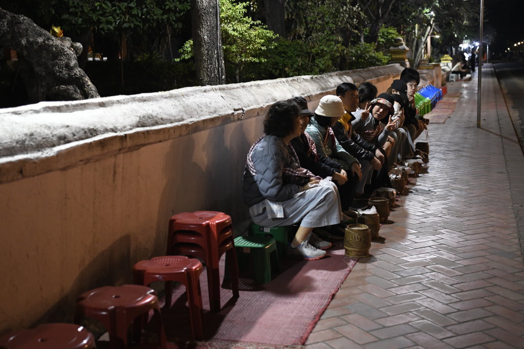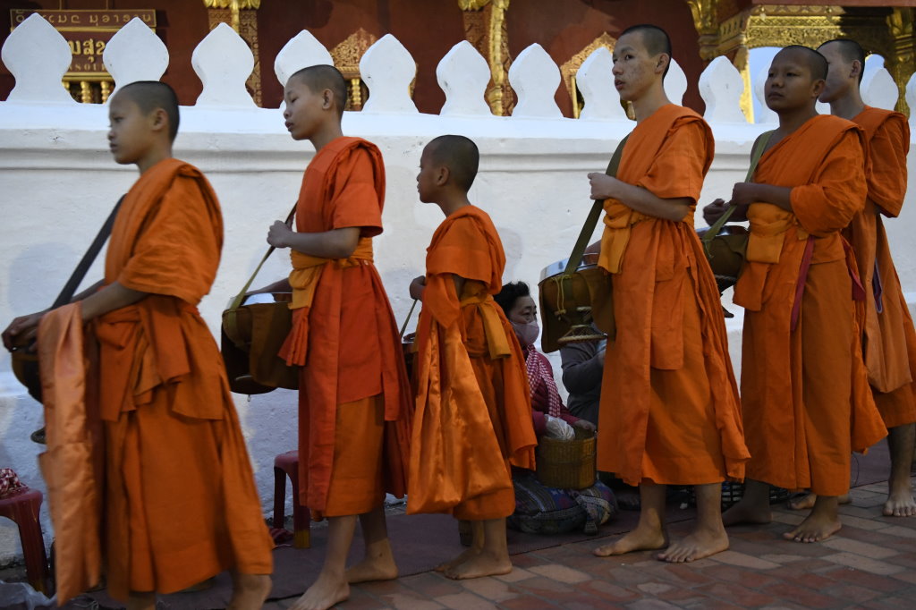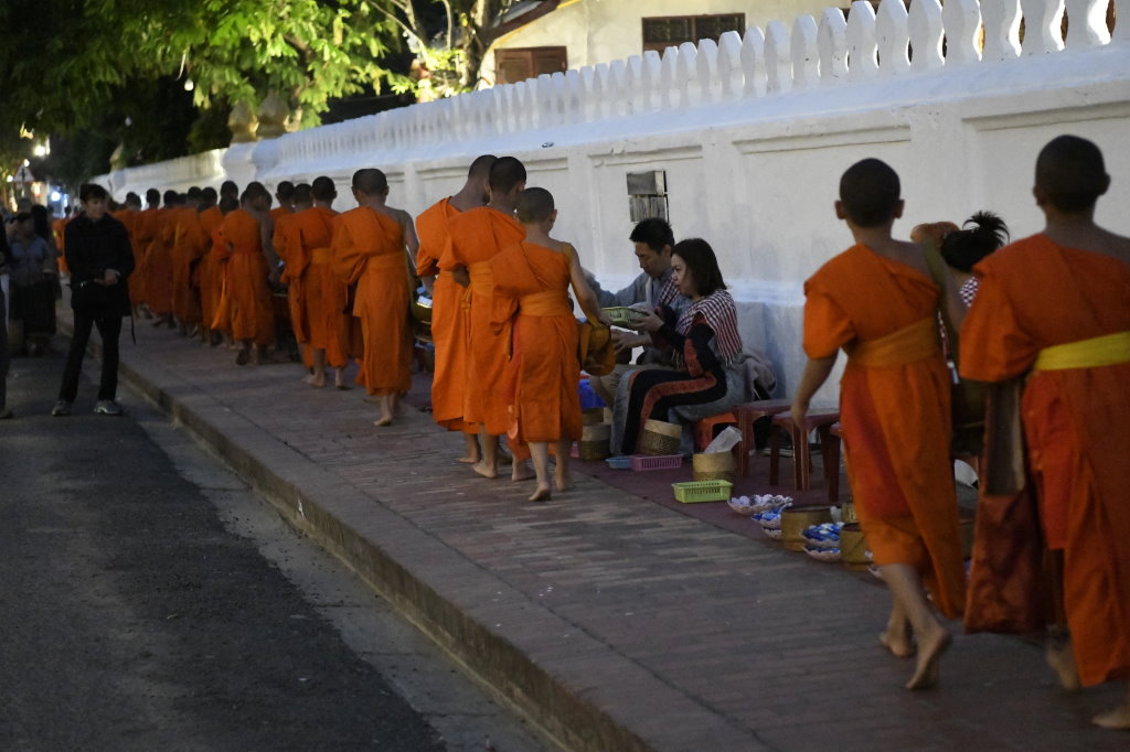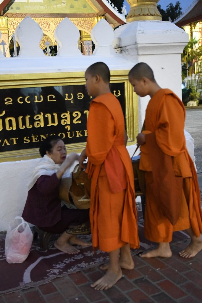 Die Regeln sind streng. Die Spender haben ihre Schuhe ausgezogen, sitzen auf niedrigem Plastikhockern auf einer Bastmatte entlang der Mauer des Wats, formen den Klebreis zu einer kleinen Kugel und legen sie zusammen mit einer Süßigkeit dem kurz innehaltenden Mönch vor ihnen behutsam in die Sammeltrommel. Deckel zu, ein kurzes Kopfnicken, der nächste bitte. So geht das eine Weile bis die erste Gruppe durchgezogen ist. Mit etwas Abstand folgt die nächste, wieder angeführt von einem älteren Mönch, der Rest folgt wie die Orgelpfeifen.