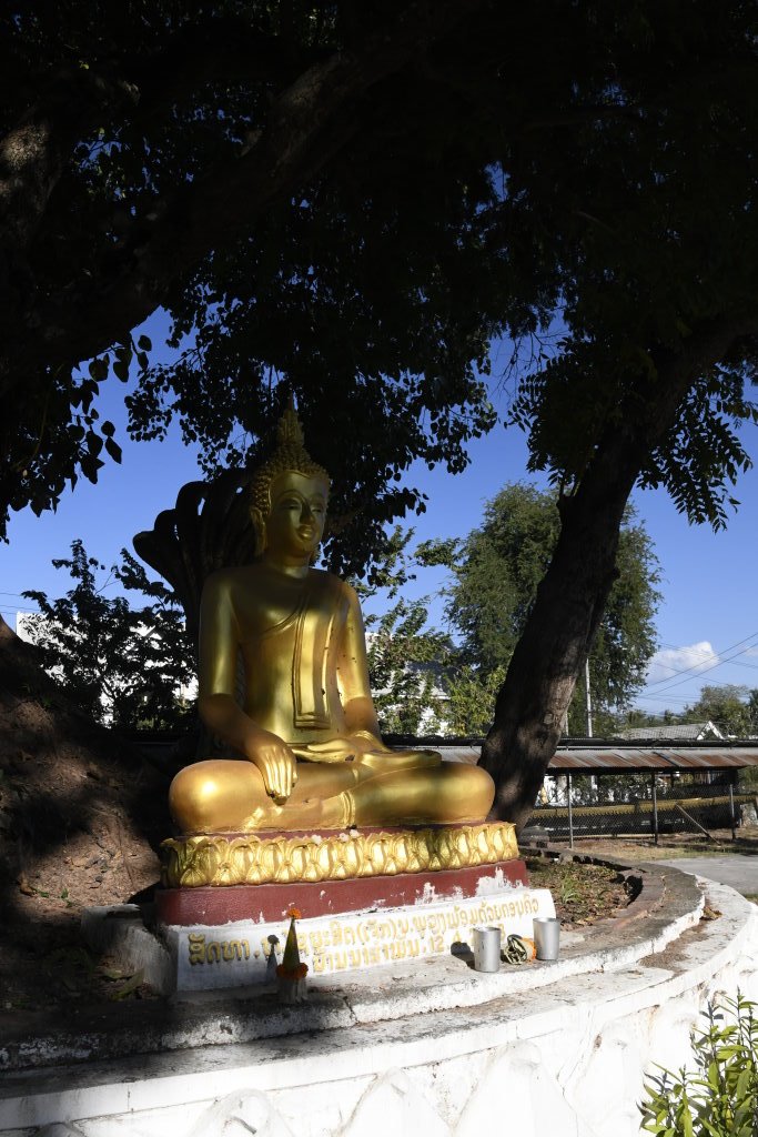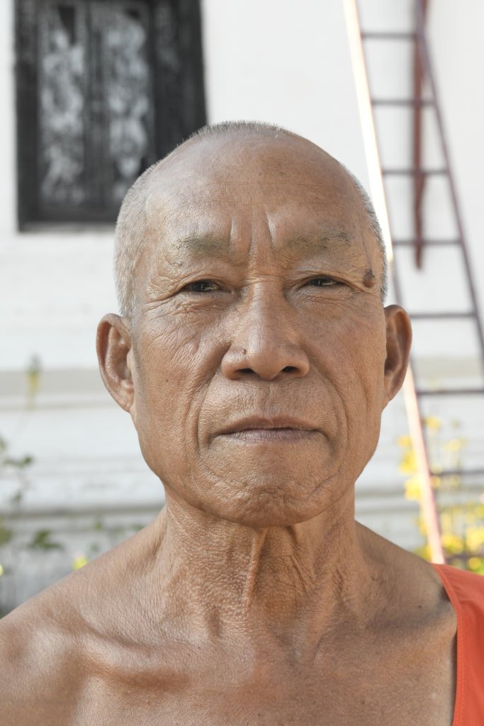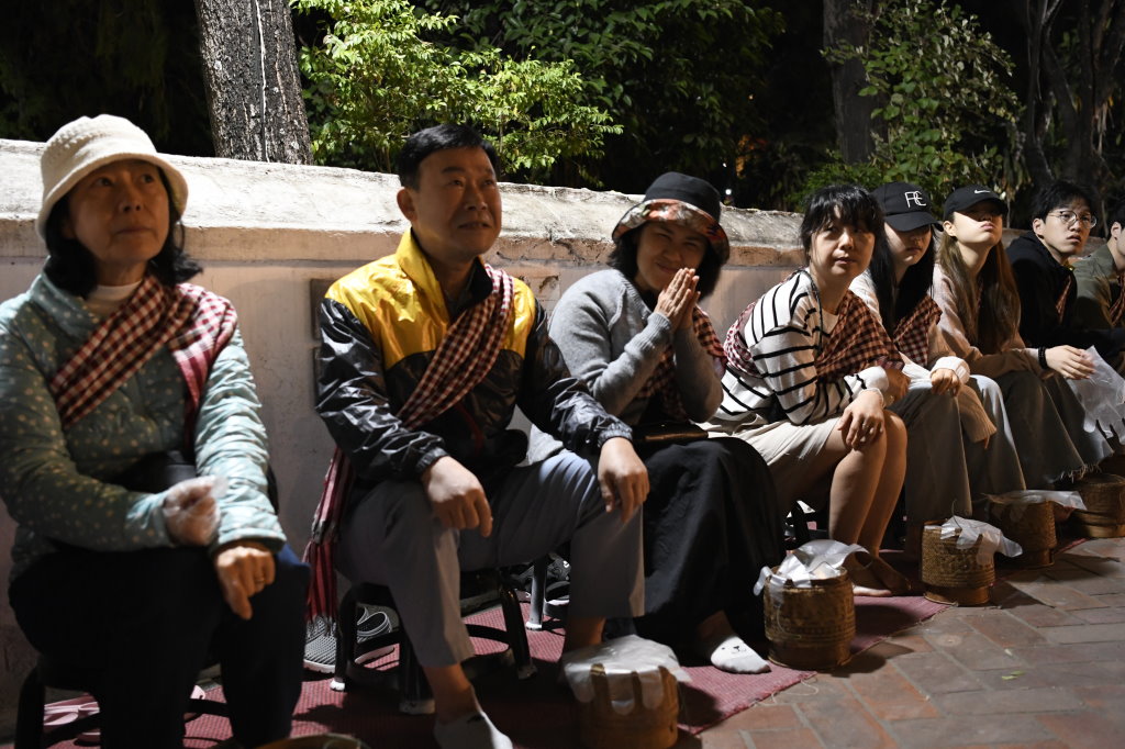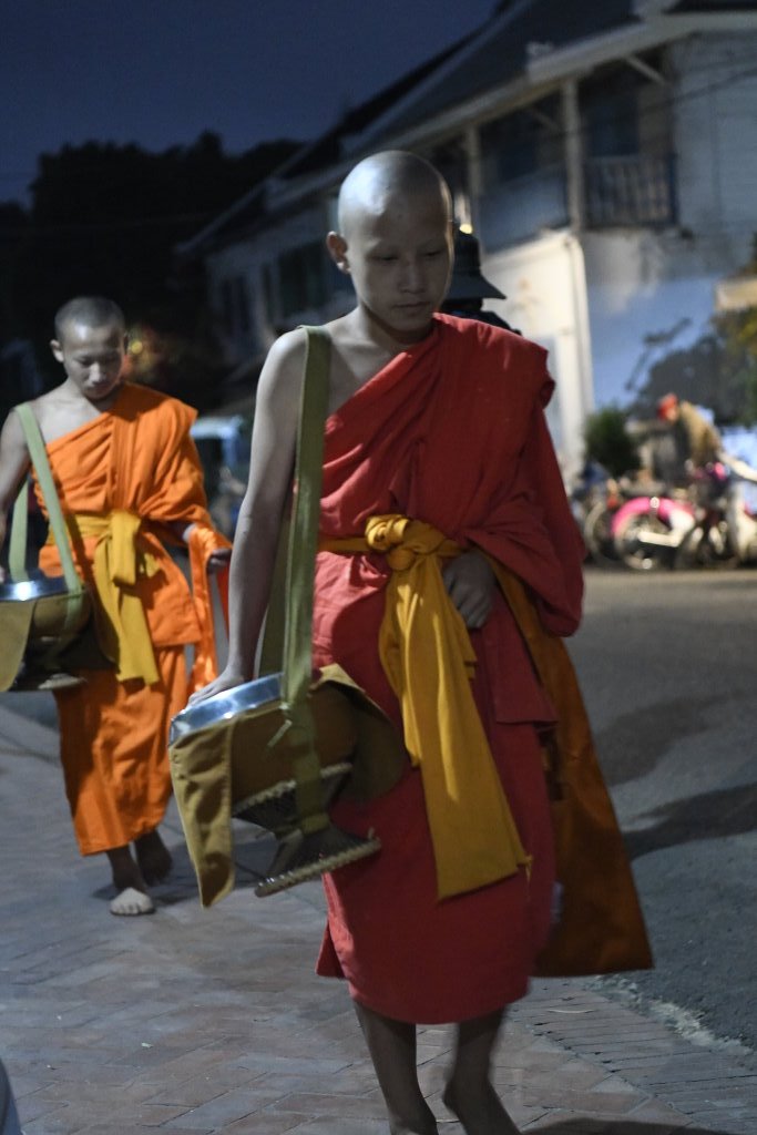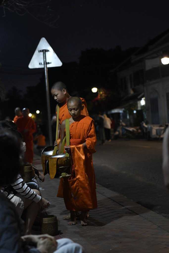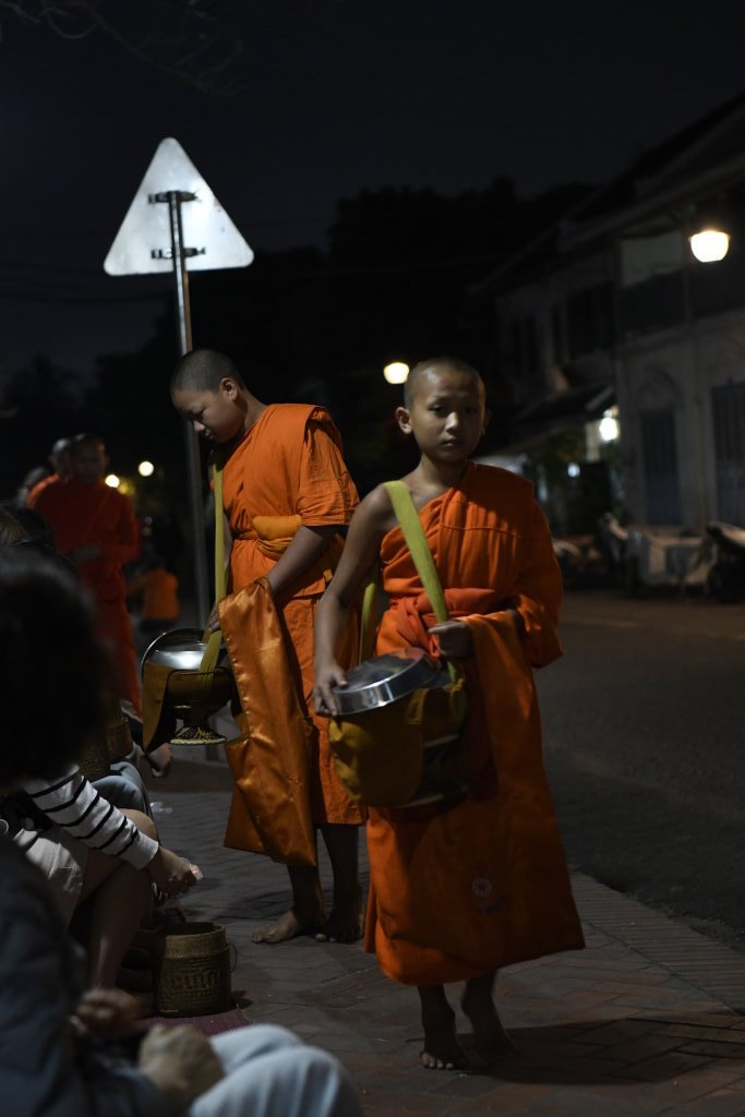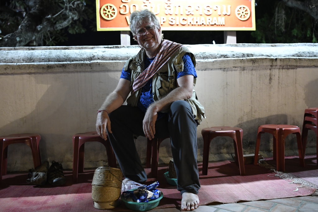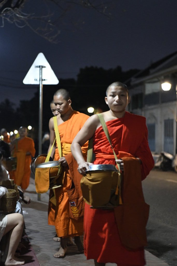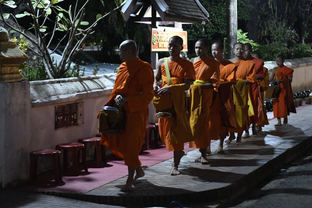 Die Regeln sind streng. Die Spender haben ihre Schuhe ausgezogen, sitzen auf niedrigem Plastikhockern auf einer Bastmatte entlang der Mauer des Wats, formen den Klebreis zu einer kleinen Kugel und legen sie zusammen mit einer Süßigkeit dem kurz innehaltenden Mönch vor ihnen behutsam in die Sammeltrommel. Deckel zu, ein kurzes Kopfnicken, der nächste bitte. So geht das eine Weile bis die erste Gruppe durchgezogen ist. Mit etwas Abstand folgt die nächste, wieder angeführt von einem älteren Mönch, der Rest folgt wie die Orgelpfeifen.