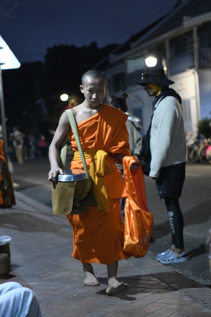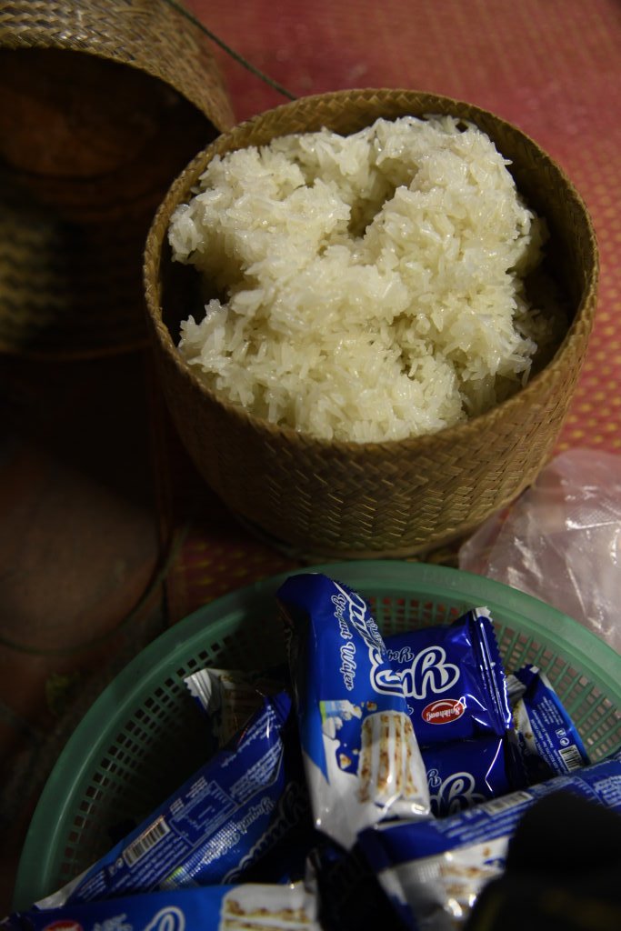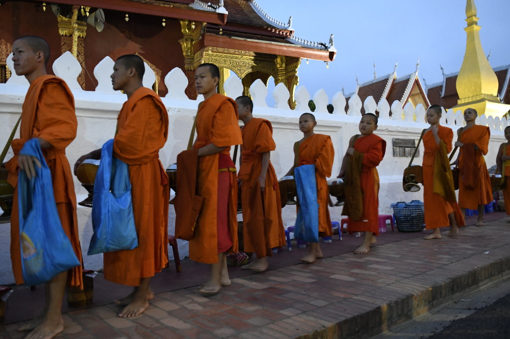 Den Wecker habe ich heute mal etwas früher gestellt, um gegen 6 Uhr den morgendlichen Almosengang der Mönche mitzuerleben. Die Prozession zieht auch an unserem Quartier vorbei, da wäre es schade, nicht an einem Tag einmal die Gelegenheit zu nutzen. Für 100.000 laotische Kip (4,45 Euro) verkauft mir eine Straßenhändlerin Klebreis in einem Bambuskorb und eine entsprechende Menge Süßigkeiten.