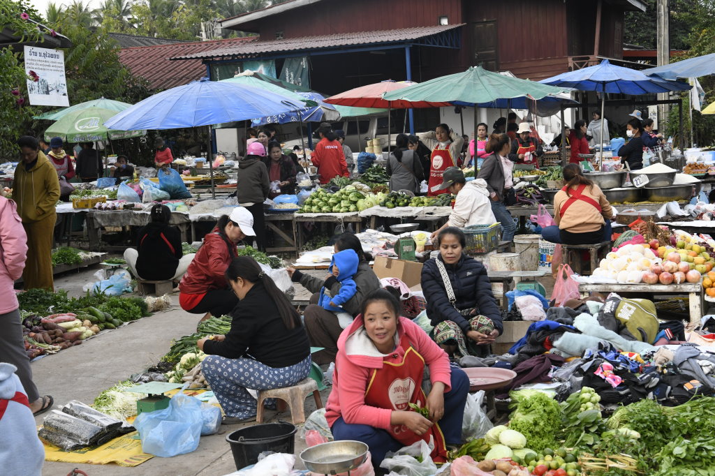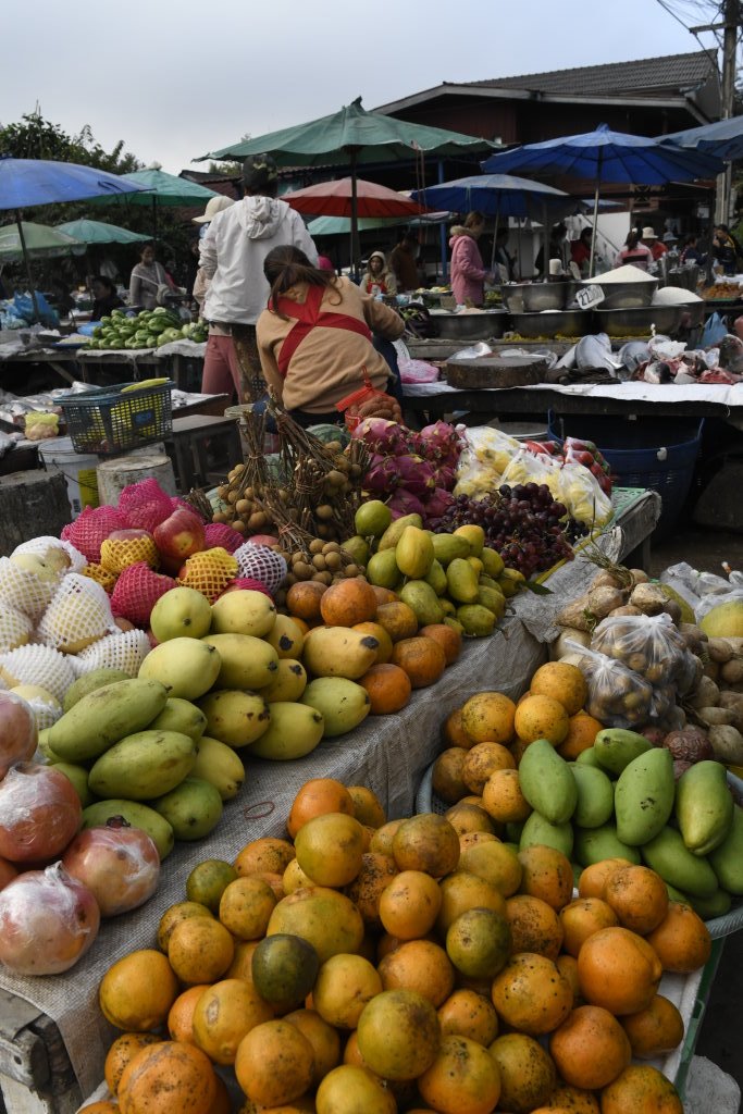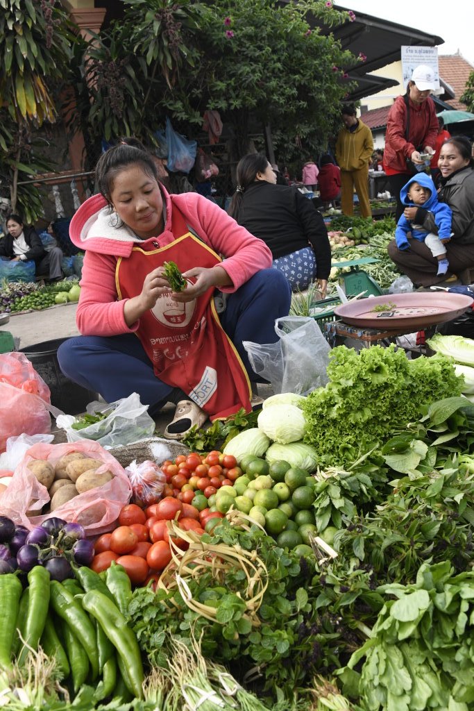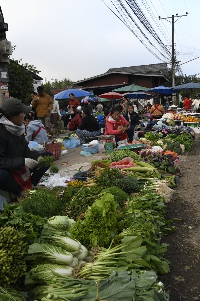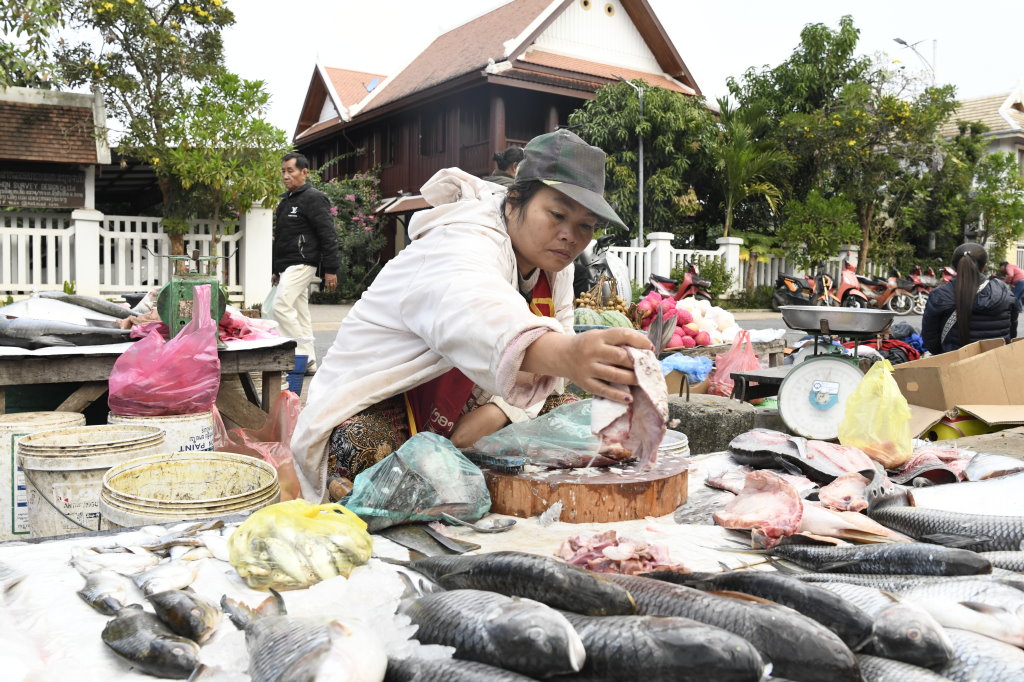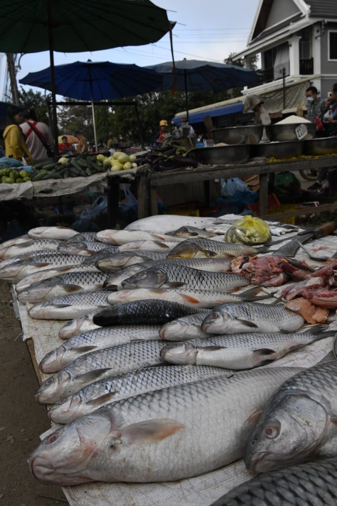 Viel Zeit zum Verschnaufen bleibt nicht, heute wartet ein Kochkurs auf uns. Um 8 Uhr werden wir von einem Tuk-Tuk abgeholt und in einen Vorort rund 6 Kilometer nordöstlich der Altstadt gebracht. Dort wartet bereits Deng für einen Rundgang über einem kleinen lokalen Markt, um mit uns noch einige Zutaten für die für heute geplanten Gerichte zu kaufen. Die angebotenen Fische kommen fangfrisch aus dem Mekong, wir hatten die Fischer bereits auf der Slowboot-Fahrt beobachten können.