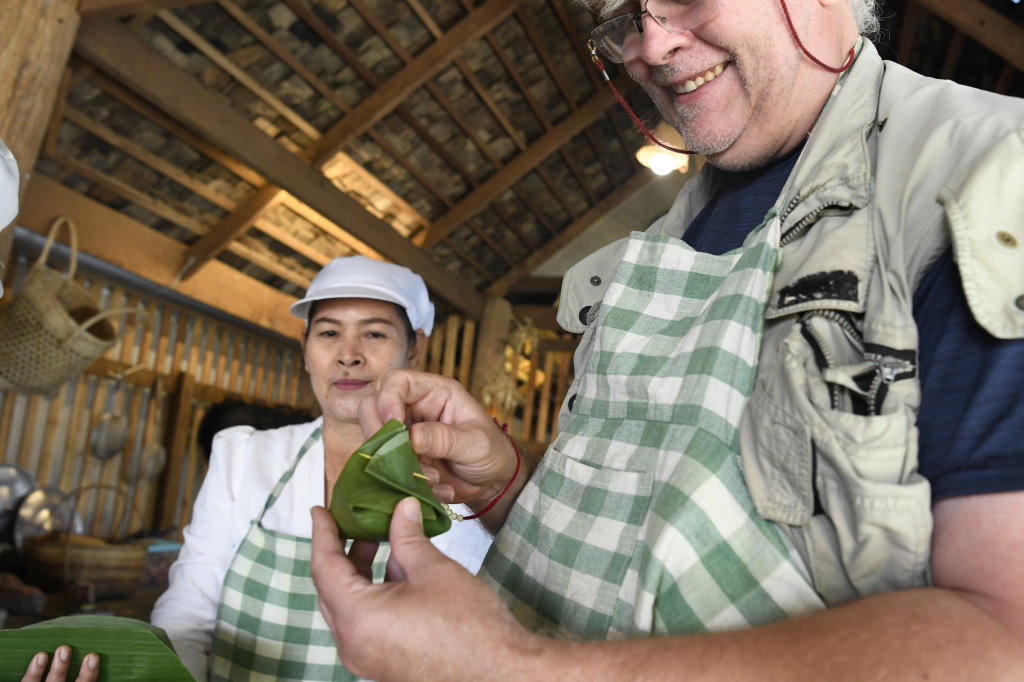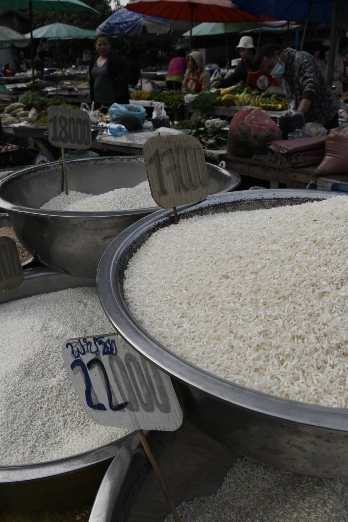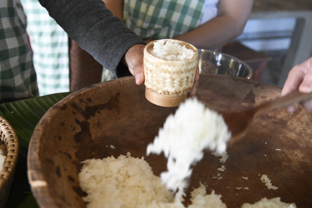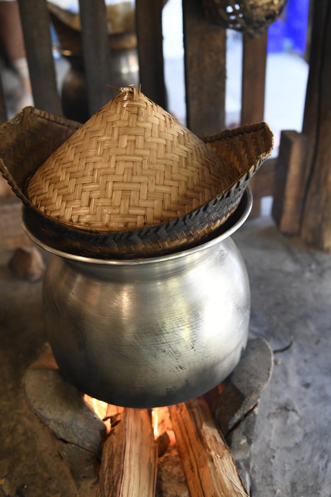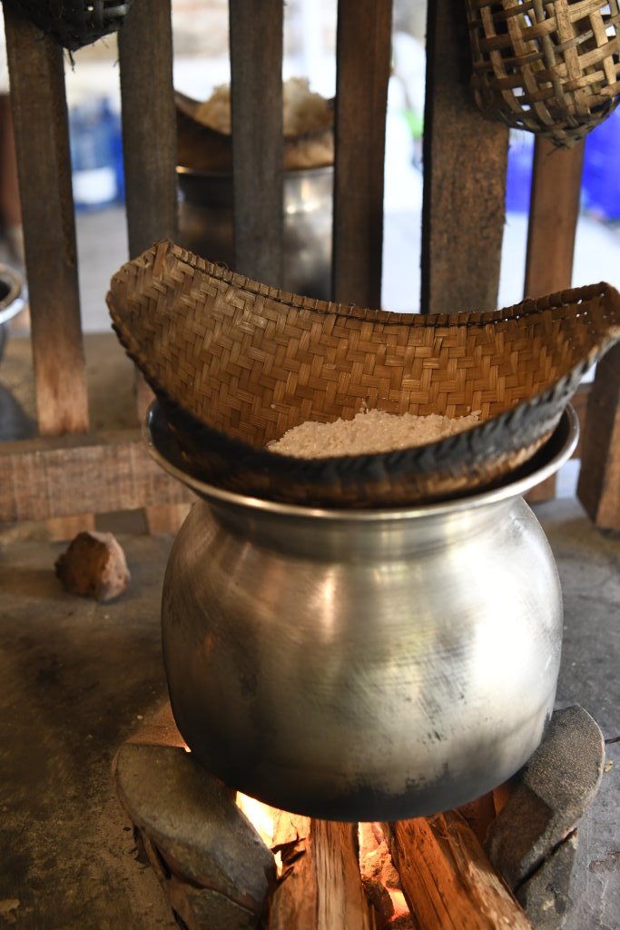 Los geht’s mit der Zubereitung des allgegenwärtigen Klebreis, der nicht nur als Beilage zu vielen laotischen Gerichten gehört, sondern auch essenzieller Bestandteil der morgendlichen Lebensmittelspenden für die Mönche ist.