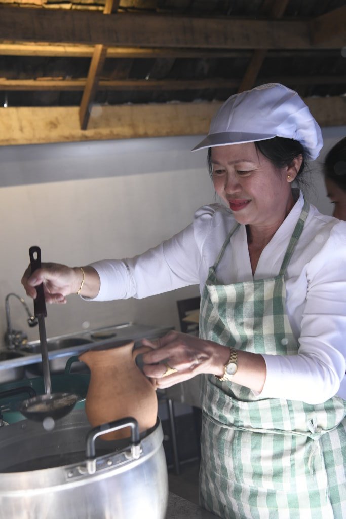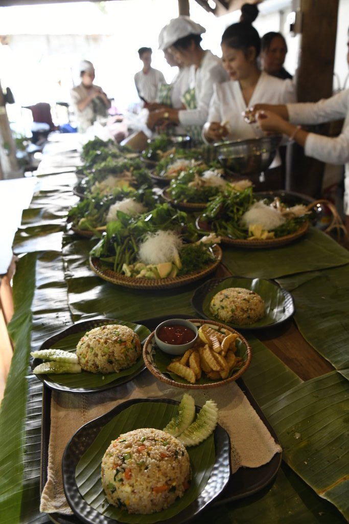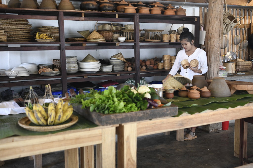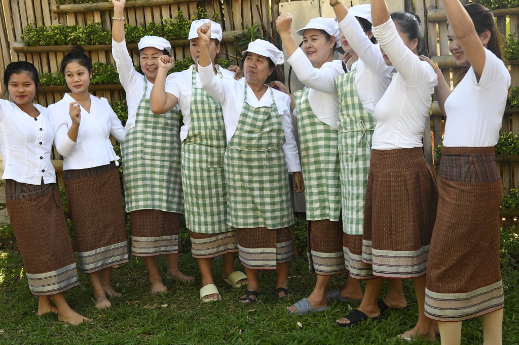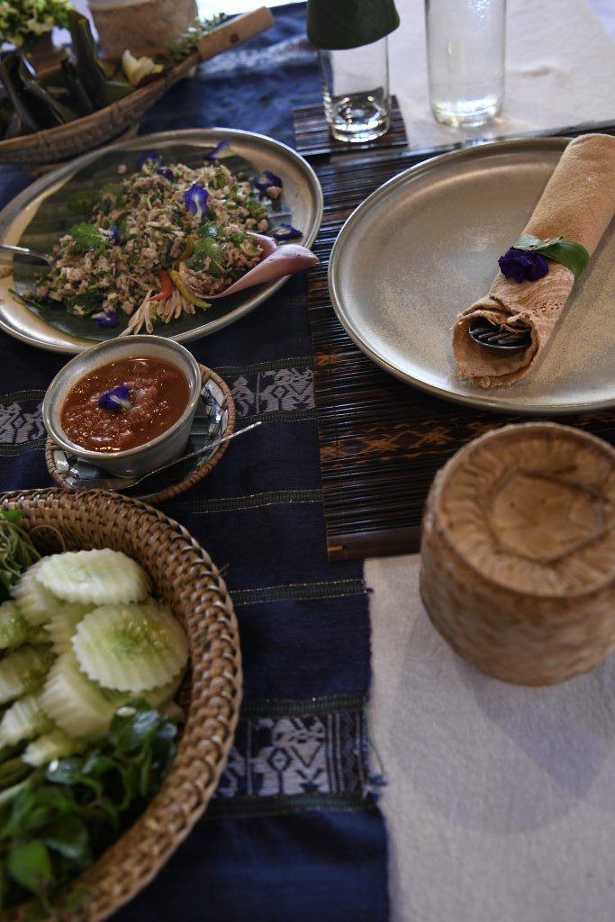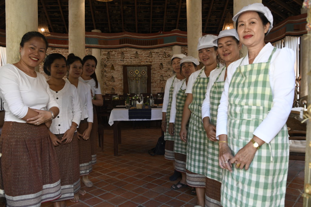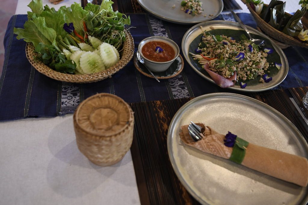 Sobald der Klebreis fertig und in Bastkörbchen verstaut wurde, ist auch schon Essenszeit. Die gemeinsam zubereiteten Gerichte müssen verkostet werden. Zum Glück hatten wir es selbst in der Hand, ob und wieviel Koriander zum Einsatz kamen. Larp und auch der gedünstete Mekongfisch schmecken köstlich. Damit wäre normalerweise das Ende des Kochkurses erreicht. Aber nein, heute ist alles anders. Für die Angestellten ist am Nachbartisch ein großes laotischen Barbecue aufgebaut.