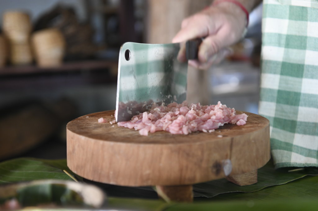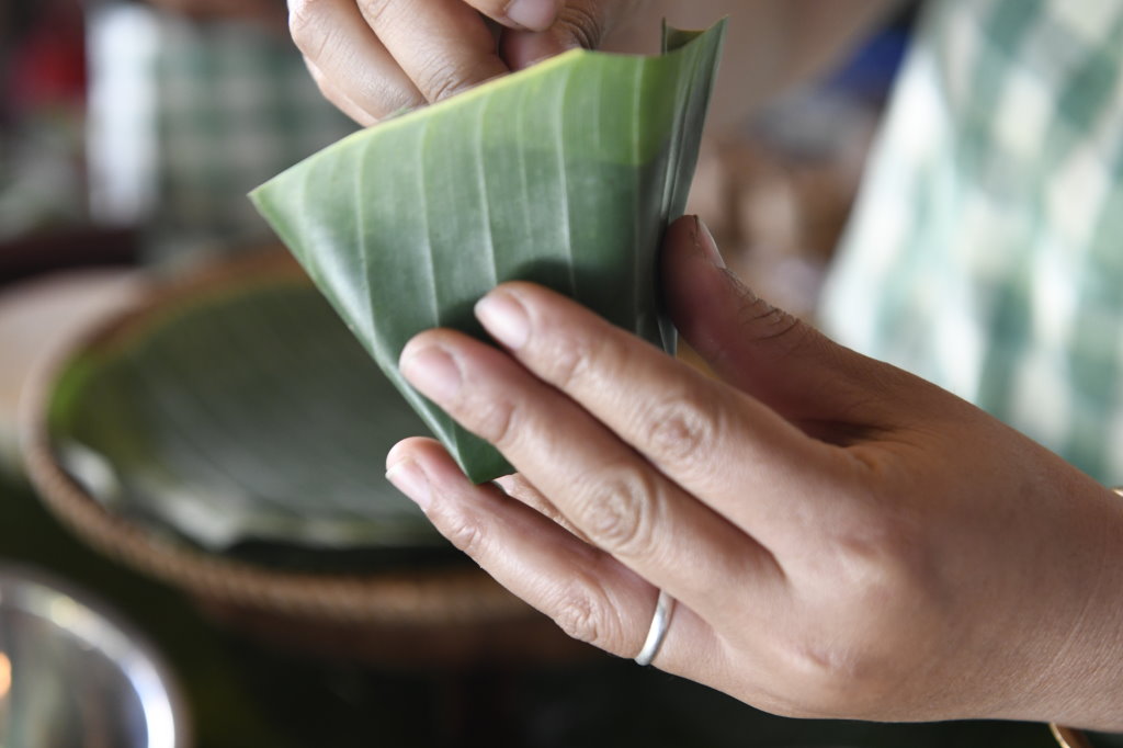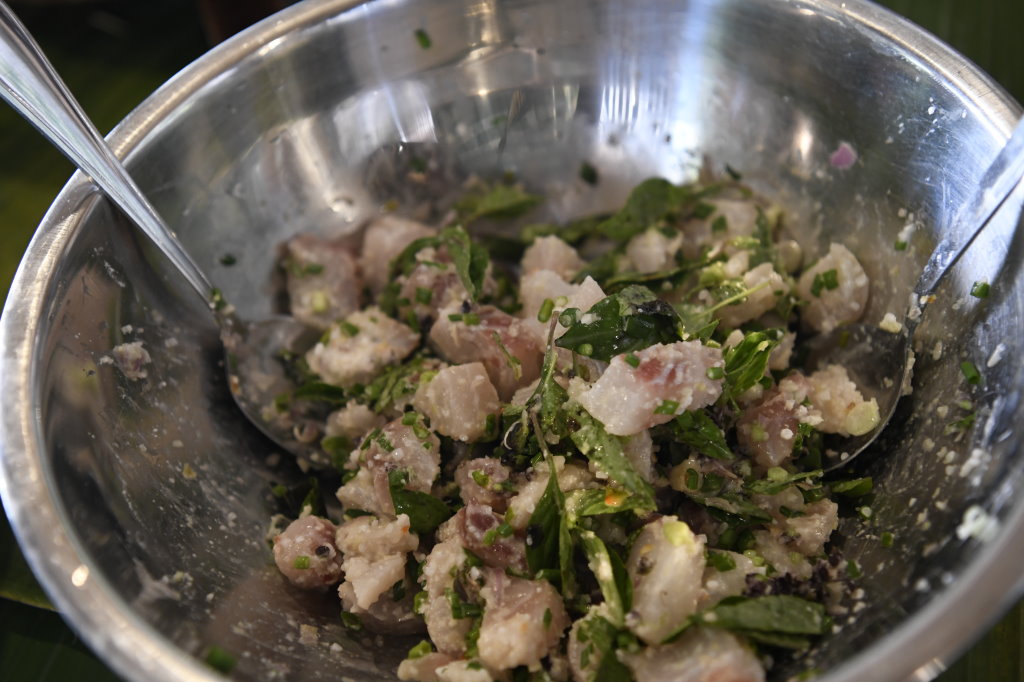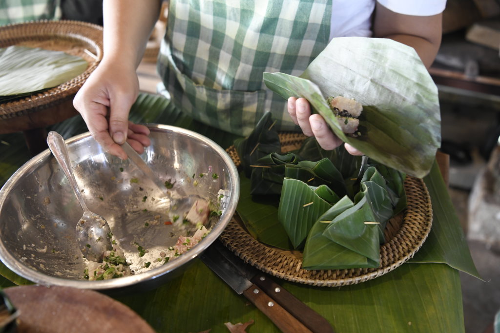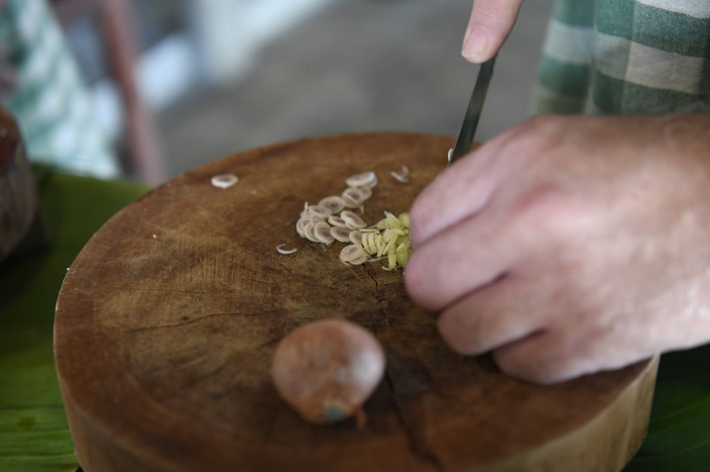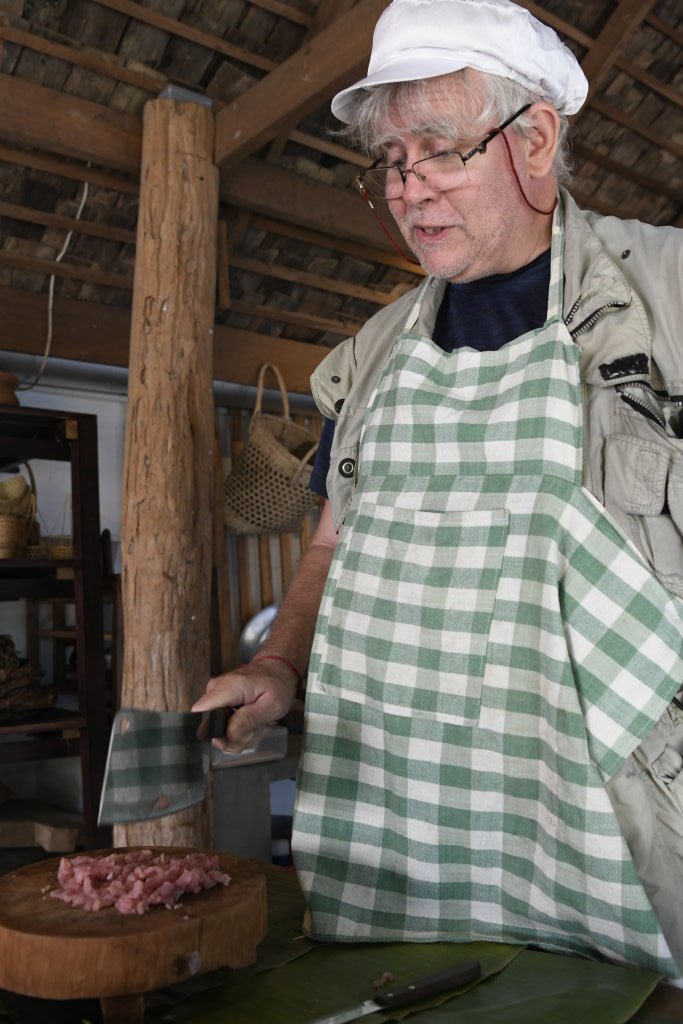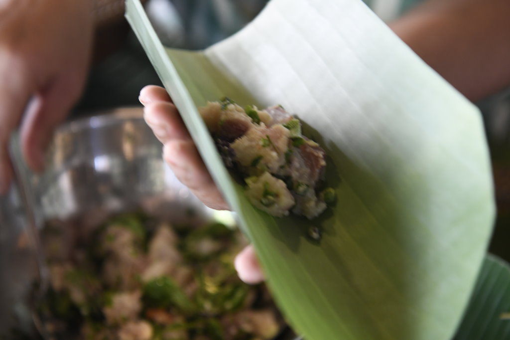 Beim Verpacken der zuvor marinierten Fischstückchen in Bananenblätter müssen wir dann beide unsere Geschicklichkeit unter Beweis stellen. Wie gut, wenn man schon dank deutscher Rouladen und italienischer Involtini ein paar Erfahrungen mitbringen kann.