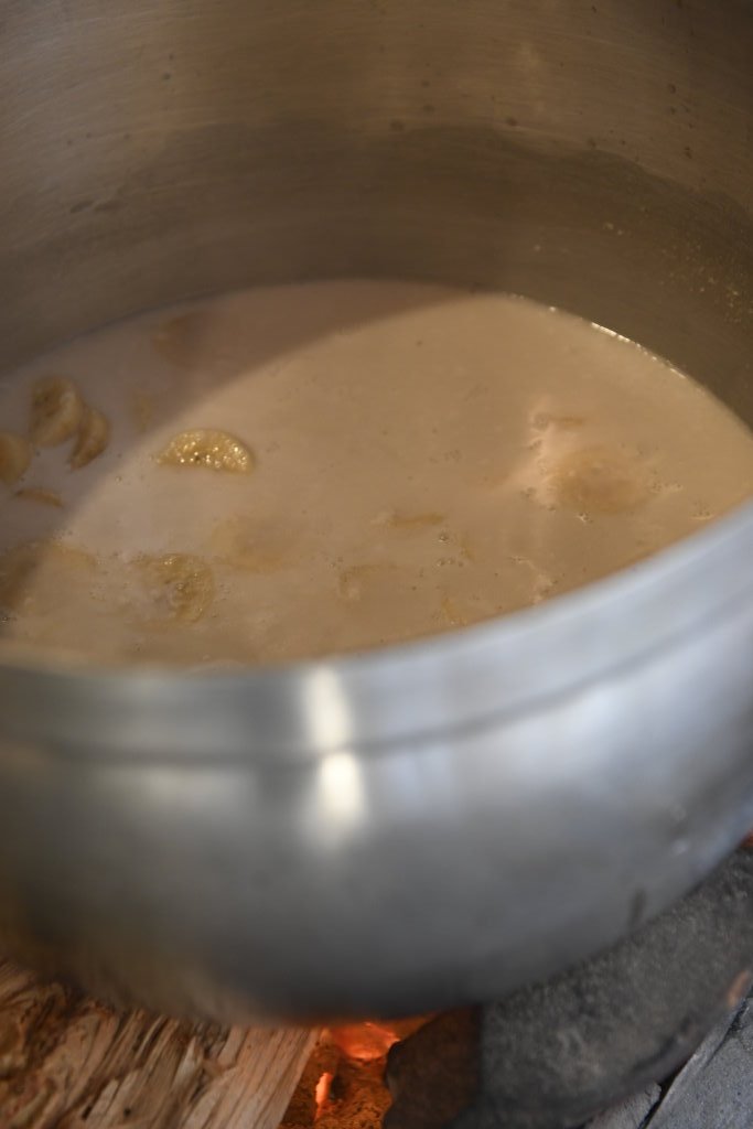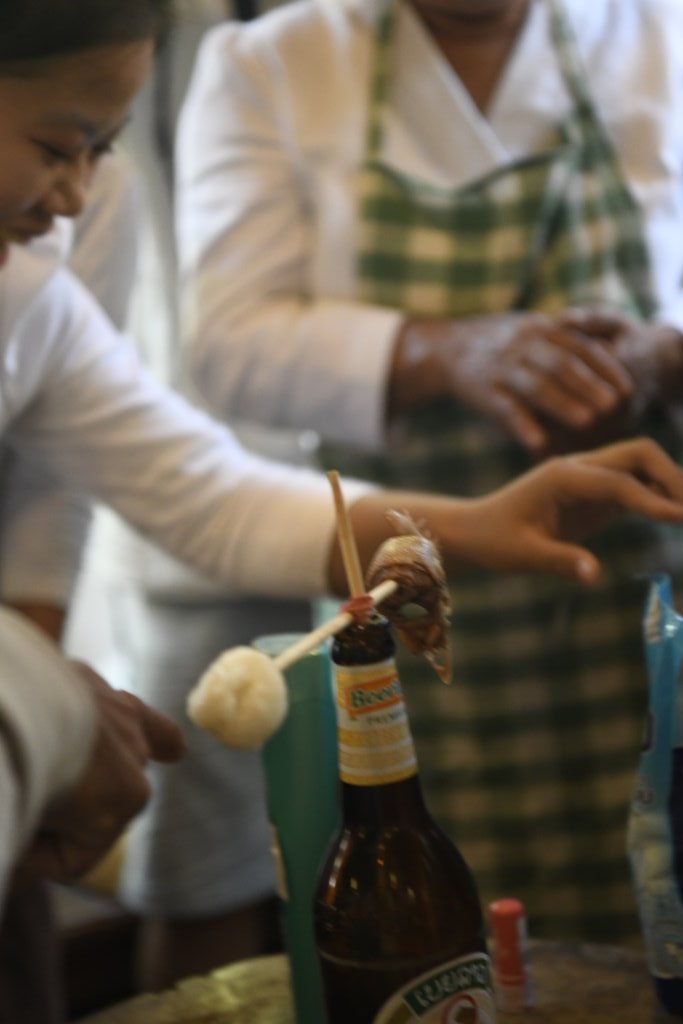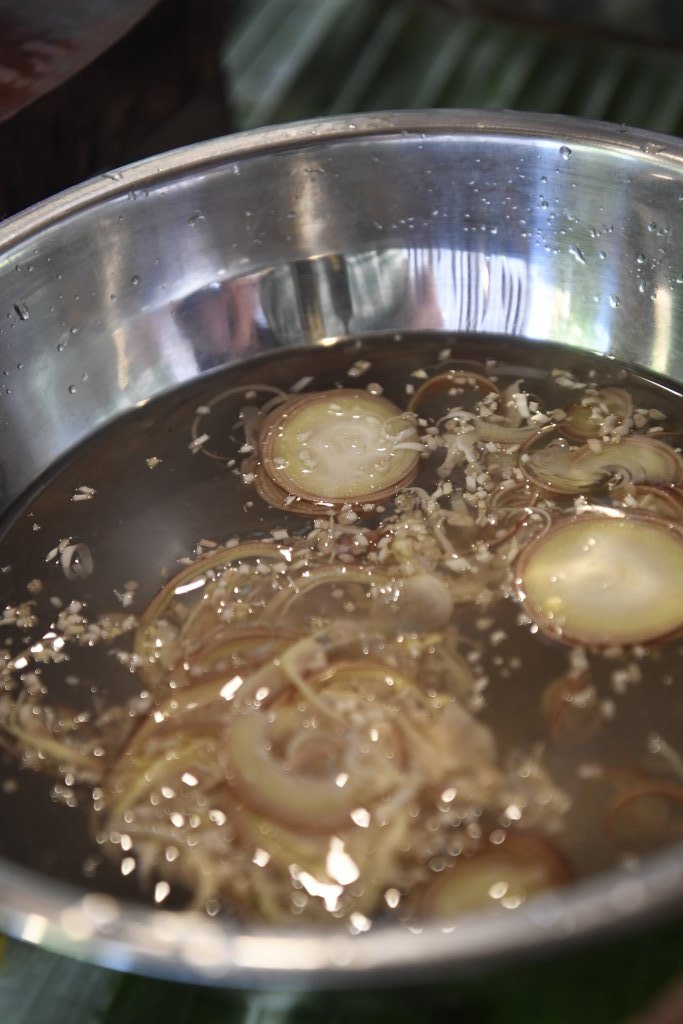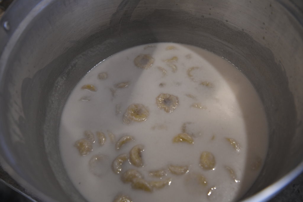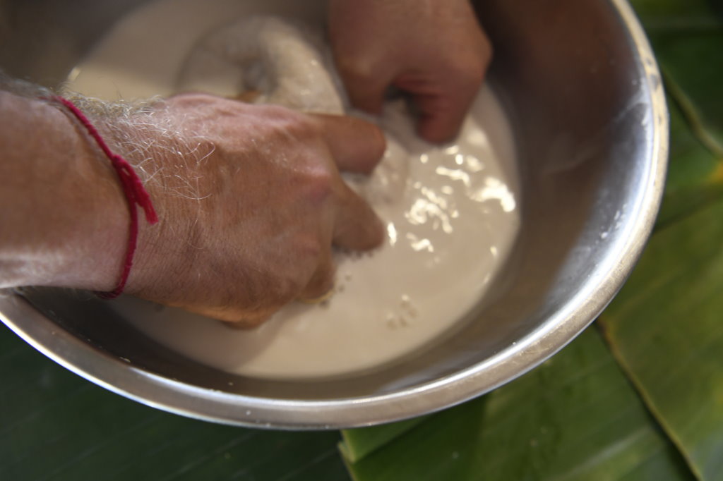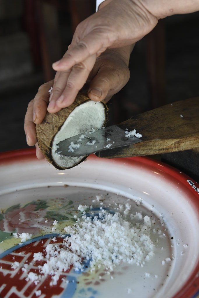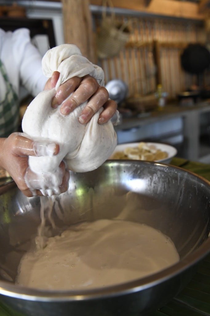 Die Kokosmilch für die Nachspeise kommt nicht aus der Dose. Erst wir das Kokosfleisch geschickt aus der Schale geraspelt, in einen Leinenbeutel verfrachtet, etwas warmes Wasser dazu und dann heißt es auch schon: Strong Man, pressing. Kommt mir bekannt vor, das hatten wir schon mal in Vietnam, da ging es um das Gemüse für die Frühlingsrollen… same, same, but different… Die selbstgemachte Kokosmilch wird anschließend mit Bananenscheiben und etwas Zucker aufgekocht, fertig ist die Naschspeise.