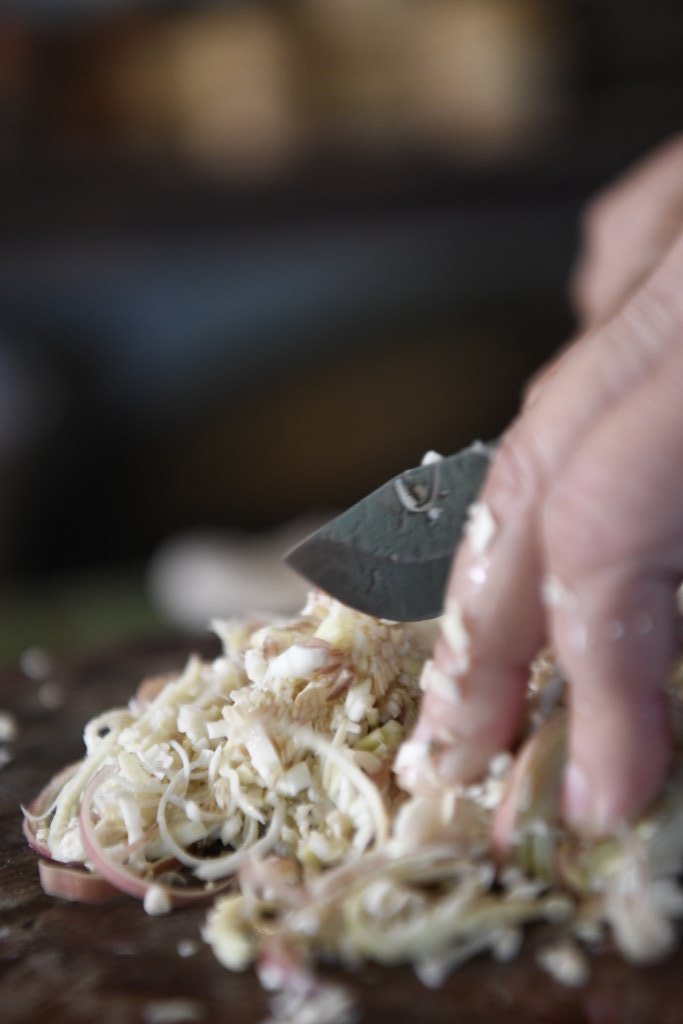 Dann wird geschnippelt, gemörsert und gehackt, was das Zeug hält. Die Zutaten für den Larp, eine Art Hackfleischsalat mit Kräutern müssen möglichst fein und dünn prepariert werden. Es ist fast wie immer, für diese Arbeiten bin ich zuständig…