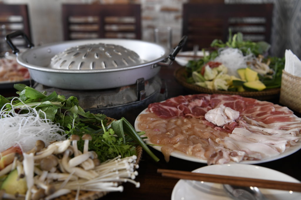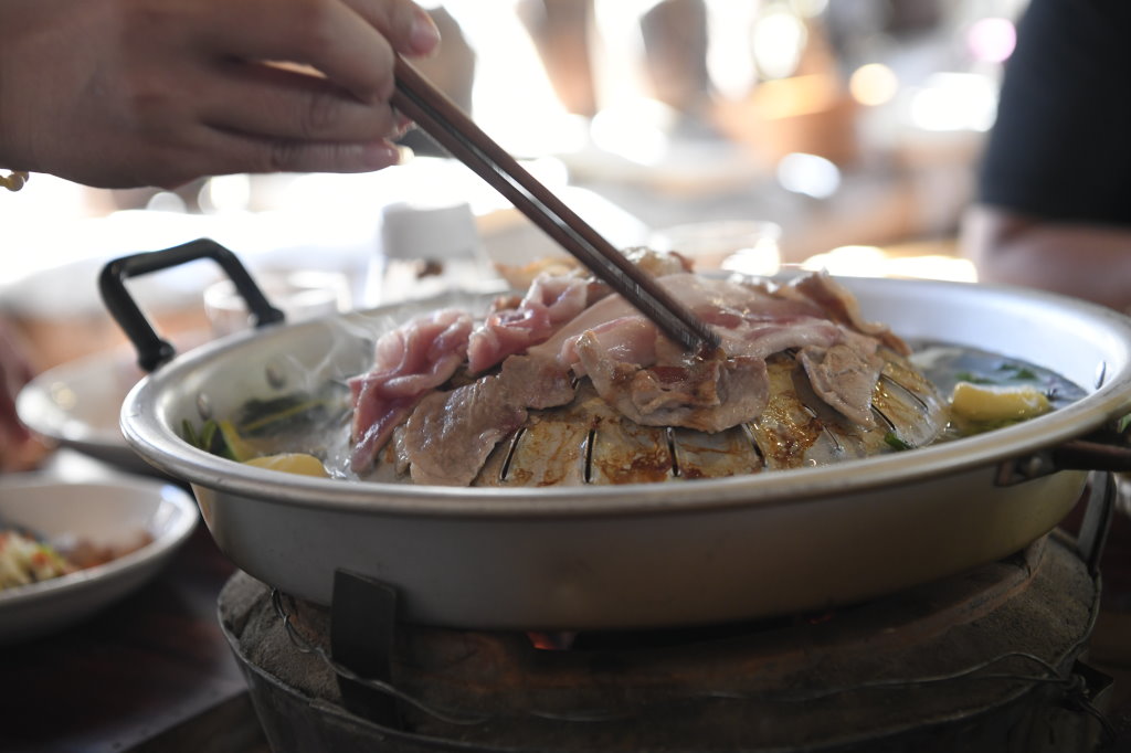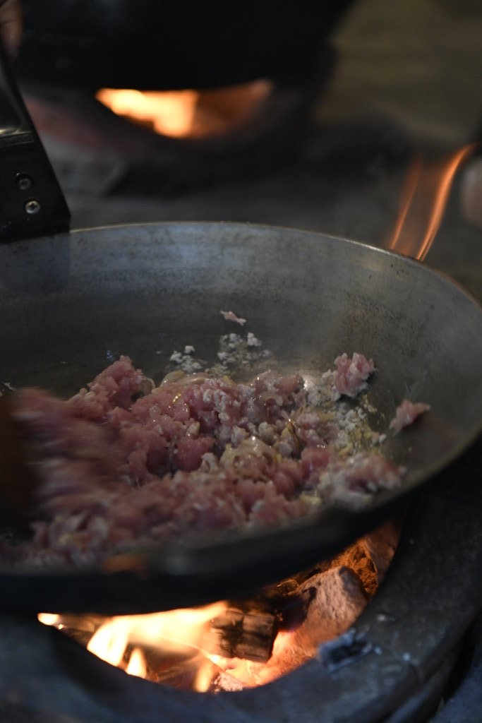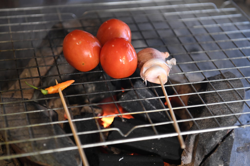 Dann setzen wir uns alle für das gemeinsame Grillen mit den kohlebefeuerten Metallhauben an einen großen Tisch und genießen echtes Slow Food….