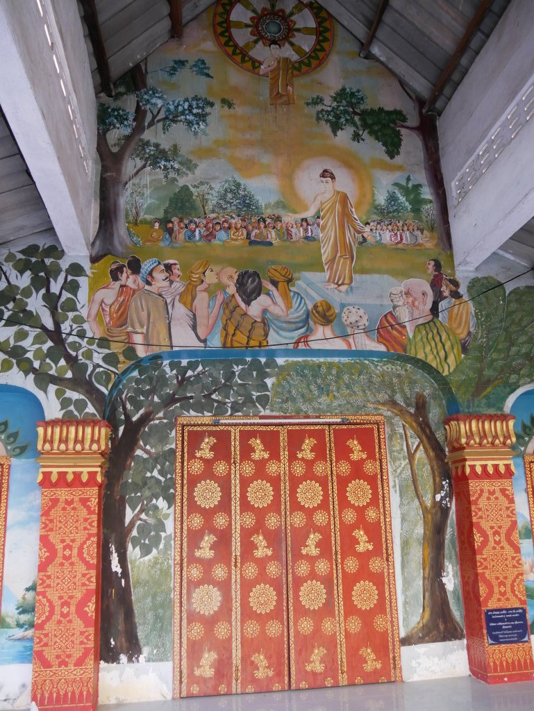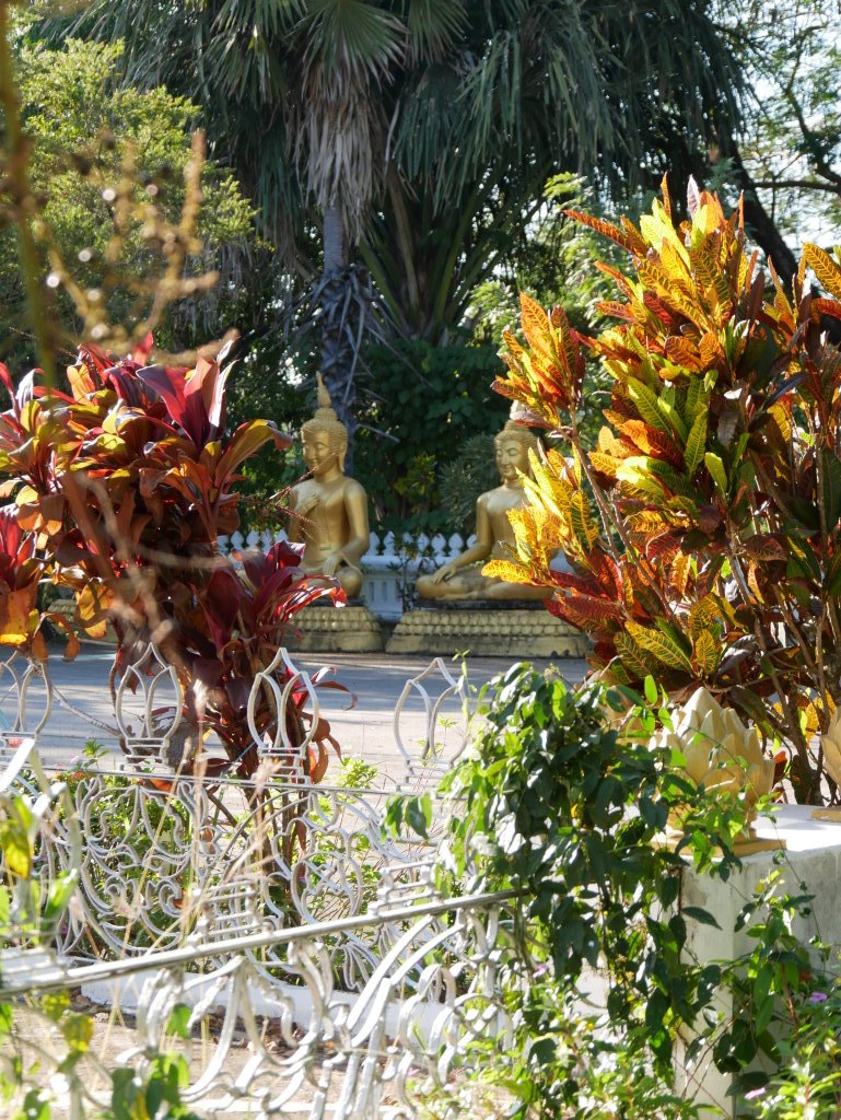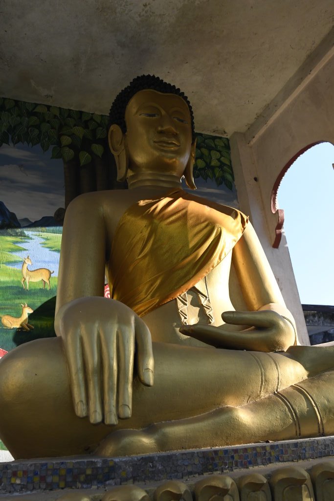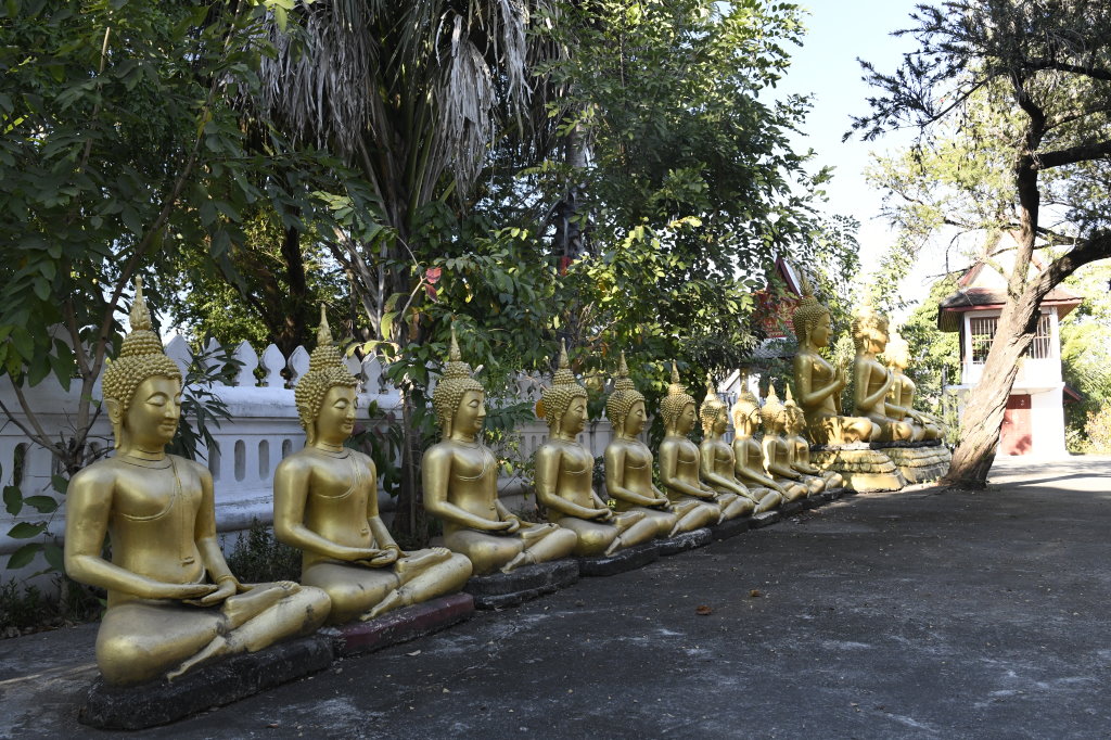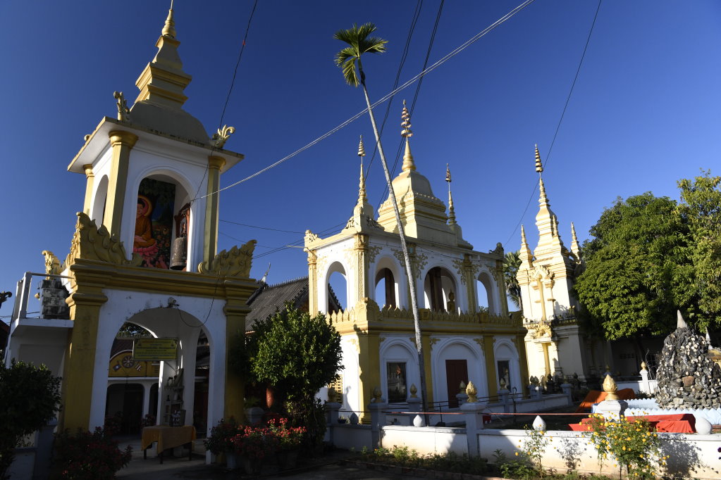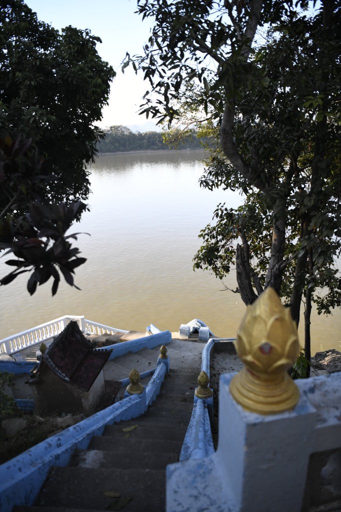 Für heute beenden wir unser diesjährigen Luang Prabang Besuch mit einem letzten Wat-Besuch im zehn Minuten vom Wat That entfernten Wat Pha Bat Tai am Ufer des Mekong.