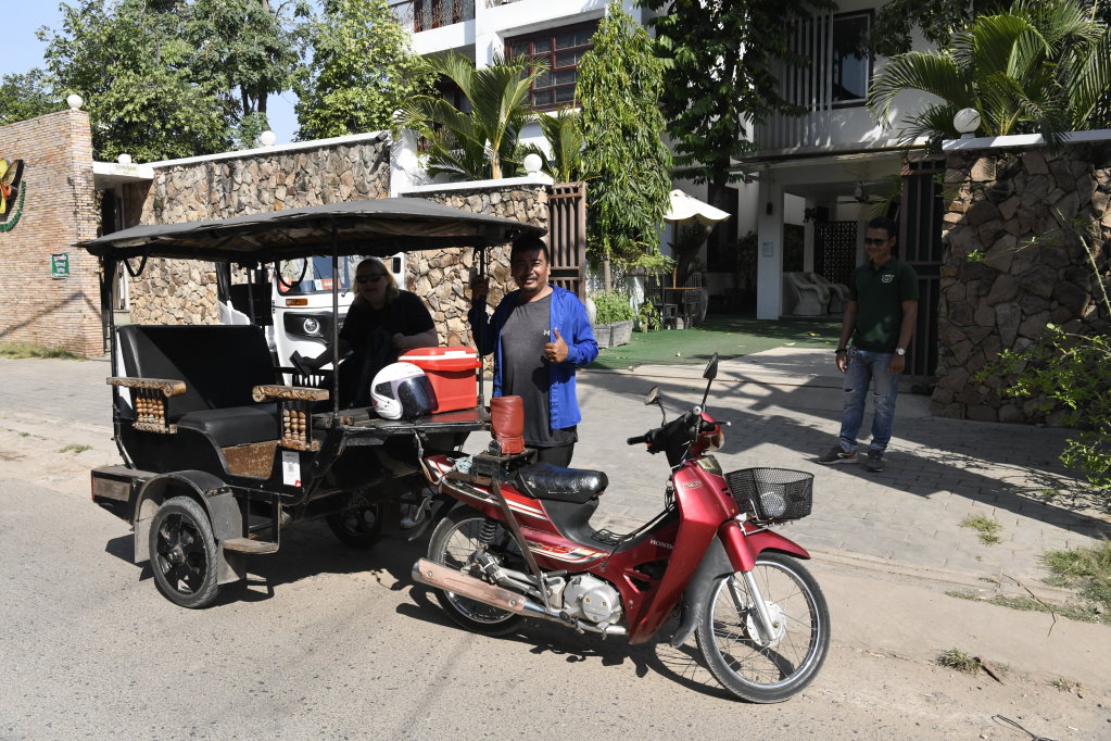 Wir haben mit Sou verabredet, uns auf der gegenüberliegenden Seite am East Gate mit seinem Tuk-Tuk einzusammeln. Bei einer Temperatur von 34 Grad Celsius wird der Weg dann doch ein wenig lang. Zum Glück können wir ihn per WhatsApp erreichen und er kommt uns im äußeren hinteren Bereich auf den letzten hundert Metern so weit entgegen, wie es ihm die Parkwächter gerade noch erlauben.