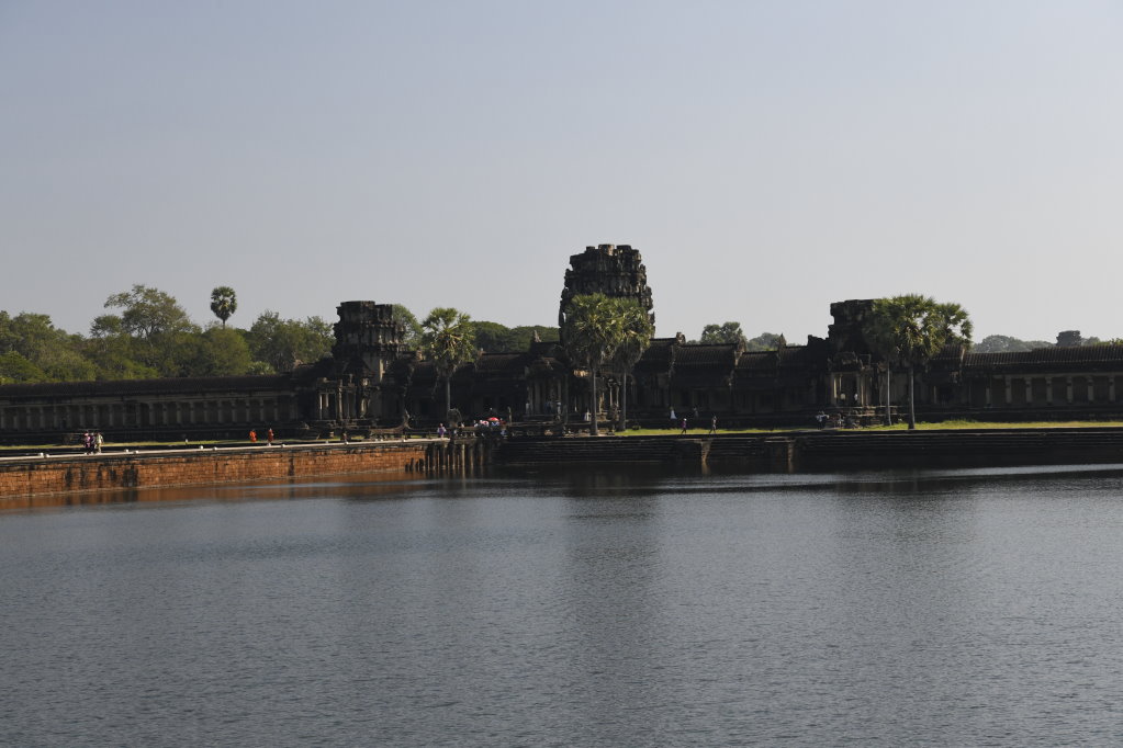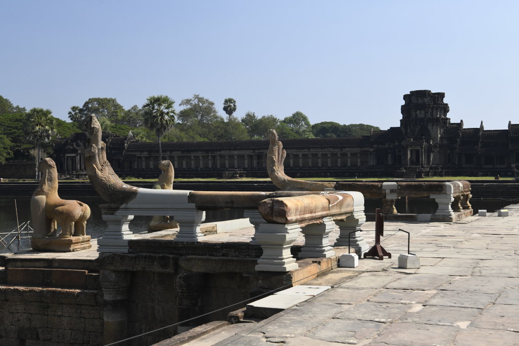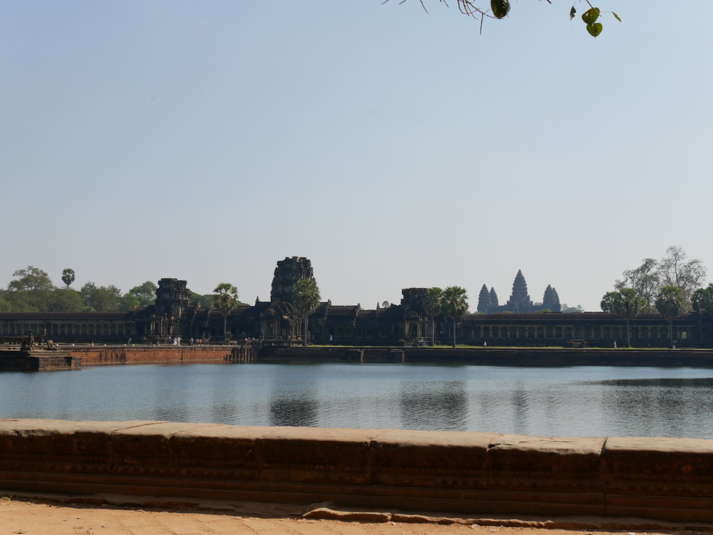 Wir starten unsere Tour ganz klassisch mit der Besichtigung des Angkor Wat, der von einem breiten Wassergraben umgeben wird. Eine breite Brücke am westlichen Eingang führt zu dem großen Tempelkomplex. Parallel wäre auch der Weg über eine im Wasser schwimmende Behelfsbrücke möglich. „No go!“ Der Parkwächter ist unerbittlich. Die schwimmenden Pontons dürfen nur in einer Richtung überquert werden.