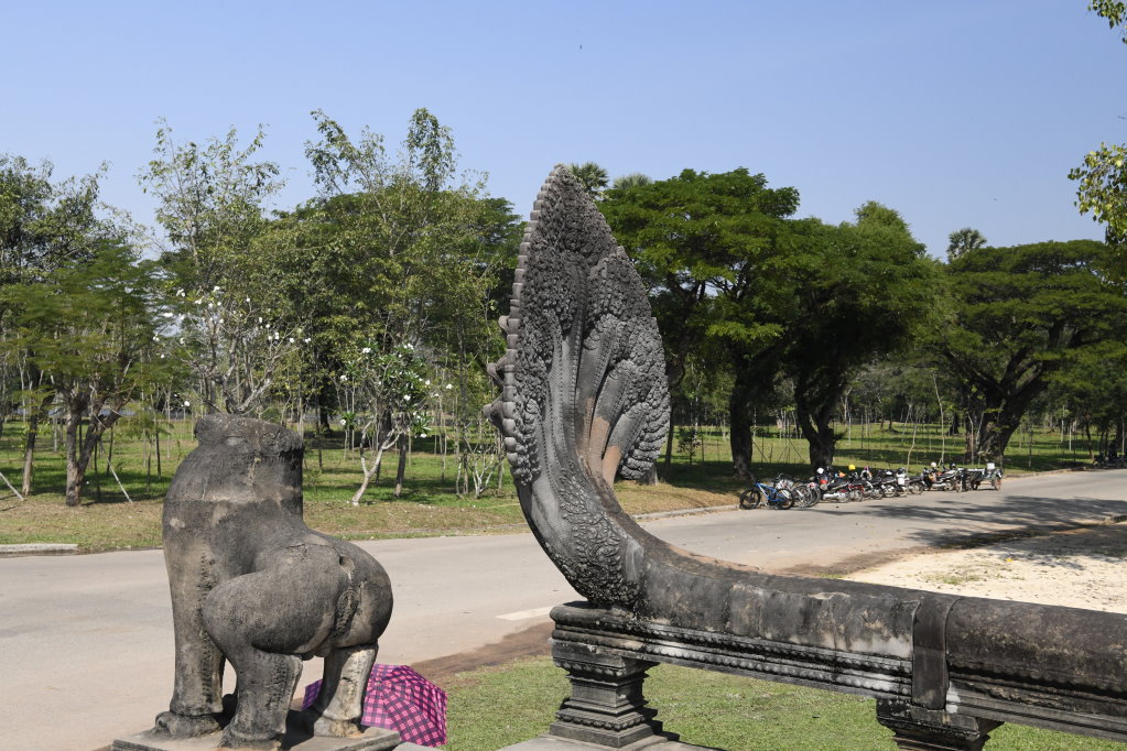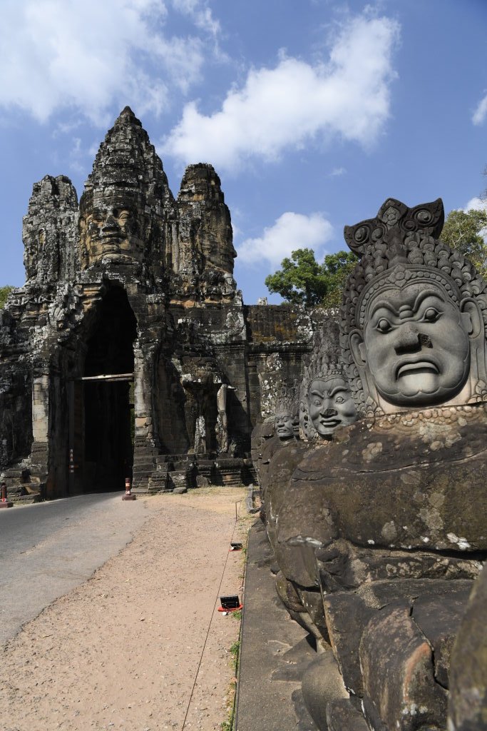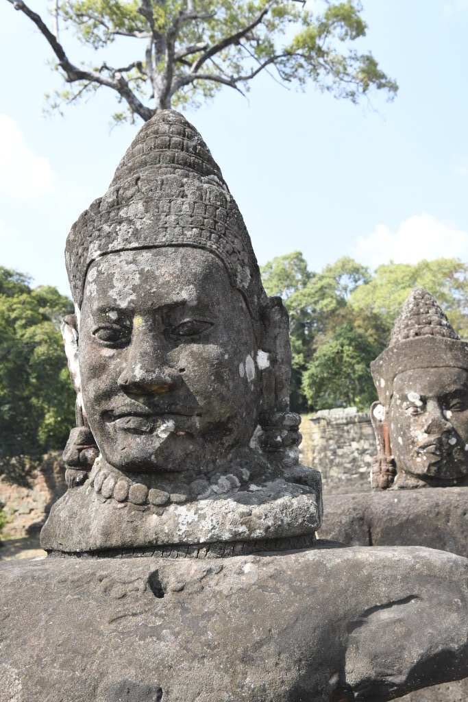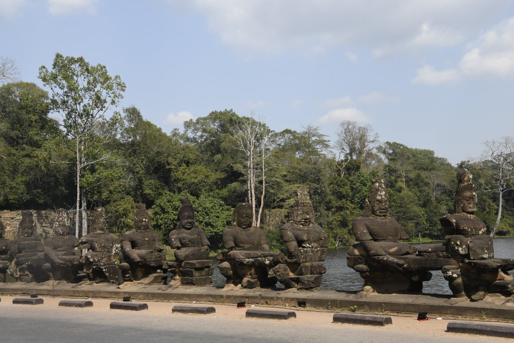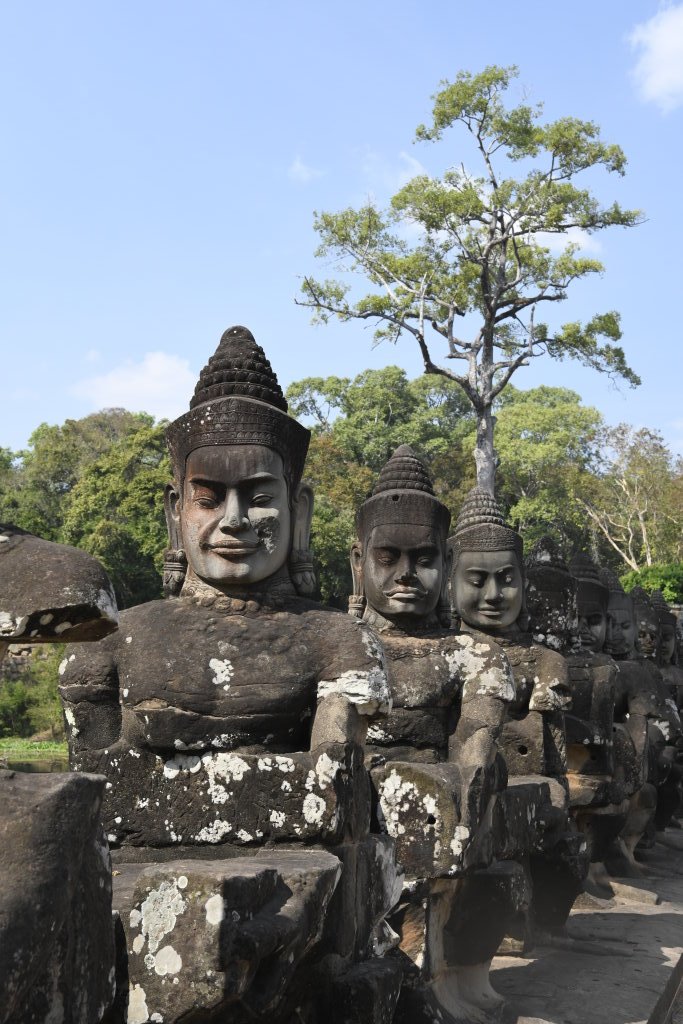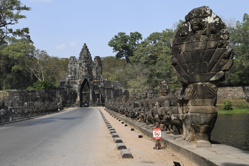 Der warme Fahrtwind weht uns um die Nase, als wir über die Brücke zum Elefantentor in Richtung Bayon Tempel fahren. Nur ein paar Mopedfahrer, Tuk-Tuks und PKW sind mit uns unterwegs. Das ist jetzt die Gelegenheit, um ein paar ungestörte Aufnahmen der Brückengeländer zu machen: Zahlreiche Khmer Krieger reiten auf einer gewaltigen Naga-zum Tor. Die Skulpturen wurden in den letzten Jahren gründlich restauriert. Die graue Farbe der ergänzten Teile zeigt deutlich, wie behutsam hier versucht wird, aus den vorhandenen Resten das ursprüngliche Ensemble wieder entstehen zu lassen.