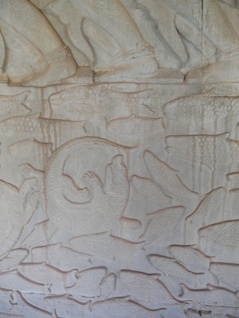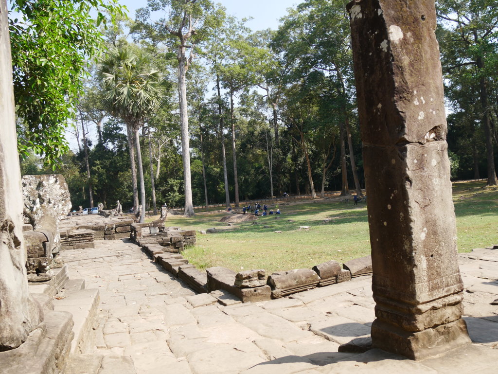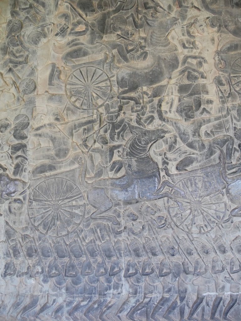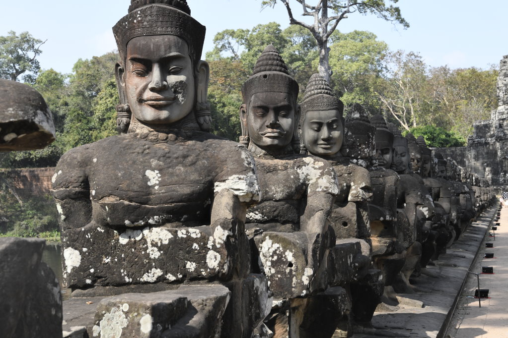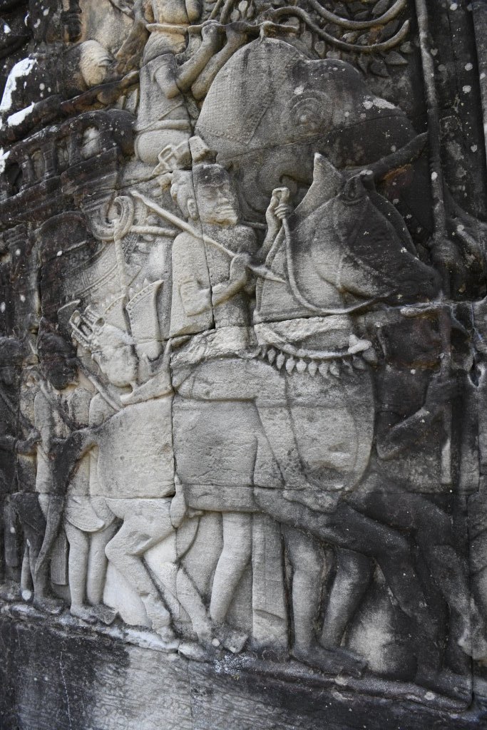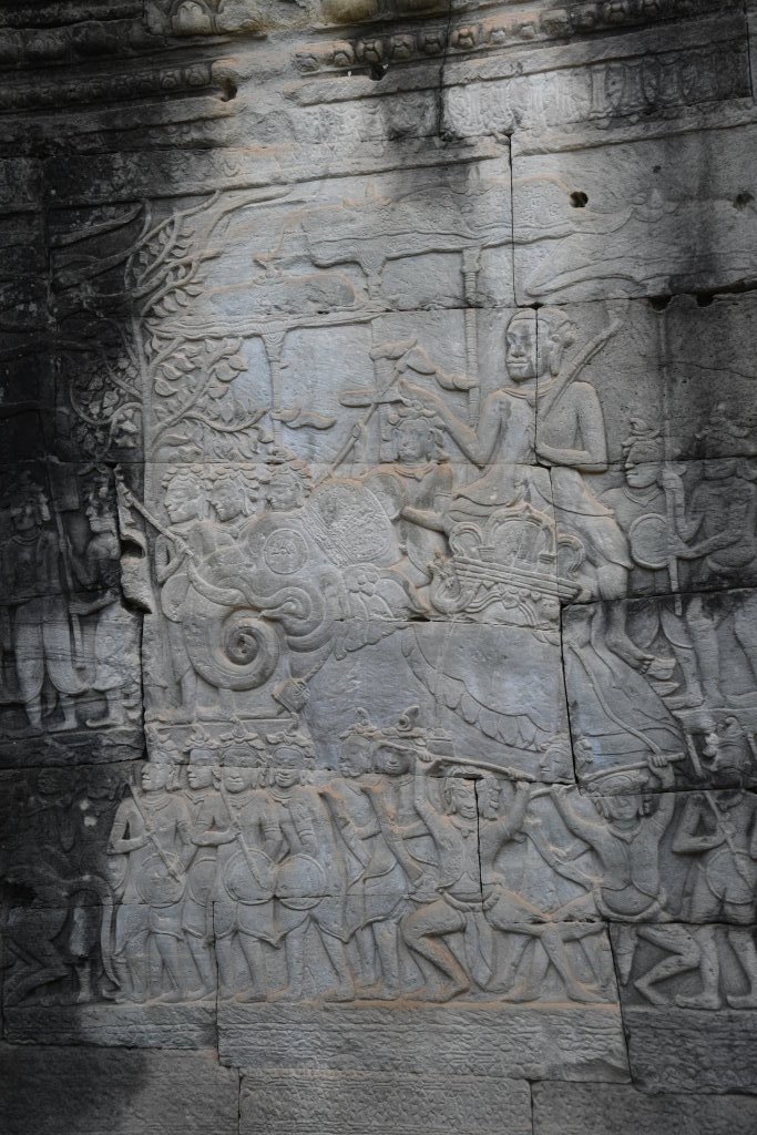 Der warme Fahrtwind weht uns um die Nase, als wir über die Brücke zum Elefantentor in Richtung Bayon Tempel fahren. Nur ein paar Mopedfahrer, Tuk-Tuks und PKW sind mit uns unterwegs. Das ist jetzt die Gelegenheit, um ein paar ungestörte Aufnahmen der Brückengeländer zu machen: Zahlreiche Khmer Krieger reiten auf einer gewaltigen Naga-zum Tor. Die Skulpturen wurden in den letzten Jahren gründlich restauriert. Die graue Farbe der ergänzten Teile zeigt deutlich, wie behutsam hier versucht wird, aus den vorhandenen Resten das ursprüngliche Ensemble wieder entstehen zu lassen.