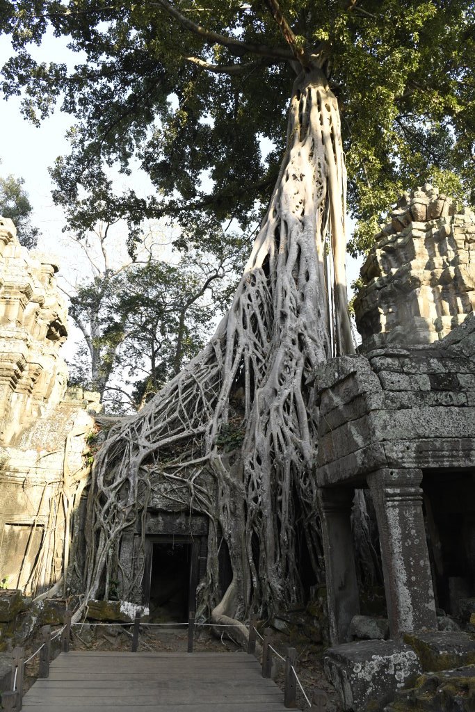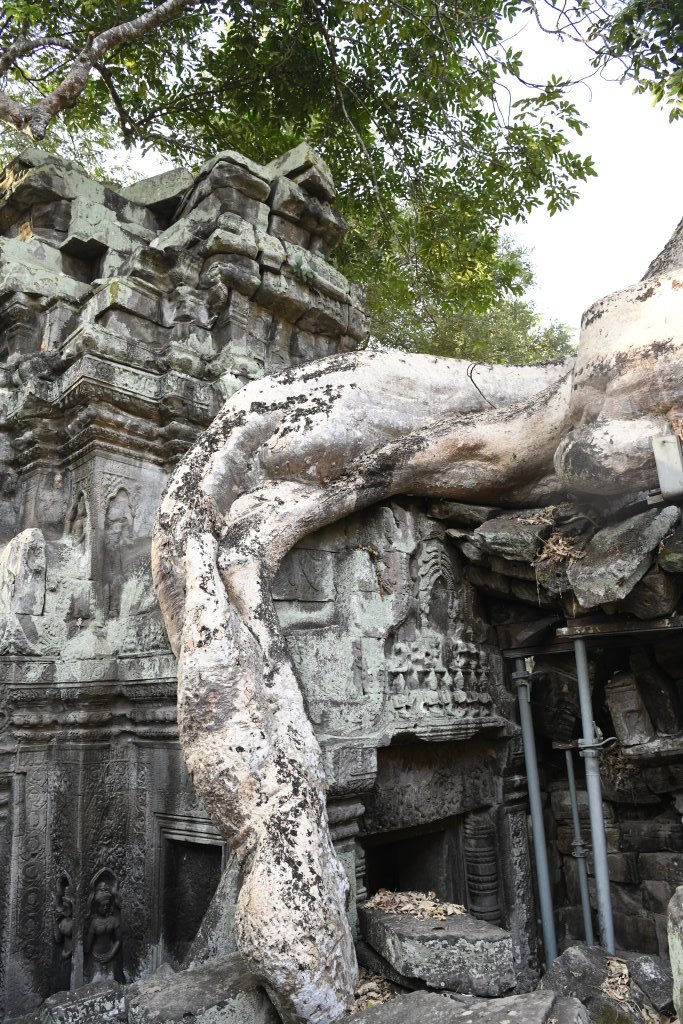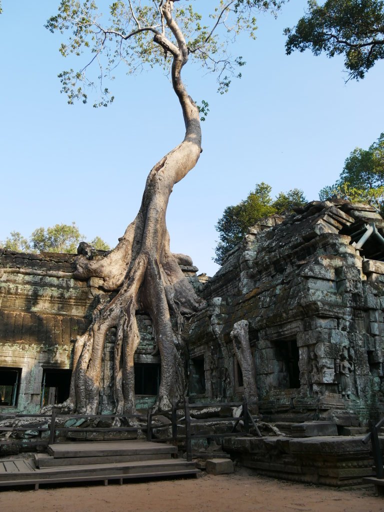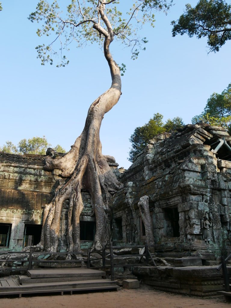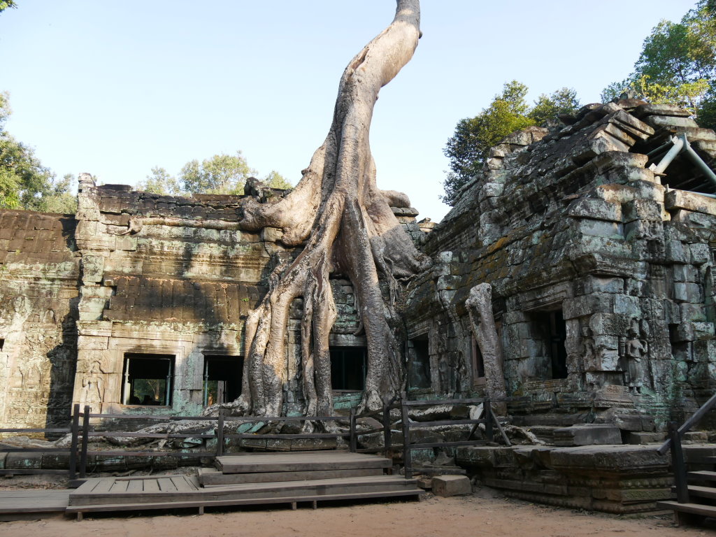 Nach einem kurzen Zwischenstopp mit viel frischen Mangos, Ananas und Bananen in fester und flüssiger Form erreichen wir nachmittags gegen 16 Uhr einen weiteren Besucher-Magnet. Der Ta Prohm Tempel mit seinen halbverfallenen Ruinen ist durch den Film „Tomb Raider“ weltweit berühmt geworden. Die Würgfeigen und die gewaltigen Wurzeln der Tetrameles nudiflora scheinen die Ruinen sowohl zusammenzuhalten als auch zu sprengen.