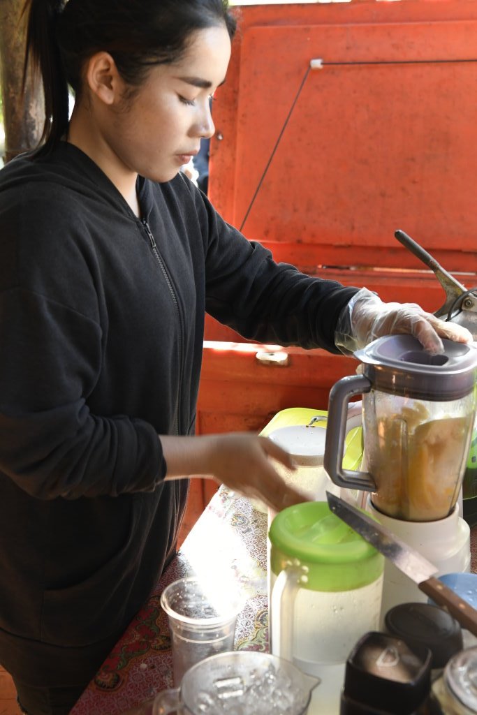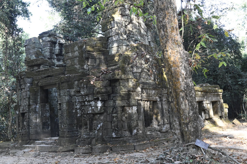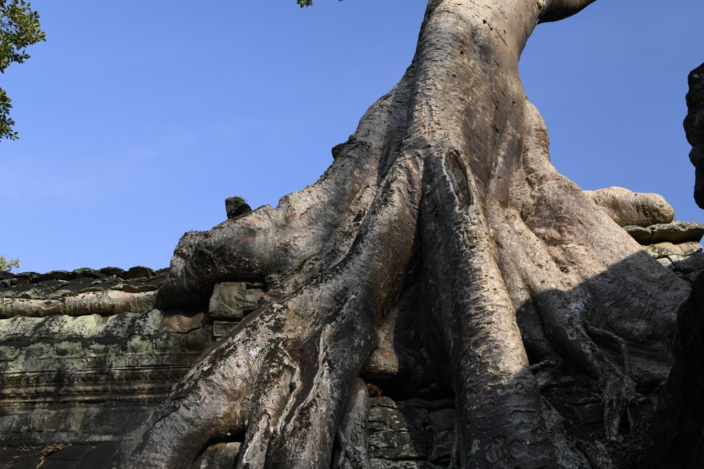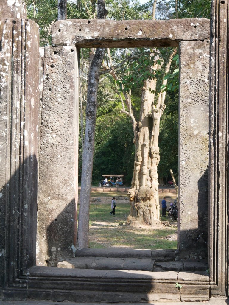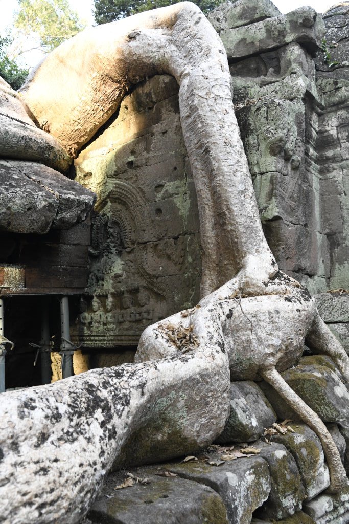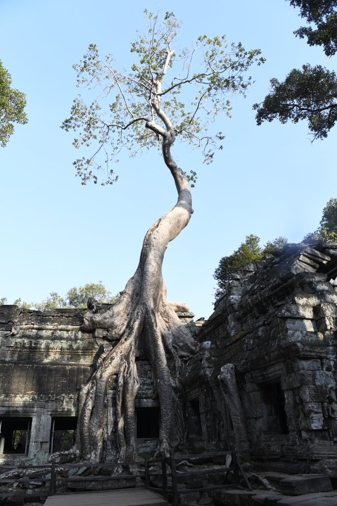 Nach einem kurzen Zwischenstopp mit viel frischen Mangos, Ananas und Bananen in fester und flüssiger Form erreichen wir nachmittags gegen 16 Uhr einen weiteren Besucher-Magnet. Der Ta Prohm Tempel mit seinen halbverfallenen Ruinen ist durch den Film „Tomb Raider“ weltweit berühmt geworden. Die Würgfeigen und die gewaltigen Wurzeln der Tetrameles nudiflora scheinen die Ruinen sowohl zusammenzuhalten als auch zu sprengen.