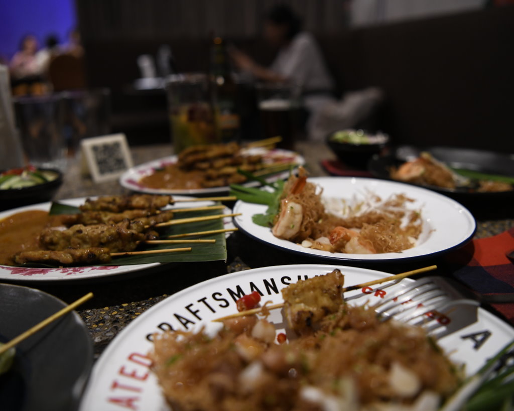 Das e-ga LAB hatte uns bereits am Vormittag mit seinen Kuchen gelockt. Heute Abend fällt die Wahl auf knusprige Nudeln mit Shrimps und einer als Vorspeise deklarierten Riesenportion Saté-Spießchen. Nach einem geteilten Stück Kuchen nach Art Tiramisu, haben wir uns für heute nicht nur satt gesehen sondern auch üppig gegessen.