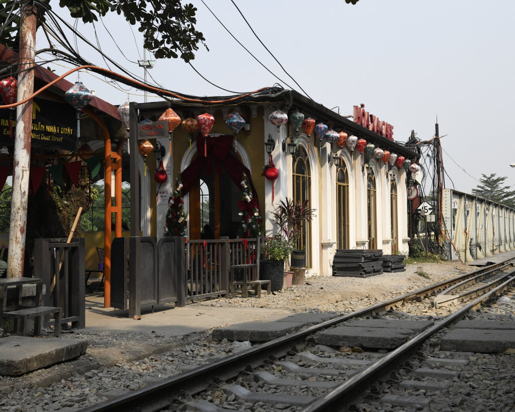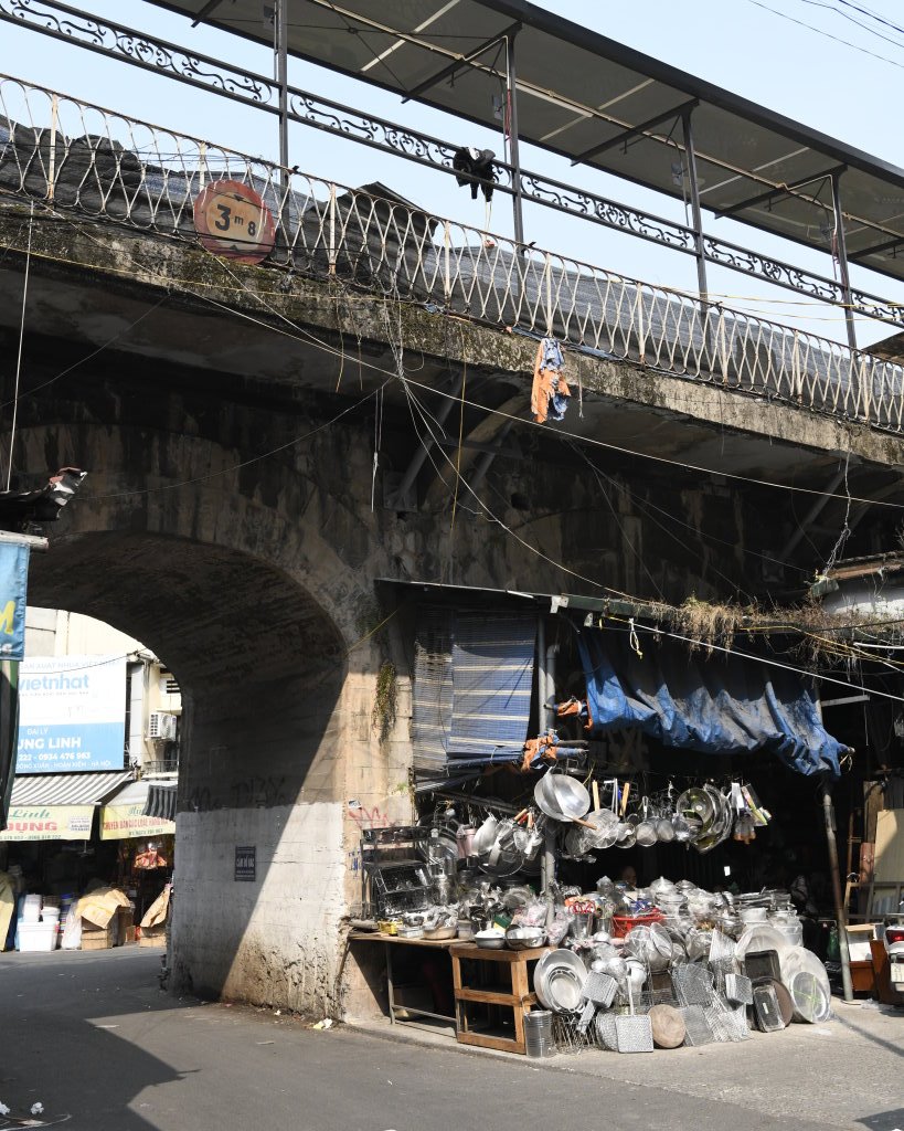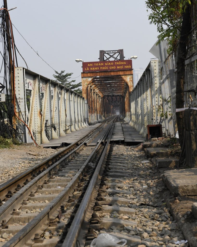Nicht weit entfernt vom Markt queren wir die Gleise der vietnamesischen Eisenbahn, die sich als Hochbahn über unseren Köpfen einen Weg durch die Häuserzeilen bahnt. Im Moment ist kein Zug in Sicht, so dass ich unbehelligt über eine Treppe zu den Gleisen auf der Long Biên Brücke steigen kann, um ein paar Fotos zu machen.