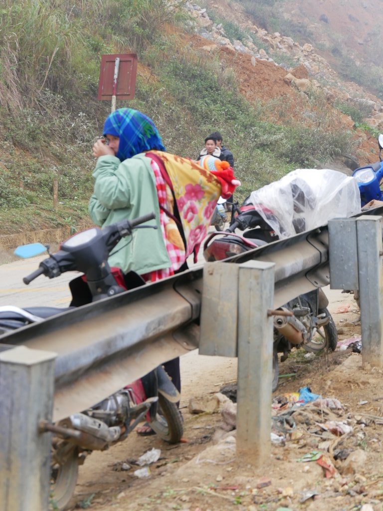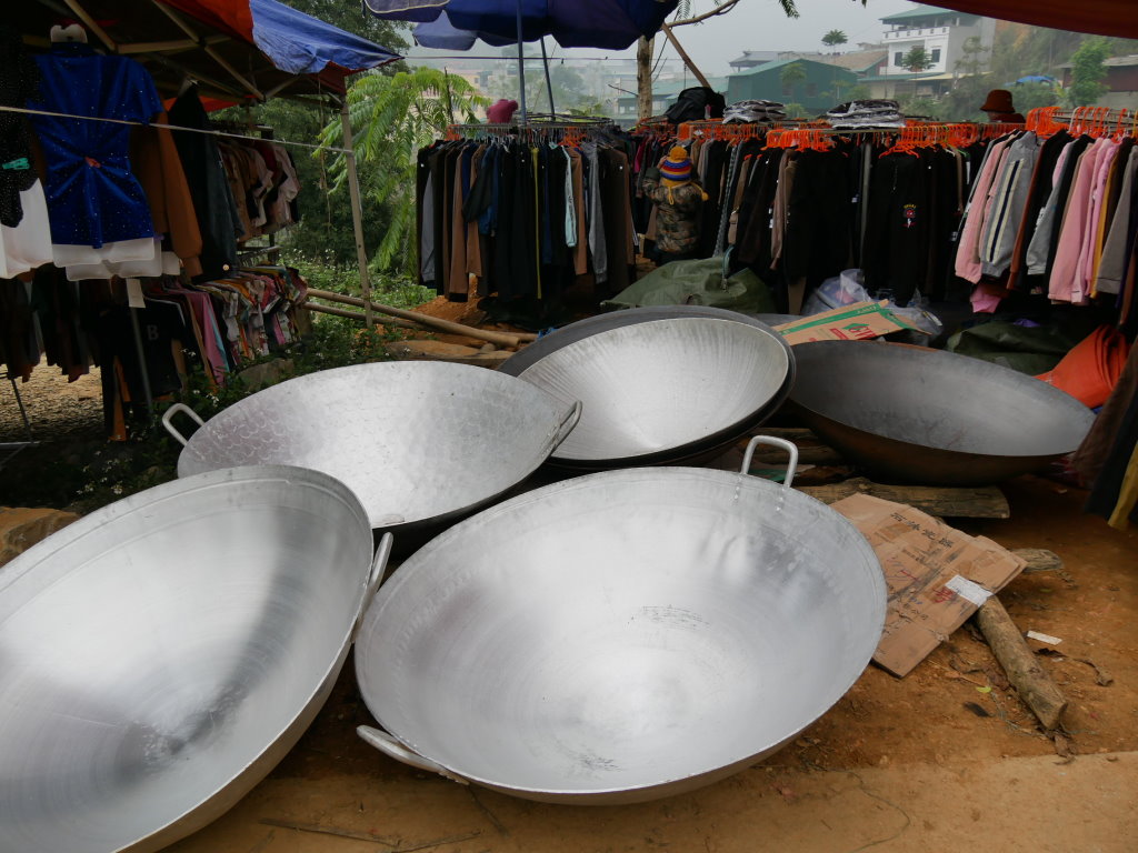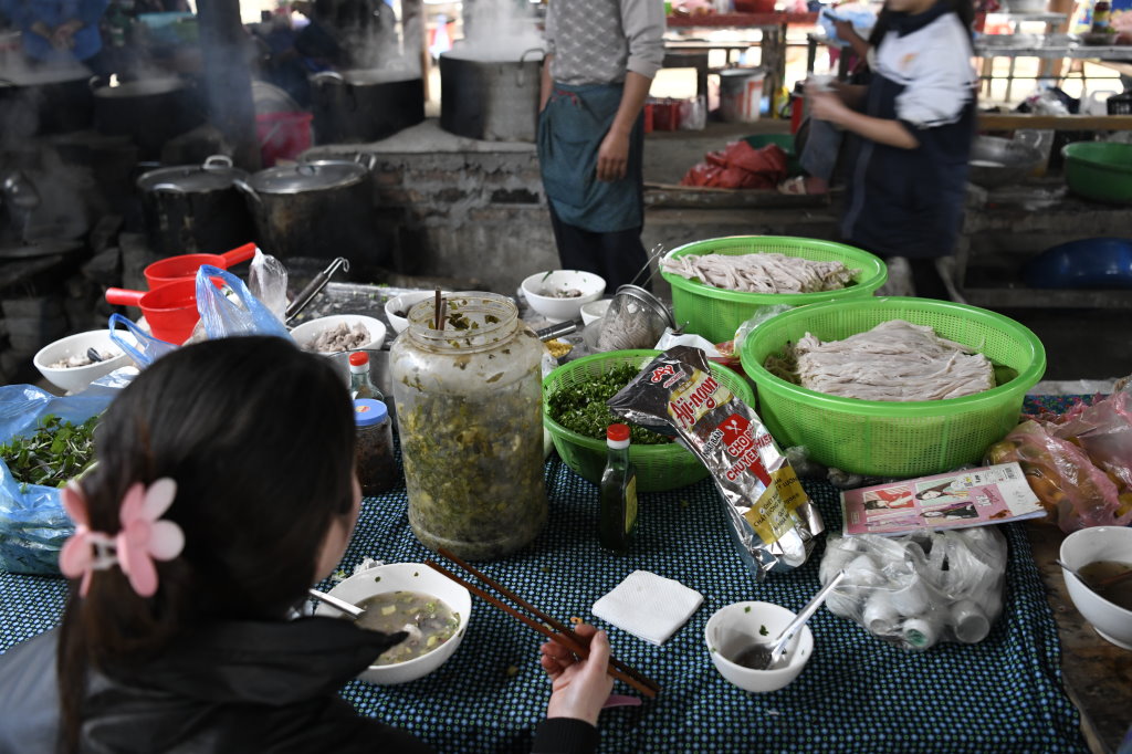 Zwei Stunden später haben wir genug gesehen und wollen weiterfahren. Doch von unserem Fahrer ist am Treffpunkt nichts zu sehen. Nach mehreren Versuchen gelingt es per WhatsApp mit seinem Chef Bao Kontakt aufzunehmen, der ihn gleich anweist, sich auf den Weg zu machen. Nachdem es auf dem Markt nur Nudelsuppe gab und wir vergeblich nach Schmalzgepäck zum Frühstück gesucht haben, haben wir in Bắc Hà mehr Glück und mümmeln vergnügt einen Banana-Pancake.