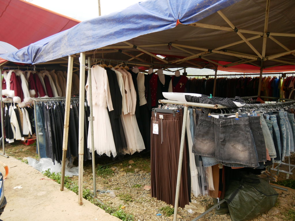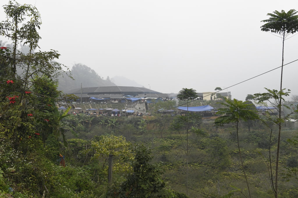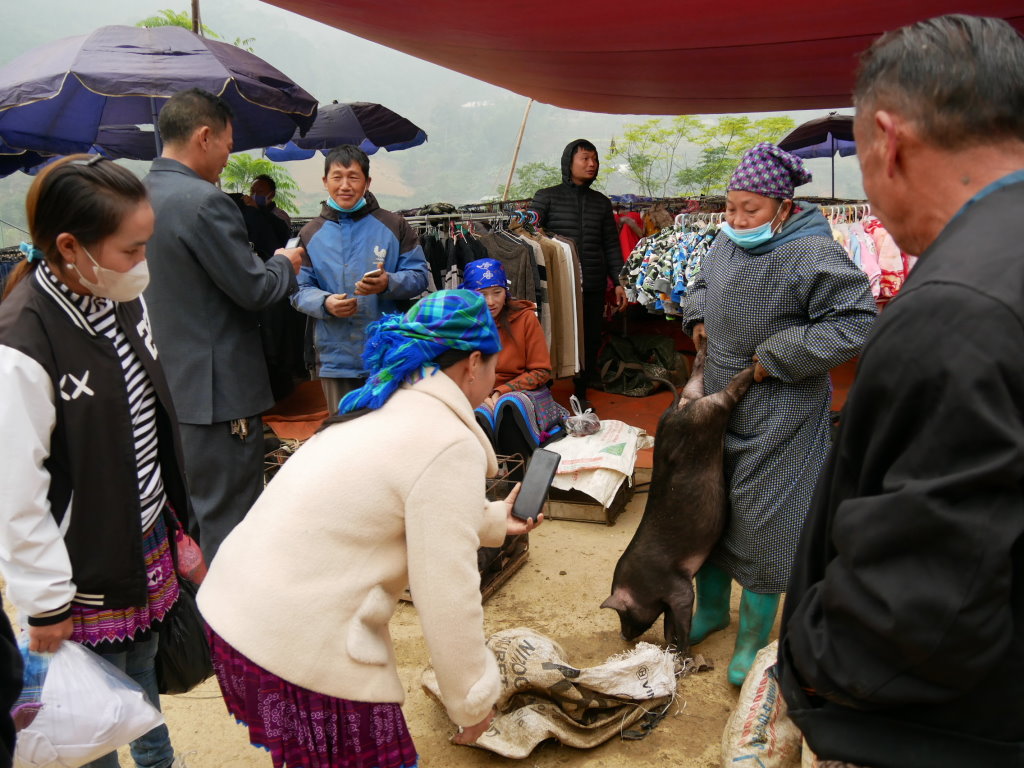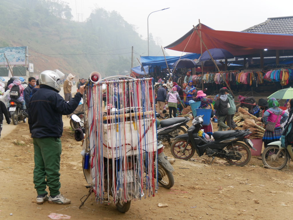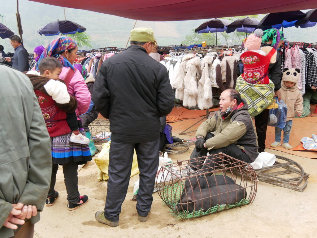 Um halb Acht klingelt der Wecker. Schnell geduscht und angezogen und runter in die Lobby, unser Fahrer wartet schon. Wieder geht es über eine Schotterpiste Richtung Norden. Nach einer halben Stunde sind wir am Ziel. Dong Tai verspricht uns, uns gegen 10 Uhr wieder an derselben Stelle einzusammeln. Bis direkt zum Samstagsmarkt von Si Ma Cay darf er nicht vorfahren.