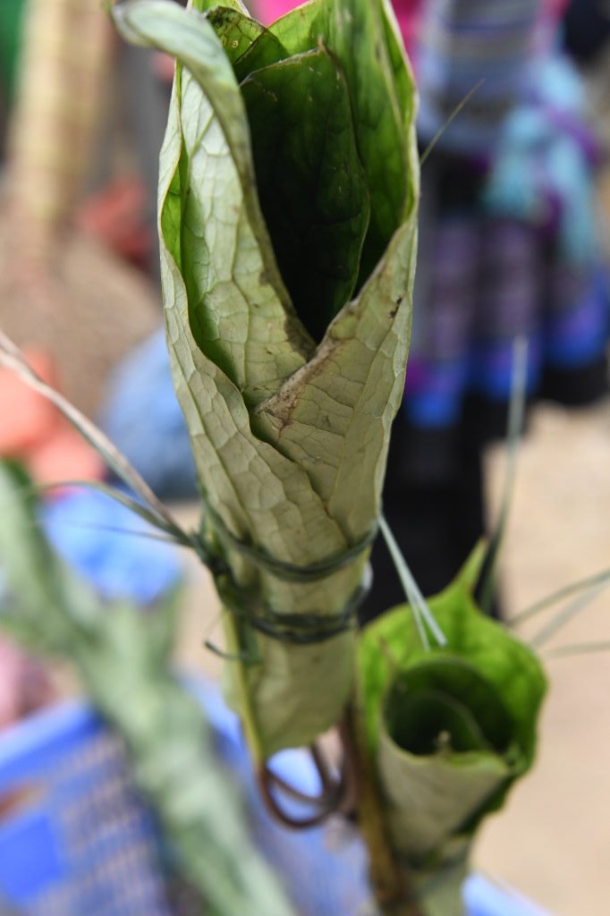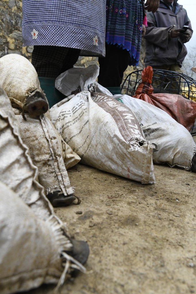 Wir marschieren los und stürzen uns gleich ins Getümmel. Auf dem unteren Level sind die Gemüse- Obst- und Tierhändler. Sie gehen nicht gerade zimperlich mit der Ware um, die kleinen Schweine werden einfach in einen Jutesack gesteckt, der vorne für die Schnauze ein wenig geöffnet und hinten zusammen gebunden ist.