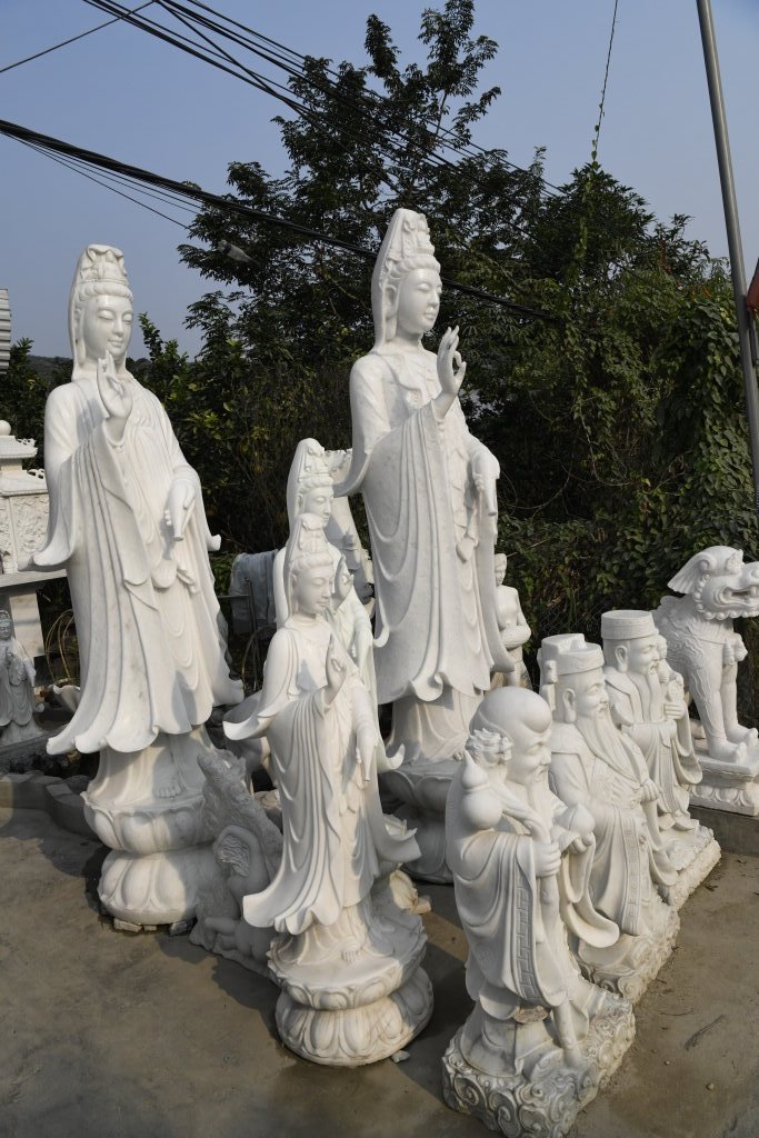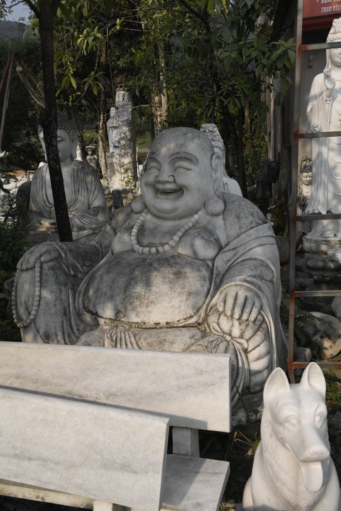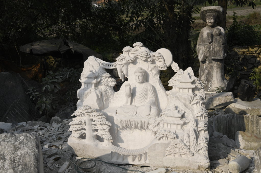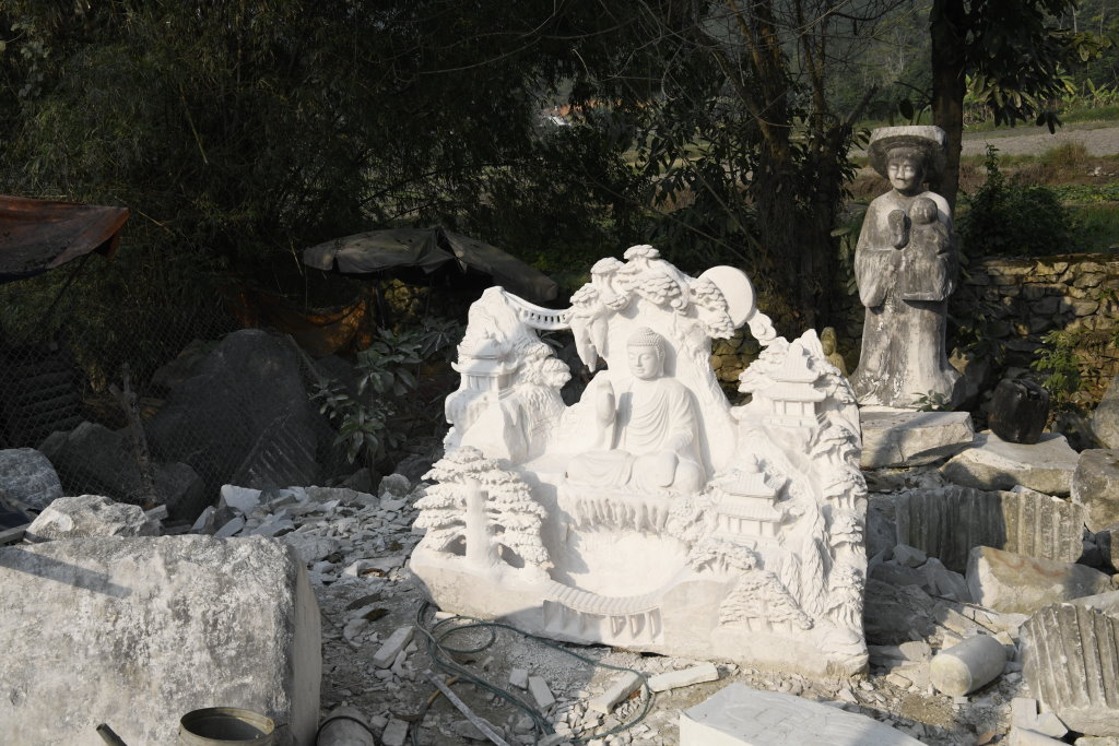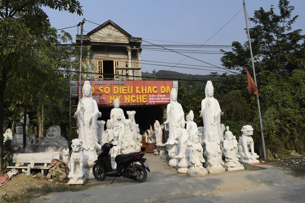 Unterwegs passieren wir den Marmorsteinbruch von Yên Luc und halten kurz bei einem der zahlreichen Steinmetze entlang der Strecke. Die Arbeiter machen gerade Pause, aber ihr Chef zeigt mir stolz ihren Arbeitsplatz und die fast fertigen Skulpturen: Happy Buddhas, Lady Buddhas und diverse Fabeltiere.