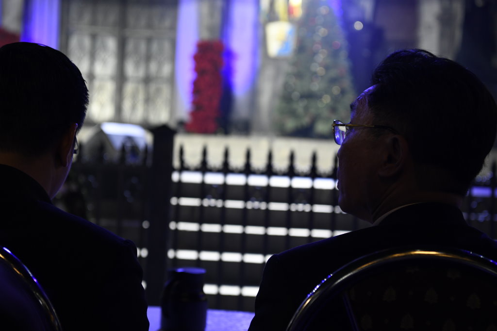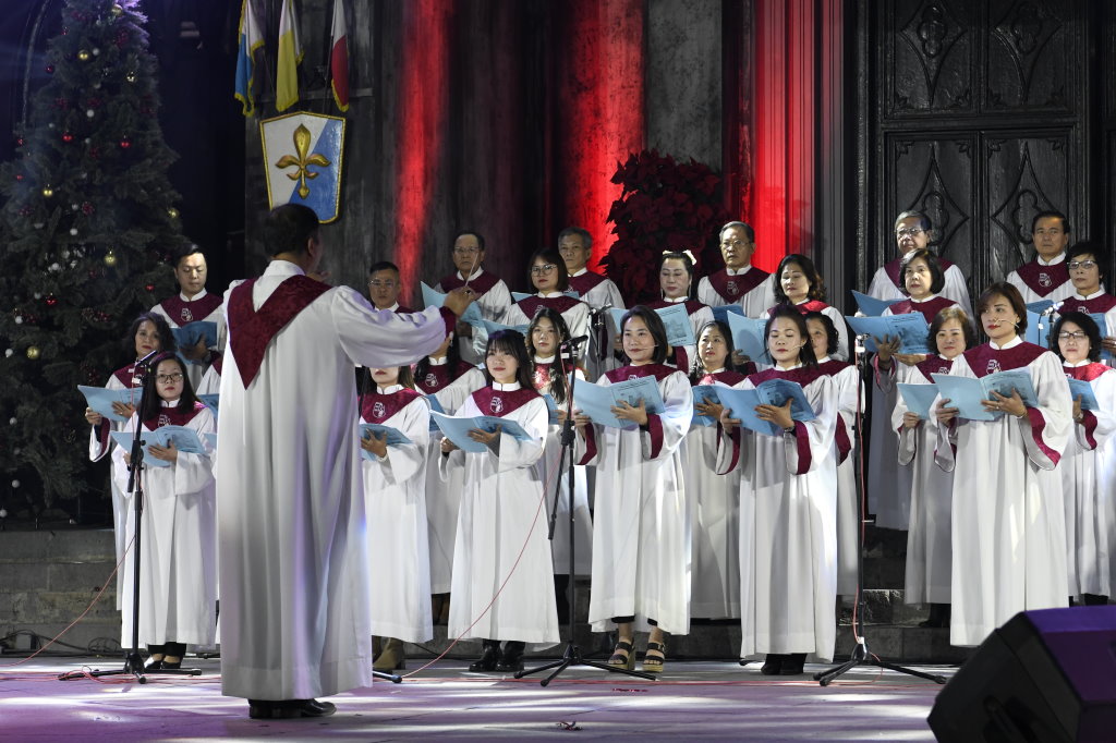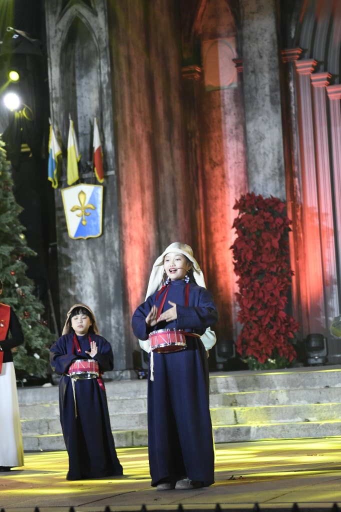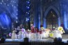 Unglaublich: wir erhalten einen Platz direkt hinter den Honoratioren der Gemeinde. Nach dem Tanz der Schneeflocken hält der Erzbischof eine kleine Ansprache, die wie alles andere auch, inklusive kurzer Filmeinspieler auf zwei Großbildwände übertragen wird, damit die Menschen ohne gute Sicht auf die Bühne auch alles mitbekommen.