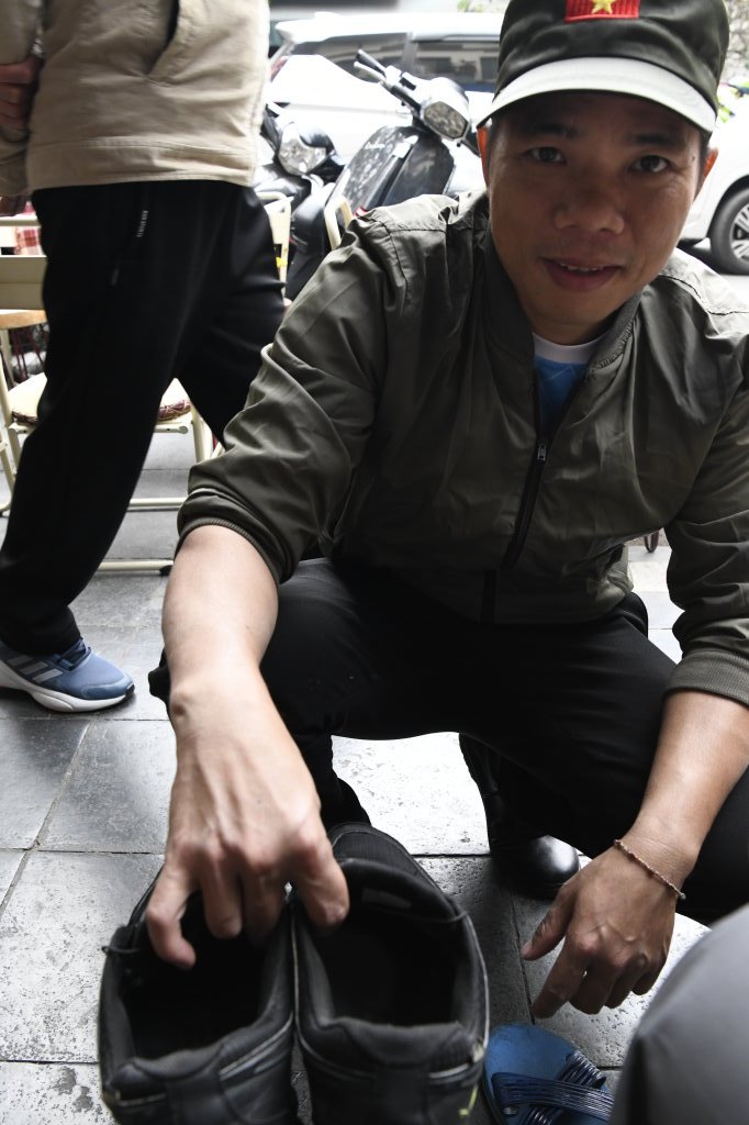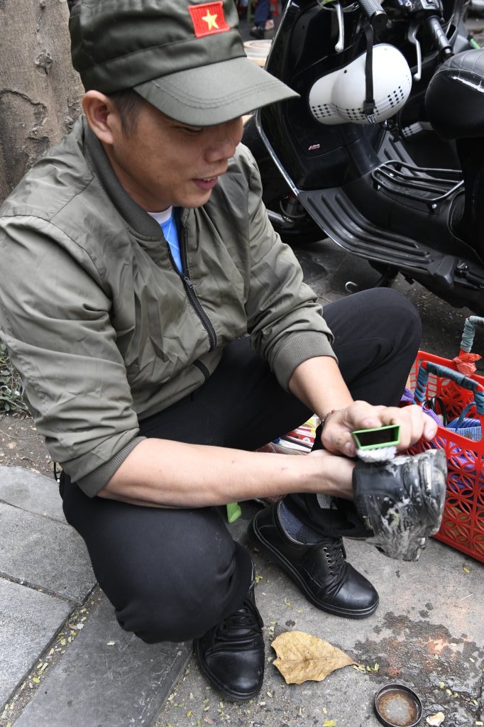 Kleines Intermezzo: Ein Schuhputzer bietet seine Dienste an. Für meine etwas ausgelatschten Trekking Schuhe ist es eigentlich längst zu spät: Aber er insistiert so lange, bis ich ihn einfach mal machen lasse. Und für knapp 2 Euro (50.000 Dong bringt er die altgedienten, reiseerprobten Treter tatsächlich zum Glänzen.