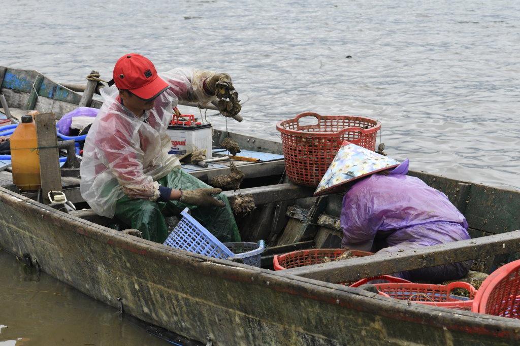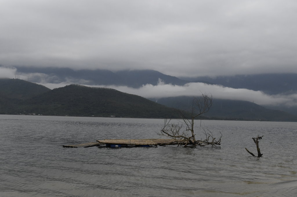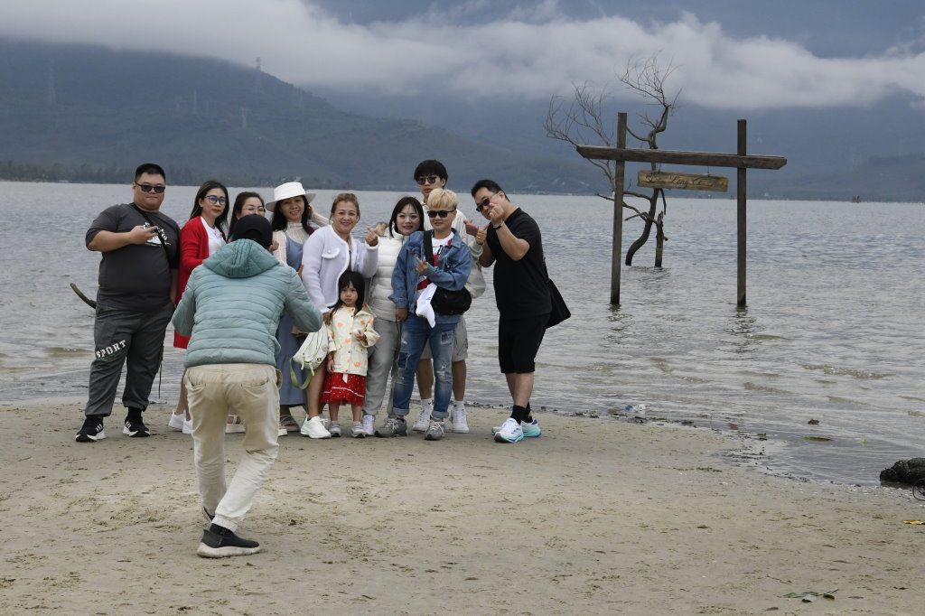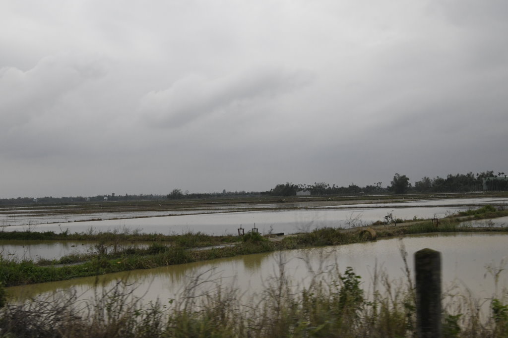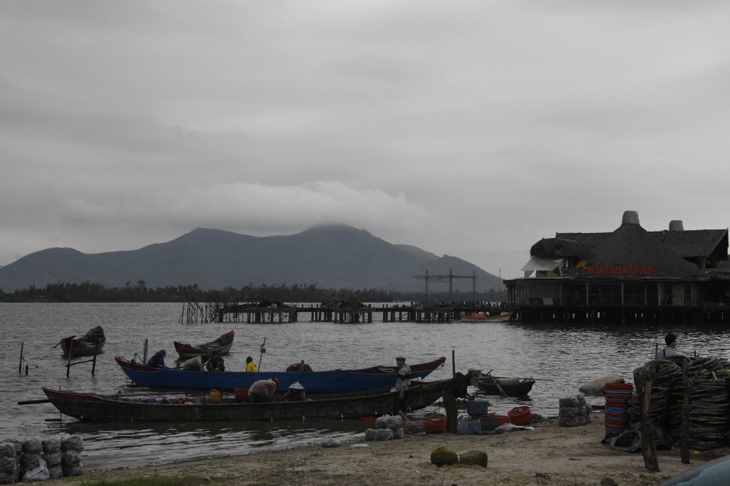 Die vierspurige Schnellstraße AH 1 verläuft zunächst parallel zur Bahnlinie durch die Ebene vor dem Truong-Son-Gebirge, dessen Gipfel sich noch in den Wolken verstecken. Bevor es hoch zum Hai Van Pass geht, machen wir auf halbem Weg bei Lập An einen kurzen Foto-Stopp bei den Austern-Fischern in der Bucht von Lang Co.