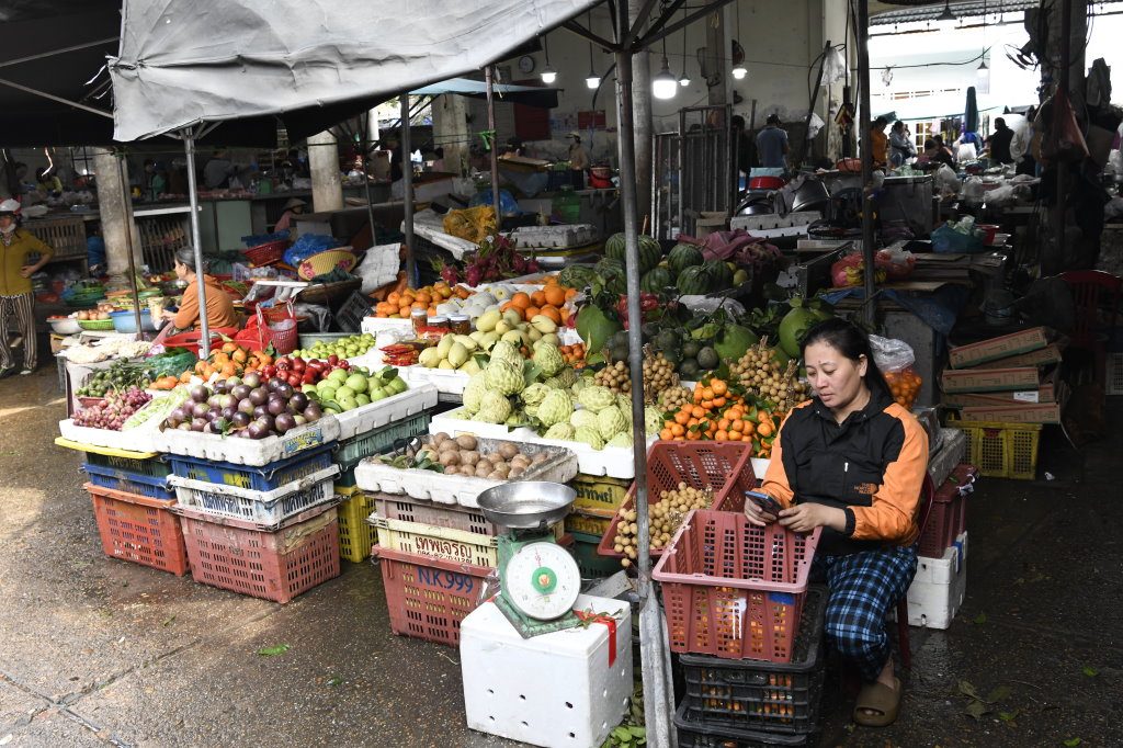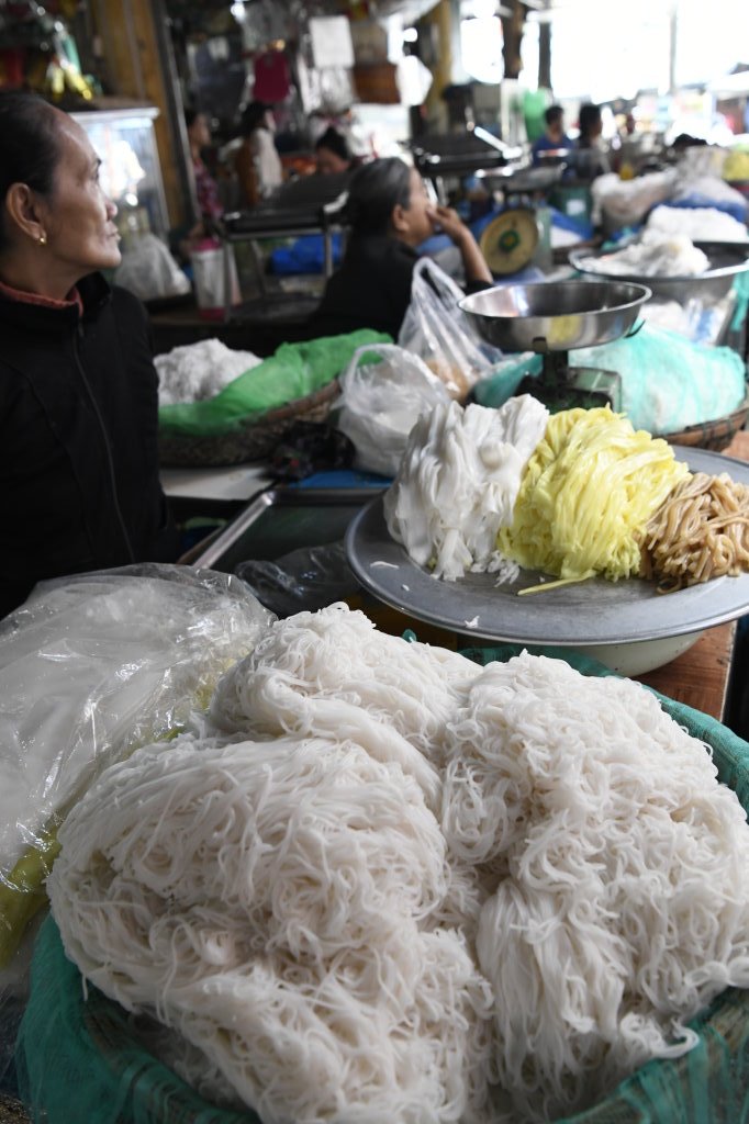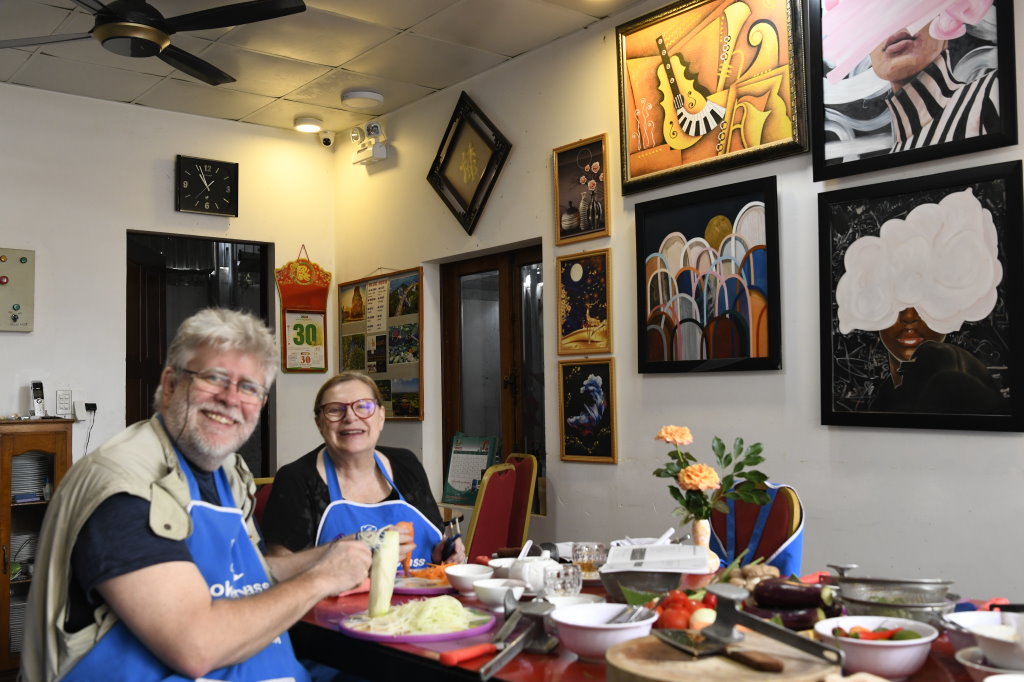 Und immer wieder „Mischen! mischen, mischen.“ Was in der deutschen Küche Kochlöffel, übernehmen hier extralange Stäbchen. Schalotten und Knoblauch werden zunächst mit der gezackten Seite des Fleischklopfers bearbeitet, bevor sie mit dem breiten Messer in feine Stückchen gehackt und geschnitten werden. Es geht uns um das Erlernen spezifischer Techniken, wenn wir auf unseren Reisen einen Kochkurs buchen.