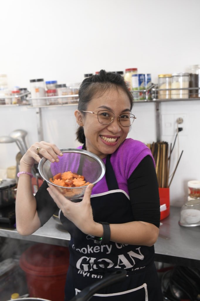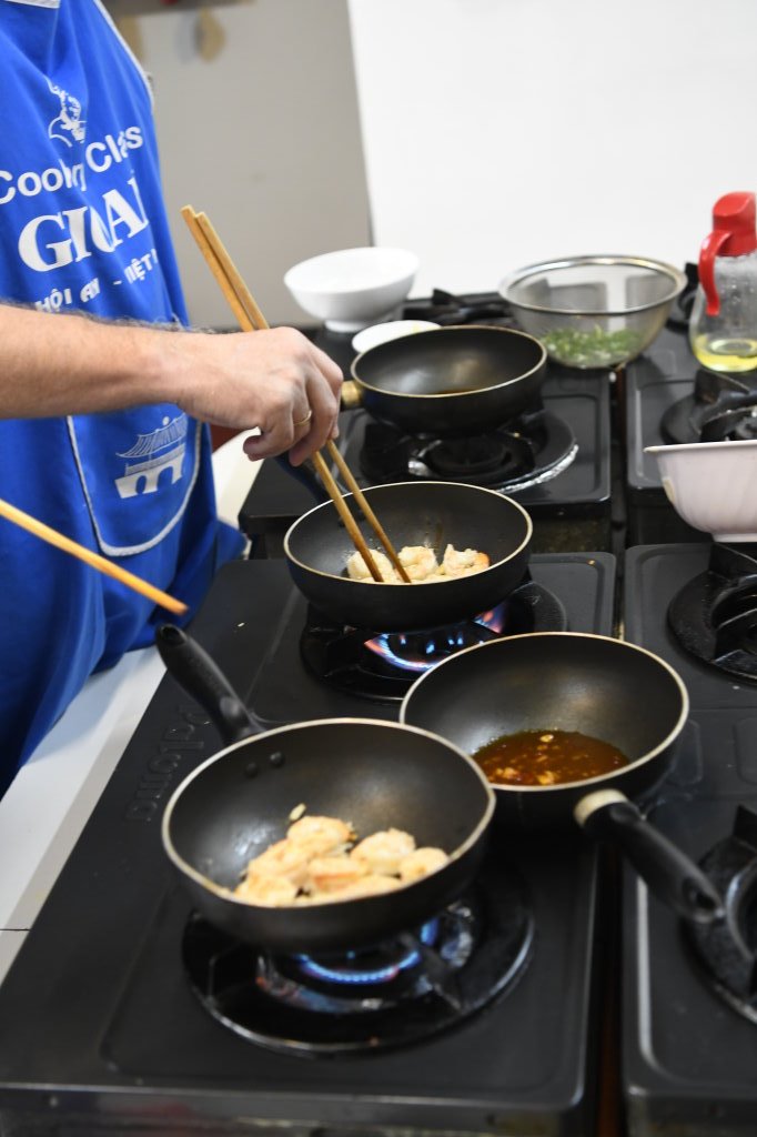 Heute müssen beliebte Pop-Songs dran glauben: „Take my Shrimp away“ trällert Vi Na munter eine um die aktuelle Zutat angereicherte Version des Top-Gun-Gassenhauers. Und immer wieder „Mischen! mischen, mischen“, Meeresfrüchte und Fleischstücke müssen gründlich von der Marinade umhüllt werden.