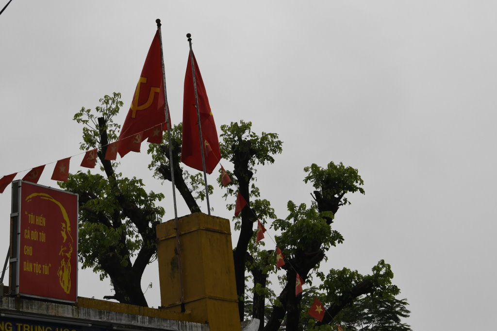 Du, ich glaub, es hat aufgehört. Sicher? Hoffentlich. Selbst auf den Nieselregen ist kein Verlass. Von dem Rot beflaggten Gebäude ein paar Gassen entfernt, dröhnen Parolen vom Fortschritt und Erreichten aus Lautsprechern. Heroische Musik, Erziehung und Einflussnahme akustisch, nicht digital.
