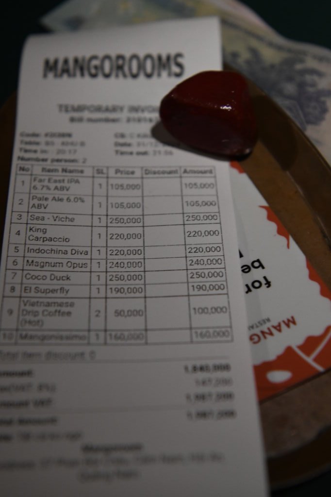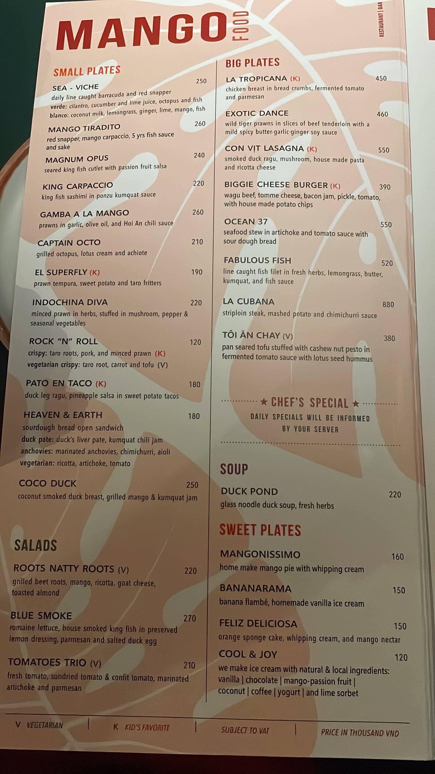 Jetzt noch schnell zurück zum Hotel und dann los zum reservierten Tisch für unser Abendessen zum Jahresende. Den Tipp fürs Mango Rooms bekamen wir von unserer Kochlehrerin: Vietnamesische Fusion Küche. Anstatt Dinner for One gibt‘s für uns heute ein Dinner for Two mit 2 mal 3 Vorspeisen plus Nachspeise im Mango-Style: Ob als Sea-Viche, Carpaccio, El Superfly oder Coco Duck. Etwas Mango ist immer dabei.