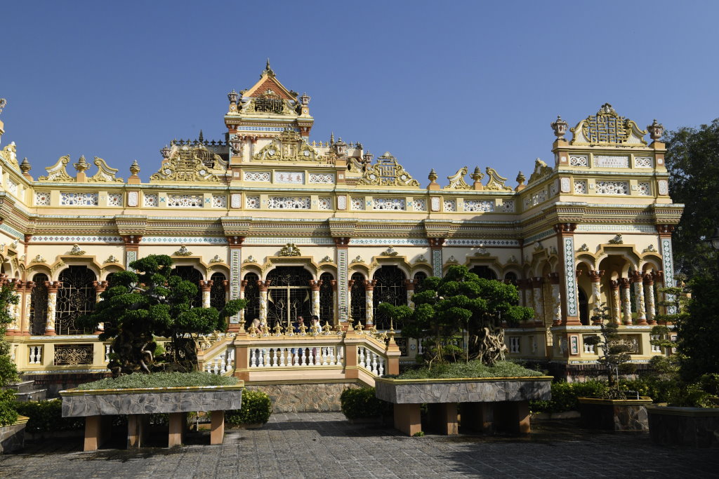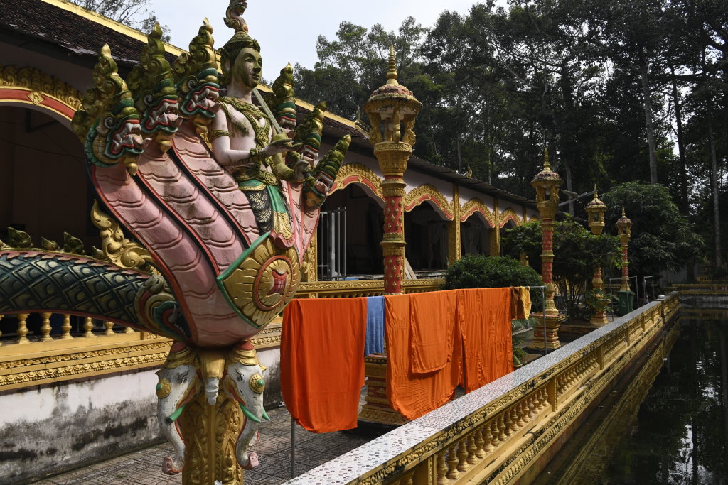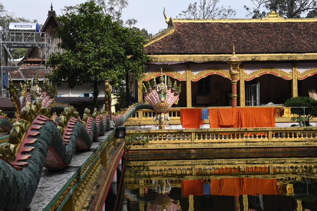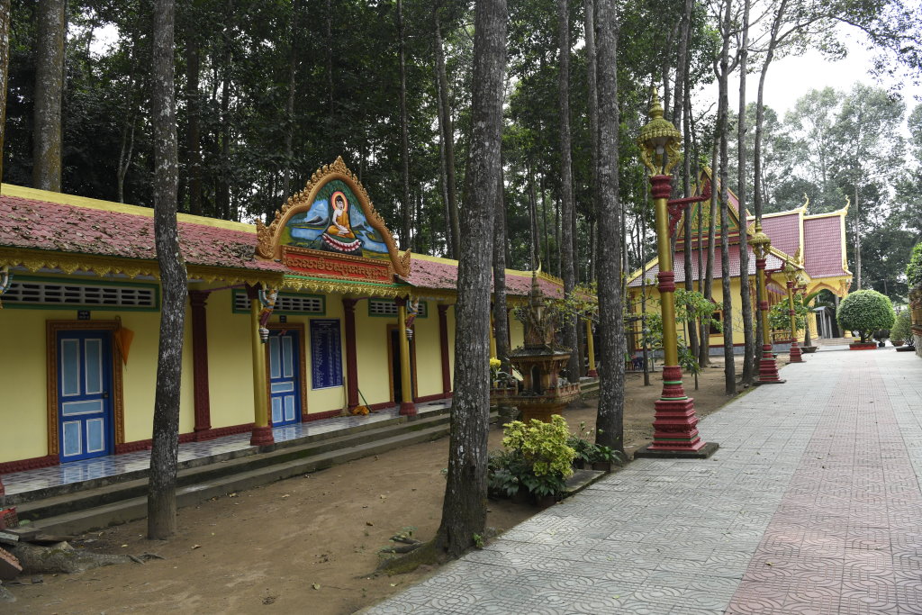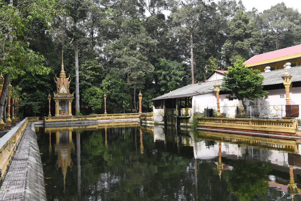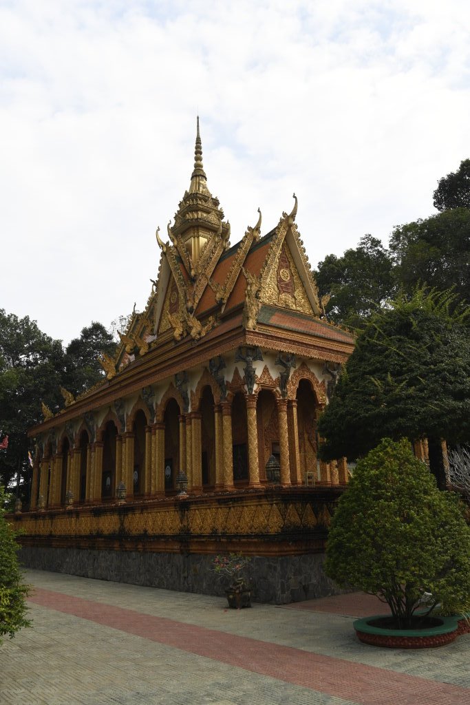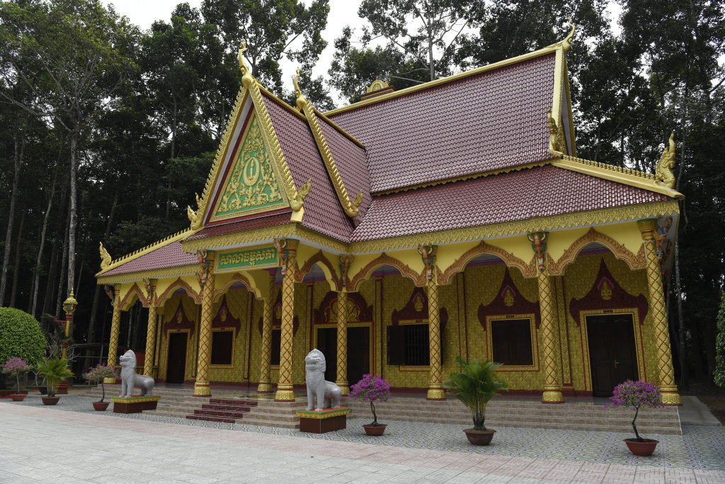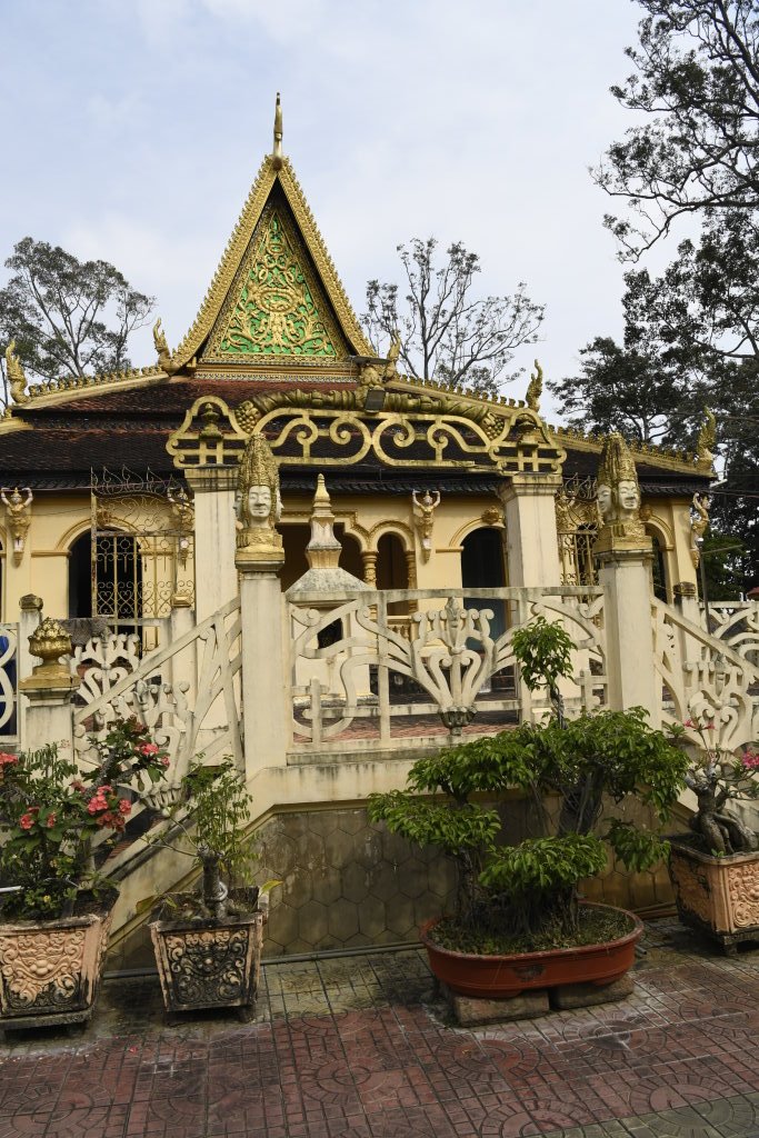 Ruhiger und beschaulicher wird es dann auf den letzten beiden Stationen unserer heutigen Tour. Rund um die Stadt Tra Vinh haben die Khmer ihre Spuren hinterlassen. Ihre Nachfahren prägen auch heute noch diese Region. Der buddhistische Koskeoseray-Tempel (vietnamesisch „Chùa“) scheint jüngeren Datums und wurde zuletzt 2010 gründlich renoviert. Hinter den Gebäuden „stolpere“ ich über einige Hanteln. Die jungen Mönche haben ihr Training gerade beendet und machen ein Nickerchen in der Hängematte weiter hinten im Wäldchen.