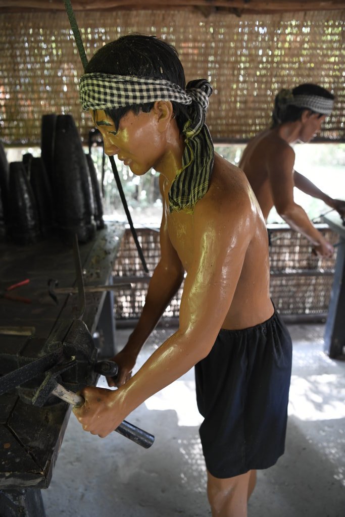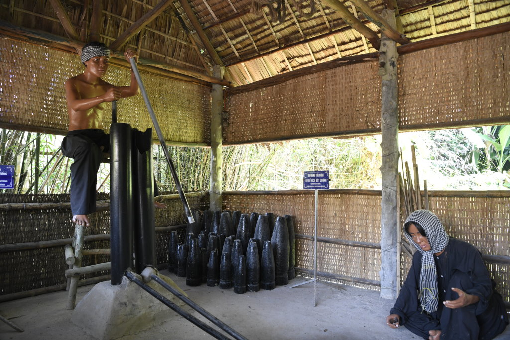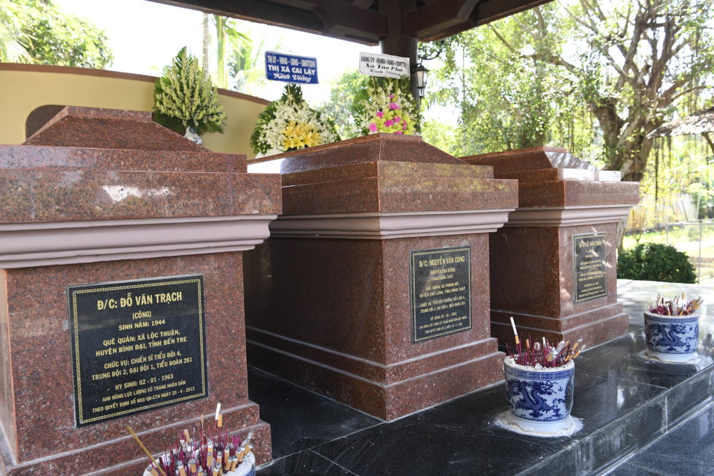 Keine fünf Kilometer entfernt Kontrastprogramm. Das Ấp Bắc Memorial erinnert an eine strategisch wichtige Schlacht des Vietnam-Kriegs vom2. Januar 1963. Neben dem Denkmal zeugen ein abgeschossener Bell UH-1 Iroquois, auch Huey genannt, das Wrack eines gepanzerten Mannschaftstransporters M113 sowie eine 105mm Haubitze vom Erfolg eines Bataillons der Nationalen Volksbefreiungsfront (Vietcong) gegen zahlenmäßig weit überlegene Truppen der Armee der Republik Vietnam (ARVN).