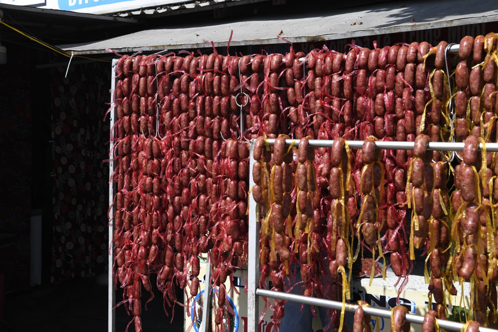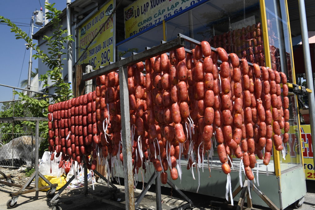 Einen Stopp bei einem der zahlreichen Händler der letztgenannten stachelbewährten Köstlichkeit mit dem gelben Fruchtfleisch lassen wir diesmal aus. Bei den Wurstverkäufern am Ortsrand von Cai lậy bitte ich unseren Fahrer dann aber doch um einen kurzen Halt. Die luftgetrocknete lokale Spezialität sieht ein wenig nach Salami aus, schmeckt allerdings süßlicher.