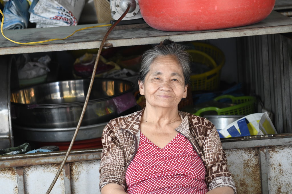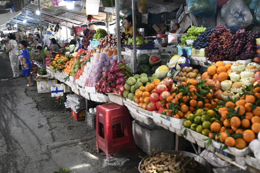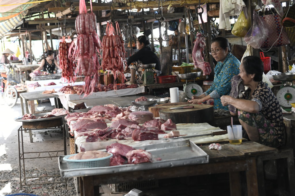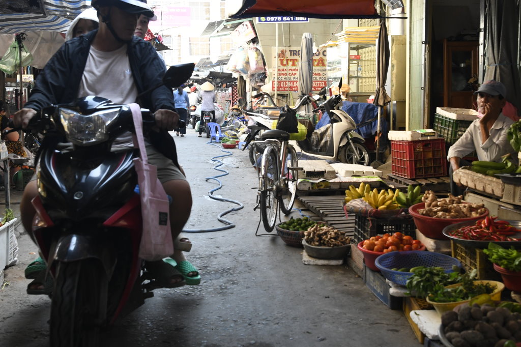 Zwanzig Minuten später erreichen wir Cai Be, wo wir vor zwölf Jahren früh morgens den Schwimmenden Markt besucht haben. Den gibt es heutzutage nicht mehr, er wurde zu Beginn der Corona-Pandemie geschlossen und seither nicht wieder belebt. Als Ersatz für die Händler dient jetzt eine Markthalle am Flussufer. Die Gänge zwischen den Ständen sind etwas breiter als in vielen anderen von uns besuchten Märkten. Da muss man sich nicht wundern, wenn viele Kunden einfach mit dem Moped von einem zum anderen fahren und den auf ein Motiv fixierten deutschen Touristen hupend aus dem Weg scheuchen.