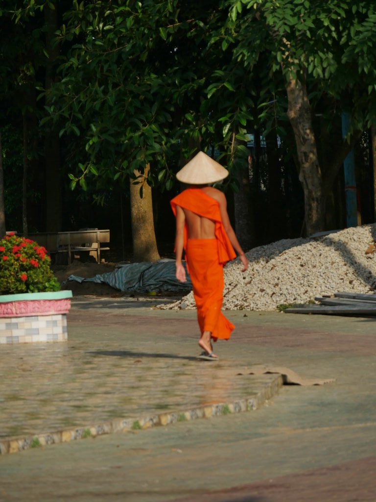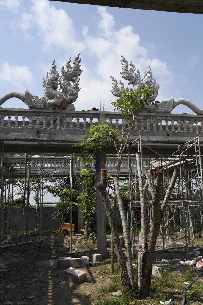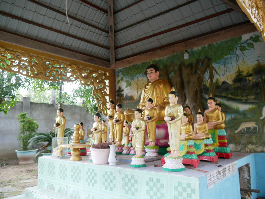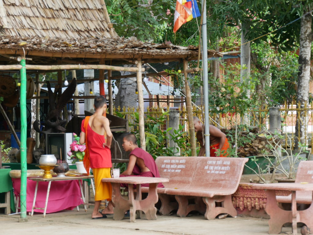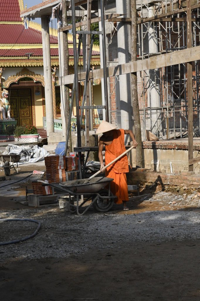 Wir beginnen circa 6 Kilometer südlich von Tra Vinh und besuchen die Hang-Pagode von Chau Thanh, die einen guten Einblick in das Leben der Mönche vermittelt. Ein Teil der Anlage ist noch im Bau. Die Mönche selbst legen Hand an, der Bauleiter betont, er arbeite ohne Bezahlung für ein gutes Karma. Damit keinen der Hitzschlag trifft, spenden die orangenen Prozessionsschirme den nötigen Schatten auf der Baustelle. Die beiden Stachelschweine in einem Käfig hinten bei den Mönchsklausen können froh sein, dass ihr Käfig unter den Bäumen steht.