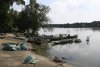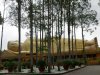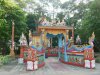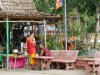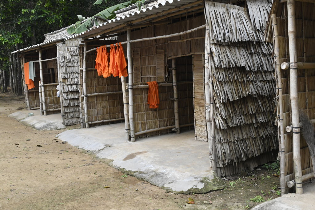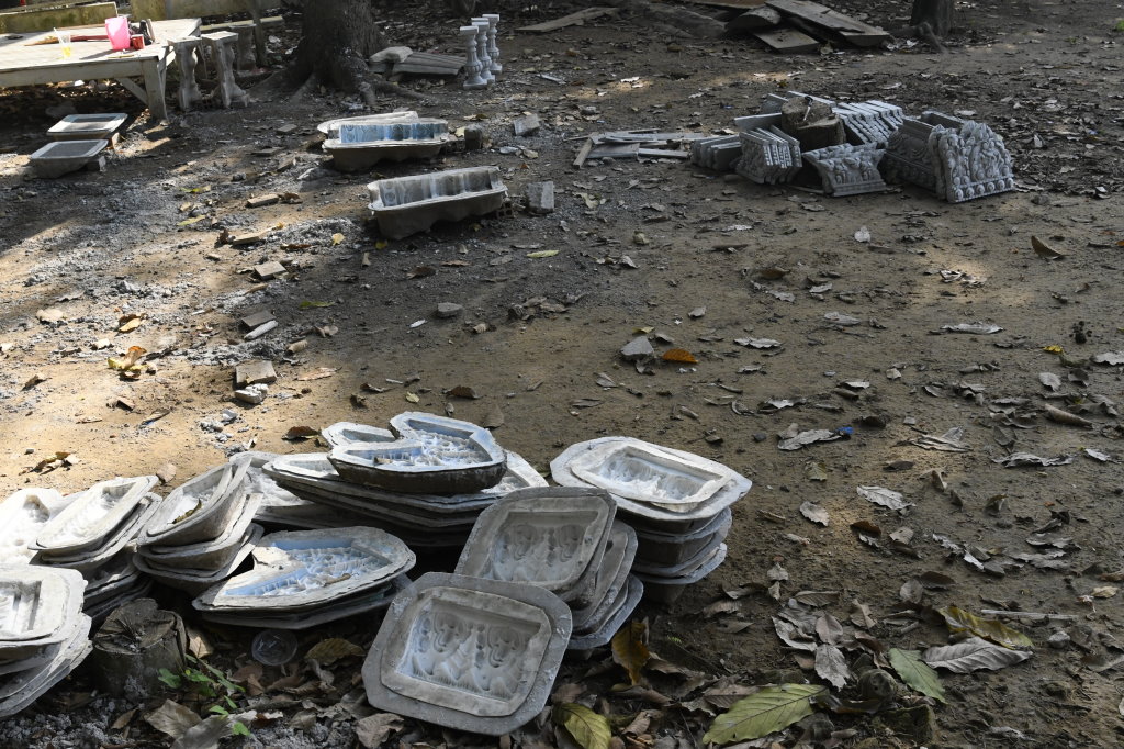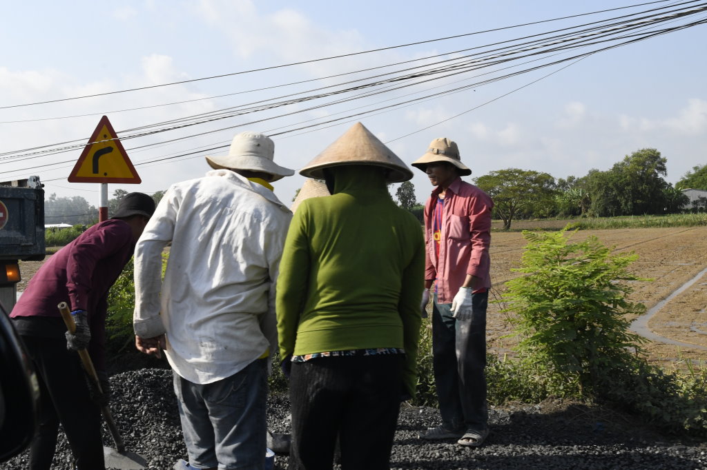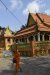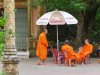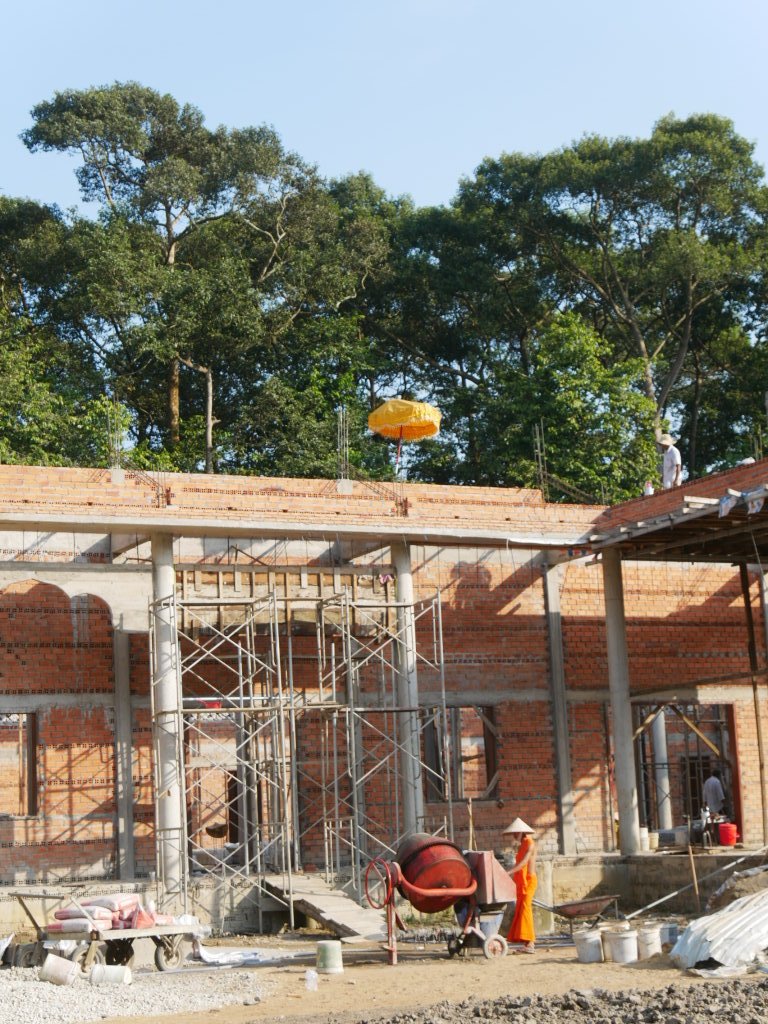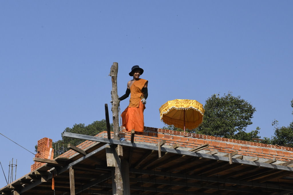 Wir beginnen circa 6 Kilometer südlich von Tra Vinh und besuchen die Hang-Pagode von Chau Thanh, die einen guten Einblick in das Leben der Mönche vermittelt. Ein Teil der Anlage ist noch im Bau. Die Mönche selbst legen Hand an, der Bauleiter betont, er arbeite ohne Bezahlung für ein gutes Karma. Damit keinen der Hitzschlag trifft, spenden die orangenen Prozessionsschirme den nötigen Schatten auf der Baustelle. Die beiden Stachelschweine in einem Käfig hinten bei den Mönchsklausen können froh sein, dass ihr Käfig unter den Bäumen steht.