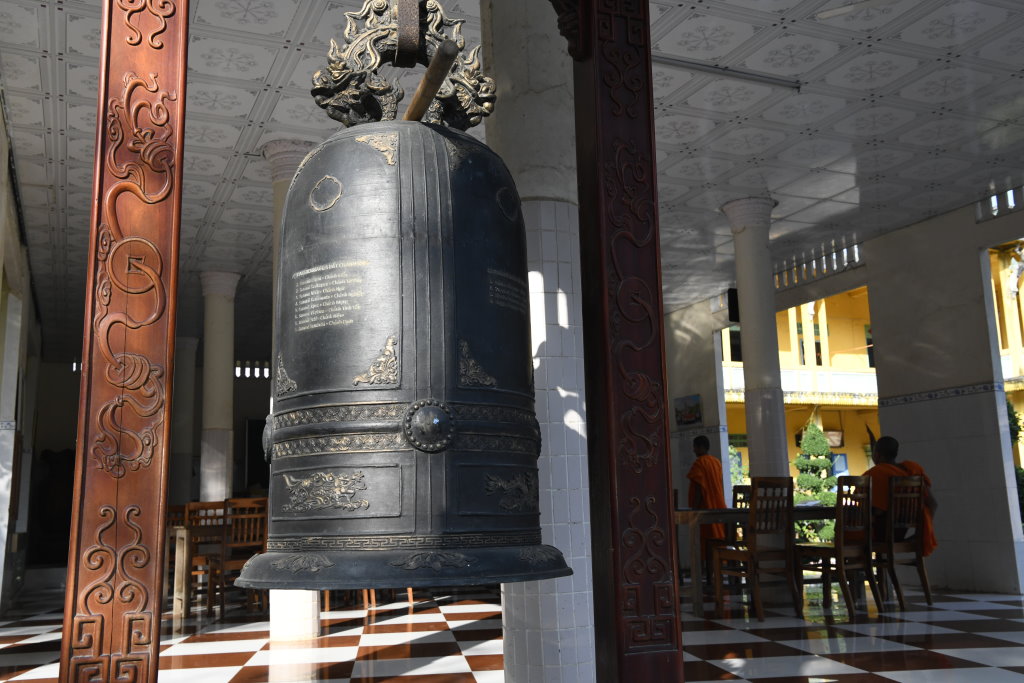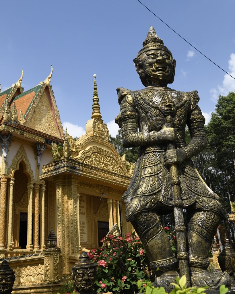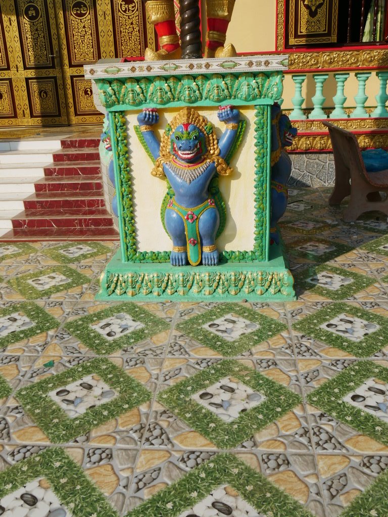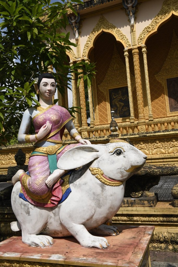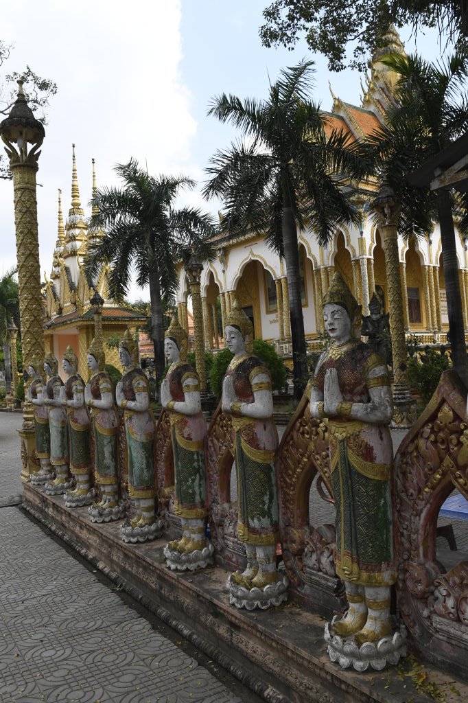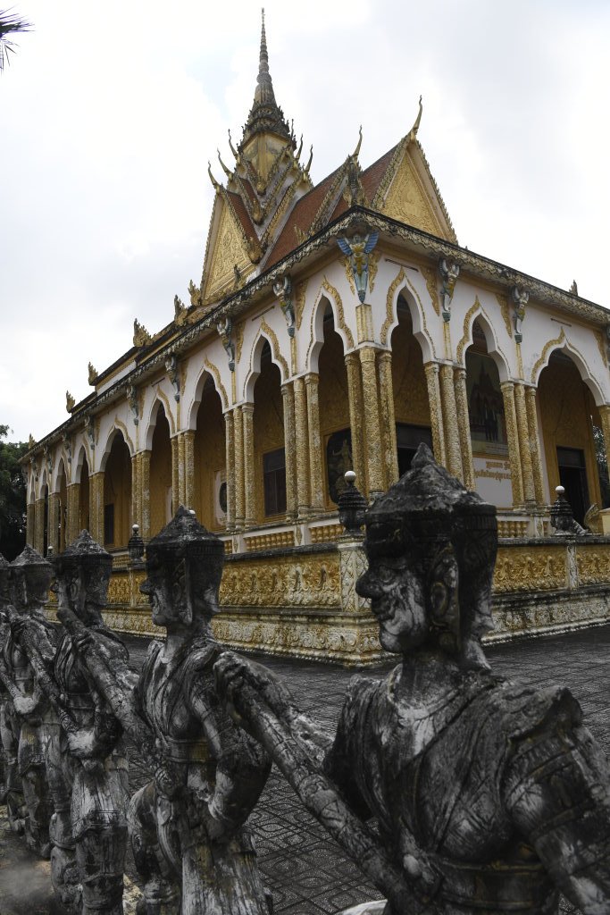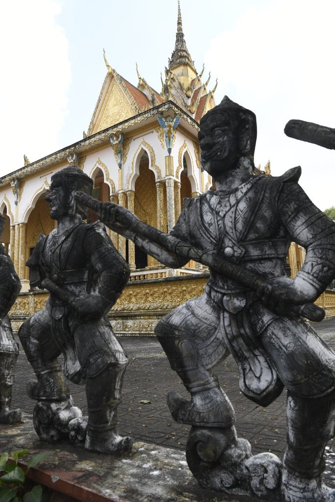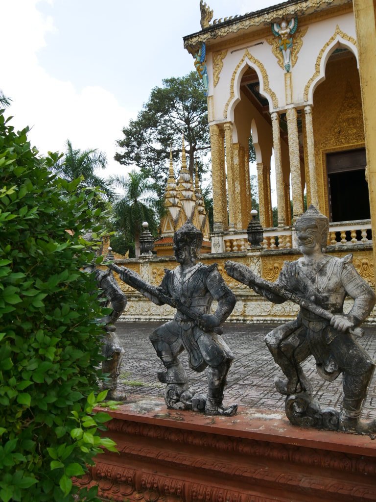 Als wir am späten Vormittag den großen liegenden Buddha des Vam Rai Tempels (Ấp Vàm Ray) im Trà Cú Distrikt erreichen, rufen gerade die großen Trommeln die Mönche zum Essen. Viele der Figuren und Ornamente in dieser Anlage erinnern frappant an Angkor Wat.