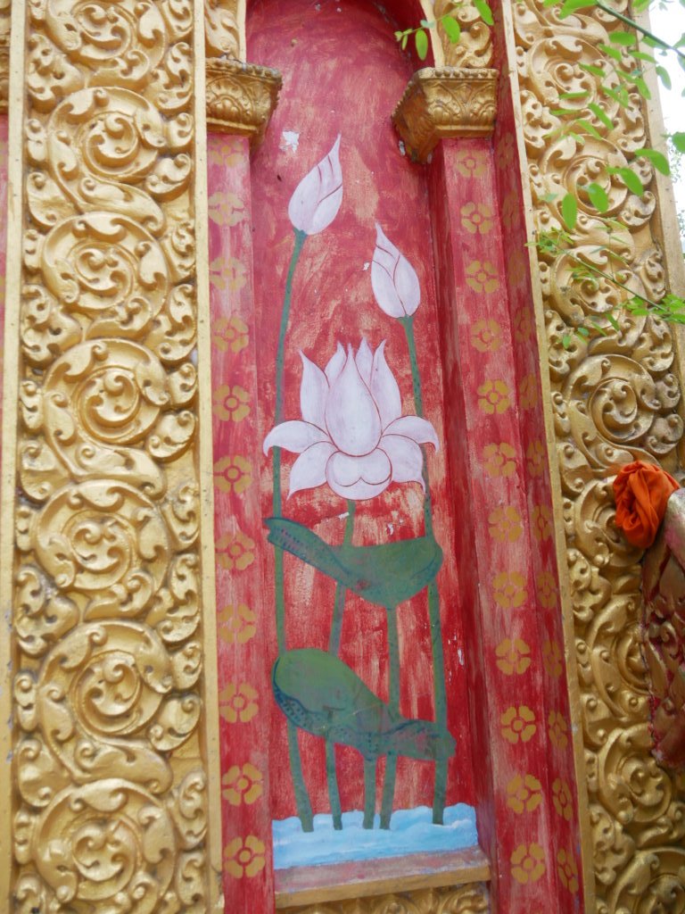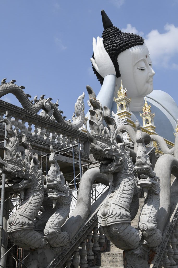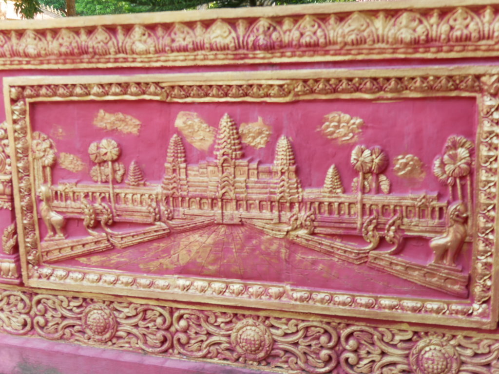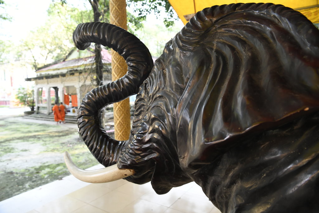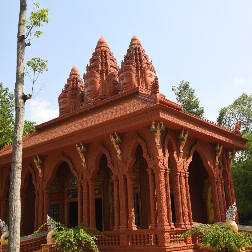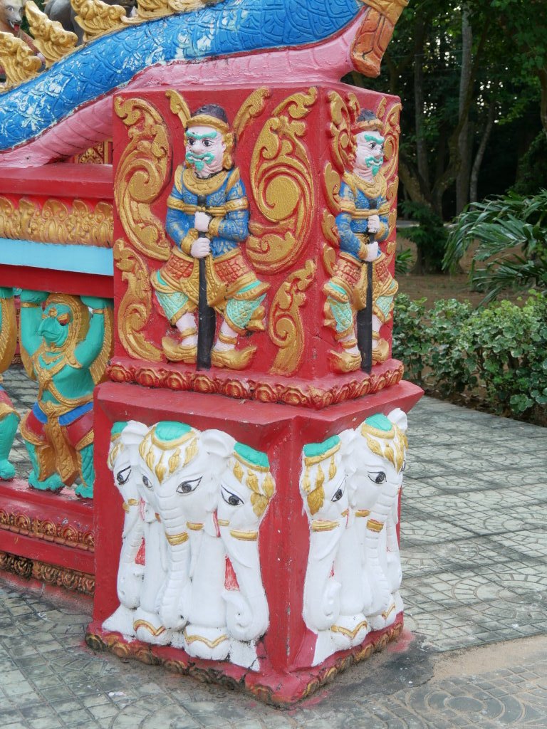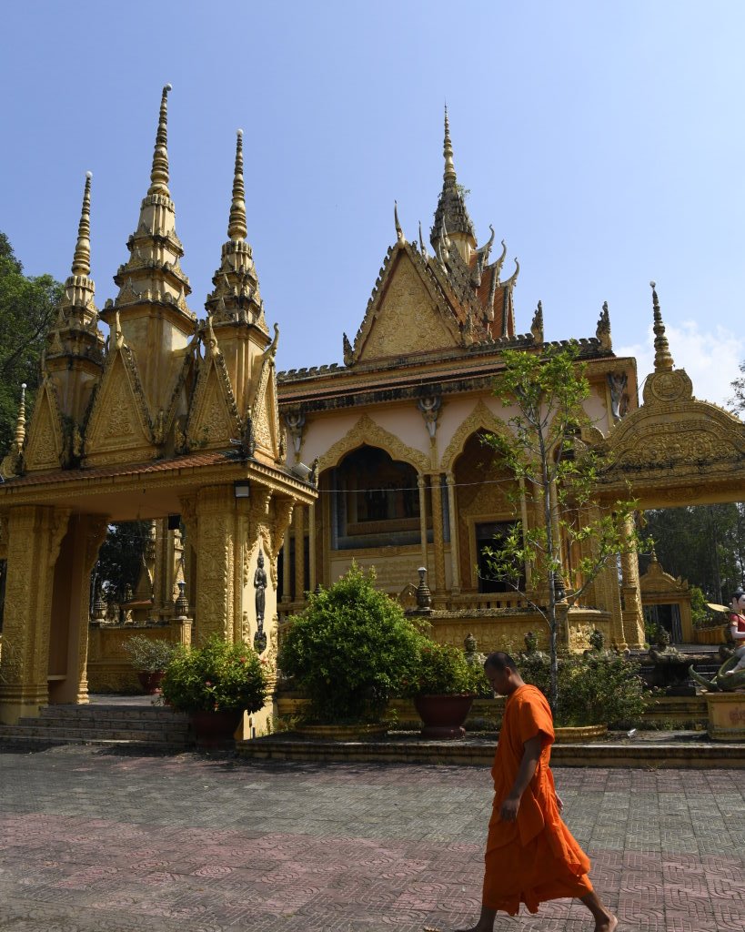 Als wir am späten Vormittag den großen liegenden Buddha des Vam Rai Tempels (Ấp Vàm Ray) im Trà Cú Distrikt erreichen, rufen gerade die großen Trommeln die Mönche zum Essen. Viele der Figuren und Ornamente in dieser Anlage erinnern frappant an Angkor Wat.