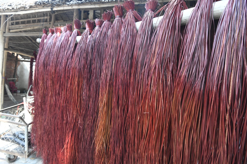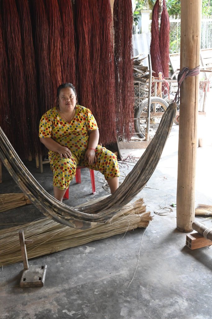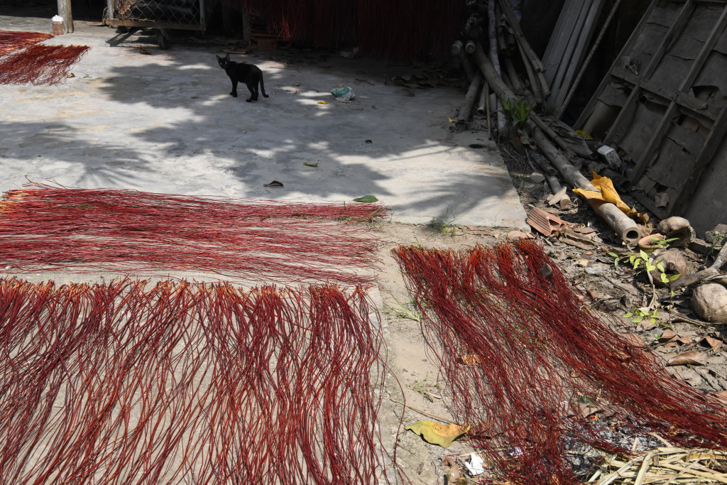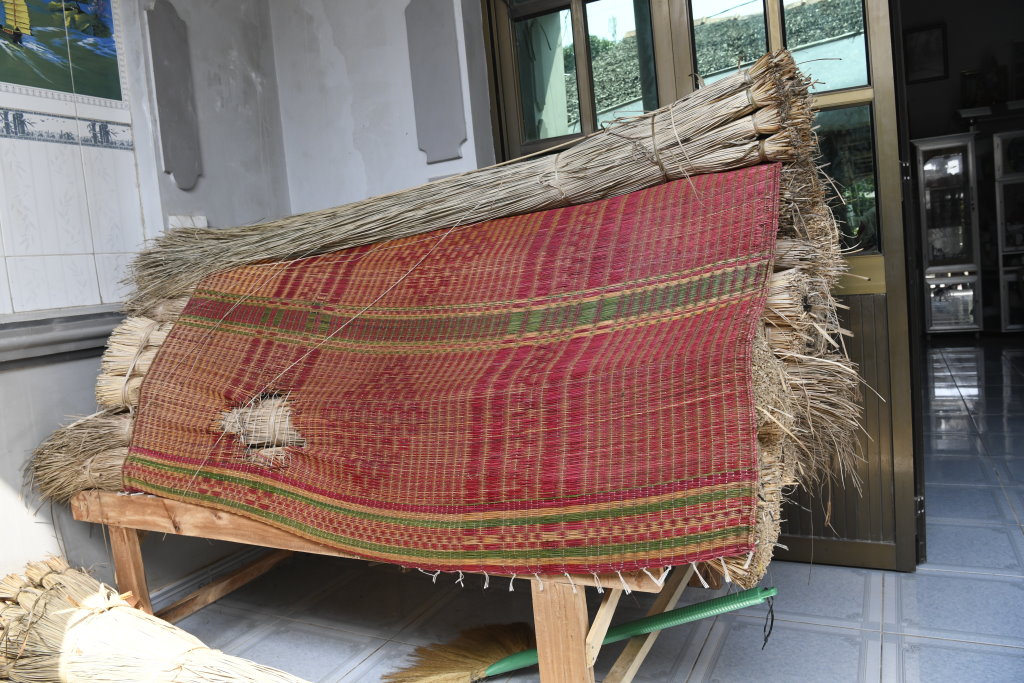 Im Dorf Hàm Tân haben uns die roten, zum Trocknen am Straßenrand ausgelegten Grasfasern neugierig gemacht. Mit ihnen werden Bastmatten geflochten. Das demonstriert uns eine Weberin, die wir um eine Erklärung bitten. Auch hier leistet die Übersetzungs-App von Google wieder einmal gute Dienste.