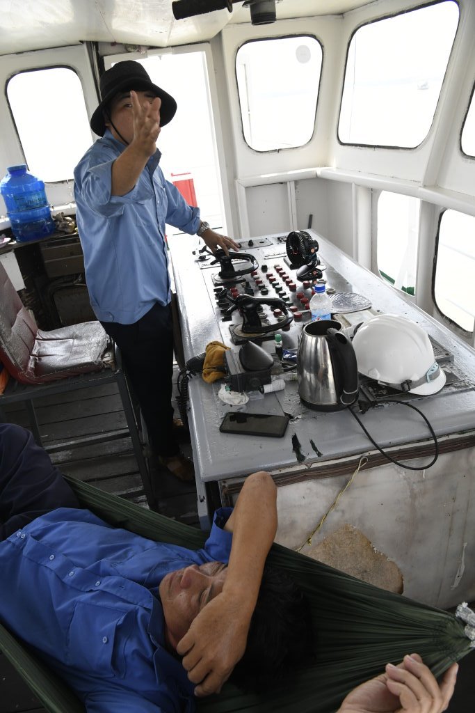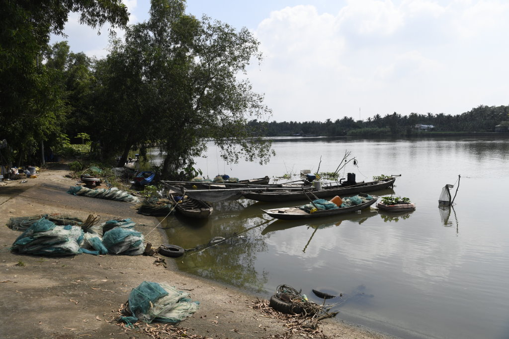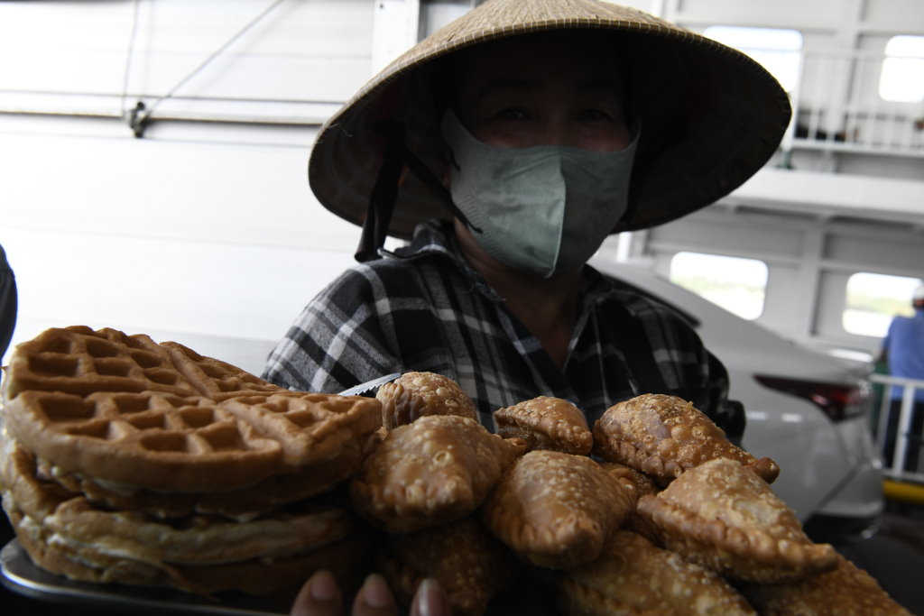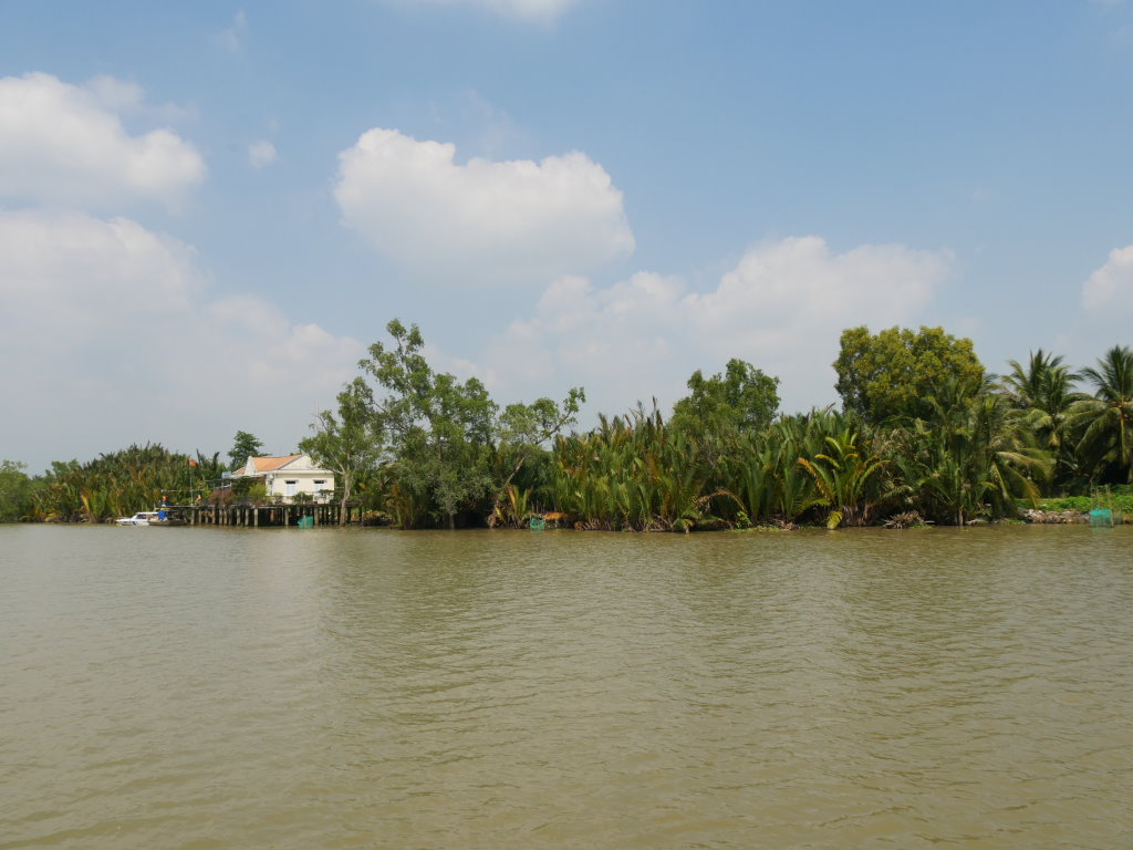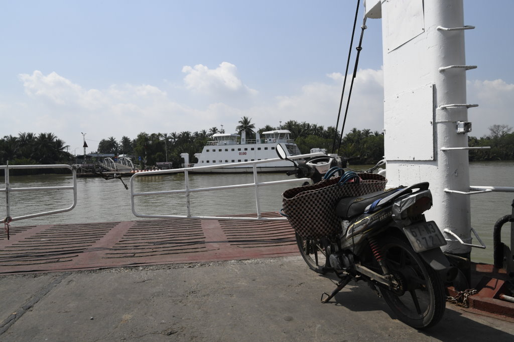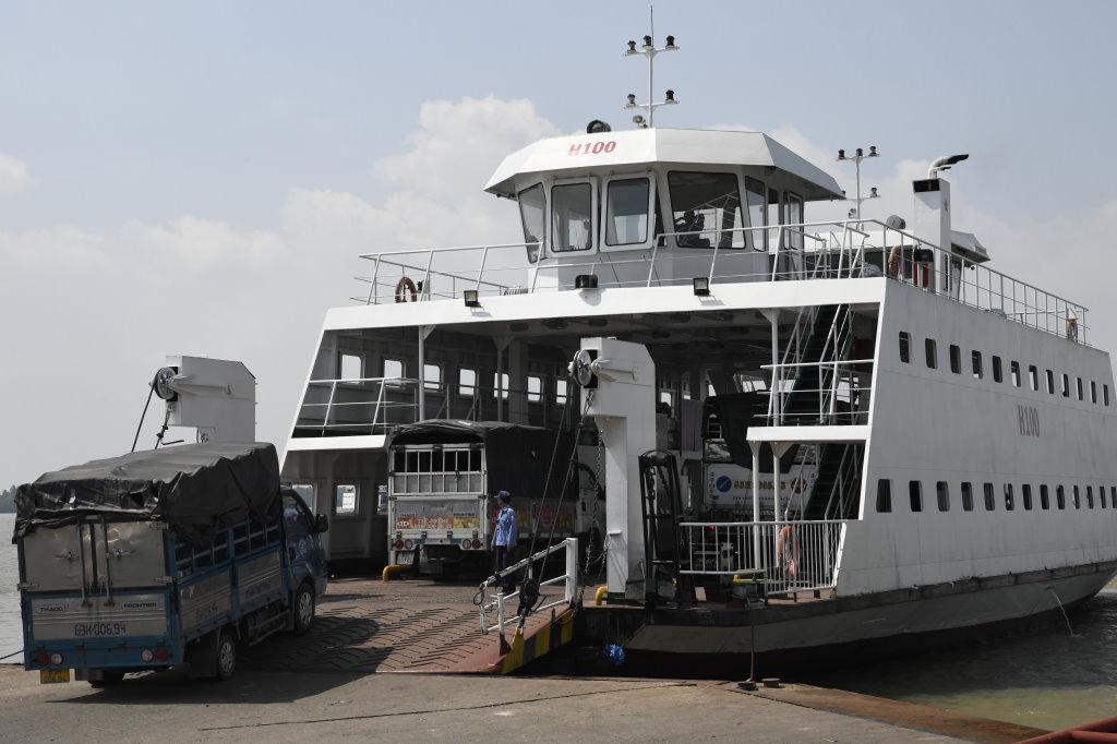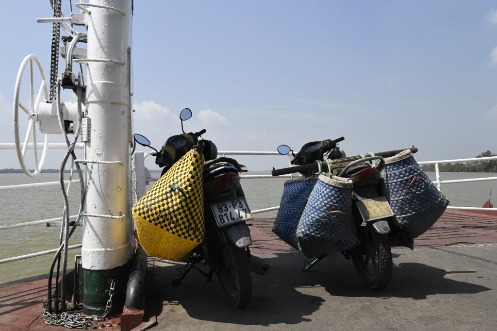 Die Landstraße führt uns jetzt an Kokos-Hainen und Zuckerrohrplantagen entlang des Hau-Flusses und über die Brücke eines Nebenarms bis zur Fähre von Bến phà Đại, die die Provinzen von Tra Vinh und Soc Trang miteinander verbindet, Nacheinander mit zwei Fähren überqueren wir den Cổ Chiên River (vietnamesisch Sông Cổ Chiên).