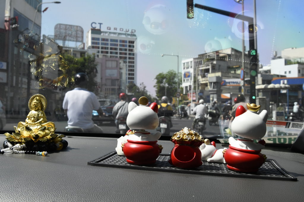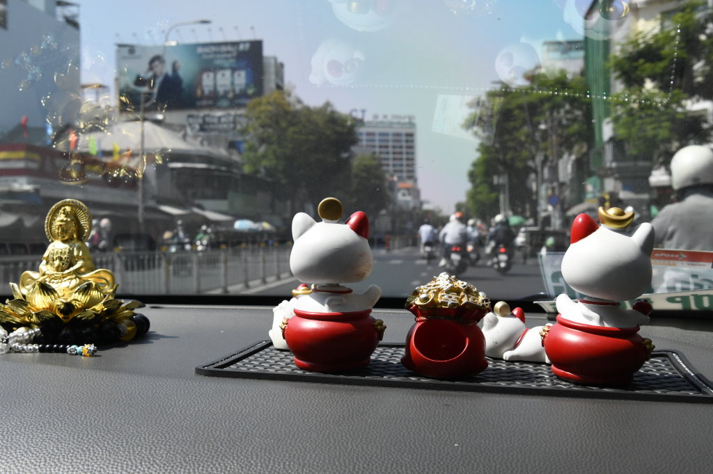 Neben dem in sich ruhenden Buddha nicken zwei niedliche japanische Glückskatzen auf dem Armaturenbrett. Wir sind auf dem Weg zum Flughafen Tan-Son-Nhat von Ho-Chi-Minh-Stadt. Kurz vor Sonnenuntergang ist es soweit und mit 20-minütiger Verspätung starten wir unsere Heimreise: Erstes Zwischenziel Bangkok.
